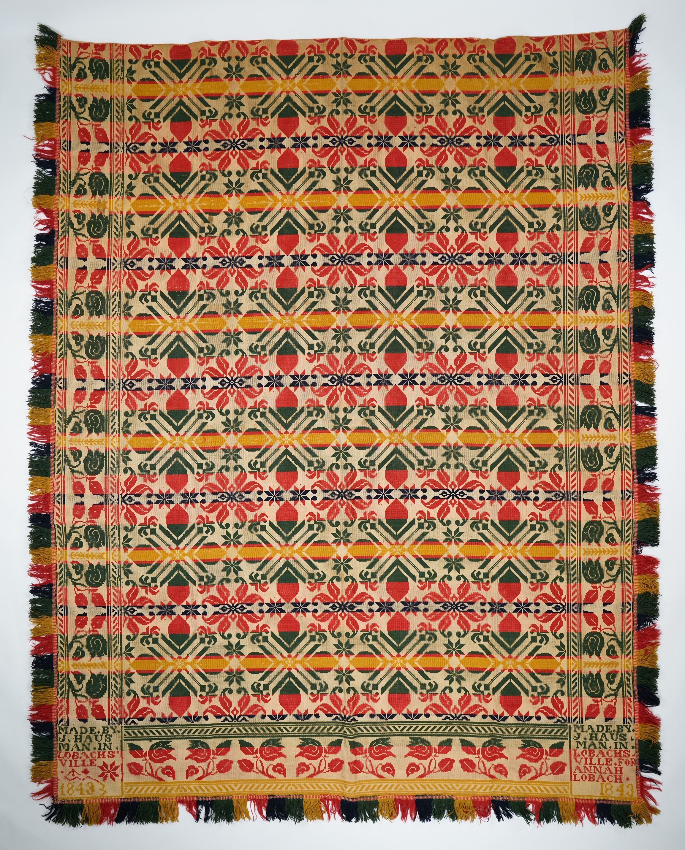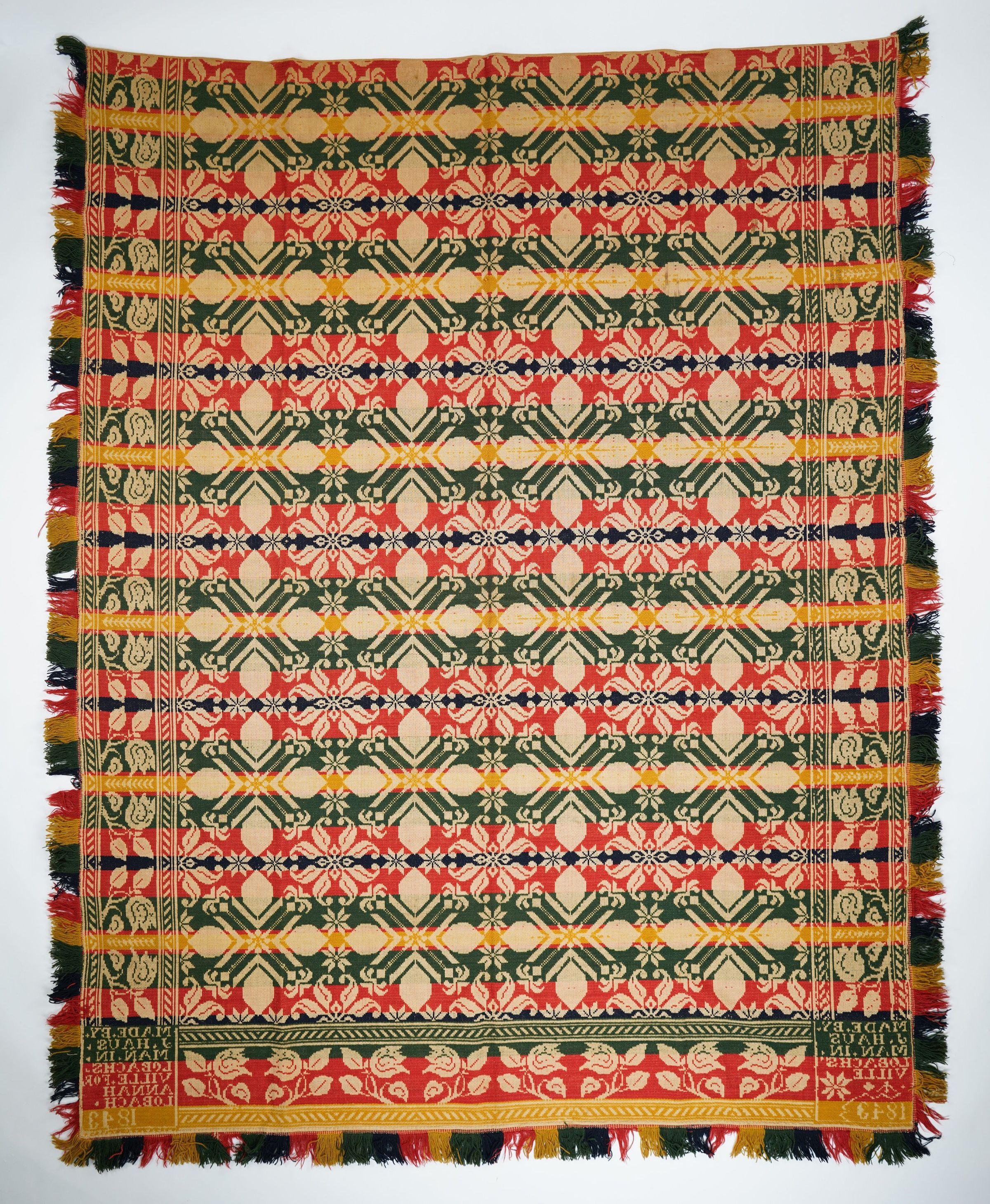 Red, navy, green, yellow figured tied Beiderwand coverlet; seamless; floral border and applied fringe on three sides; geometric medallion centerfield pattern.Collection