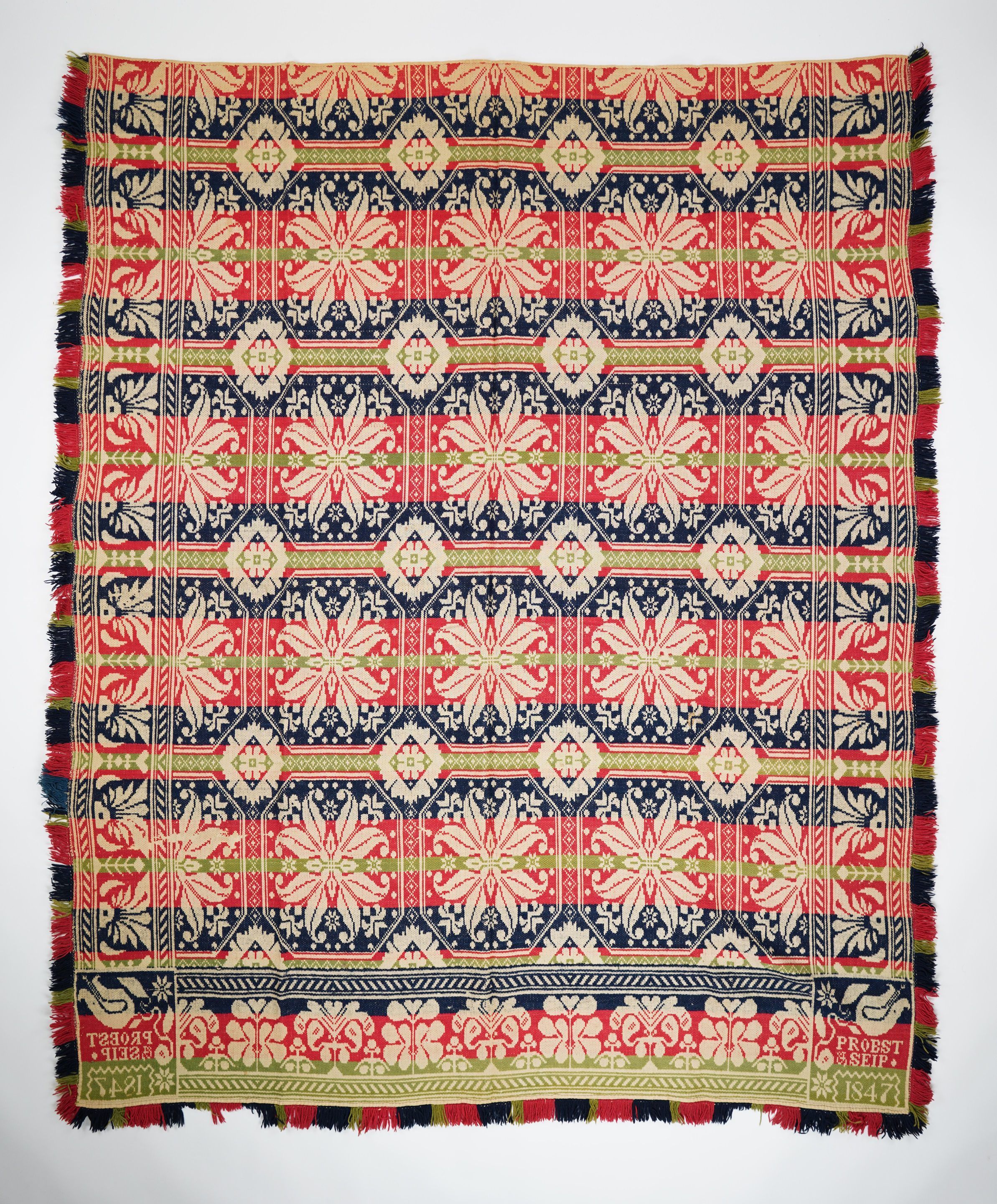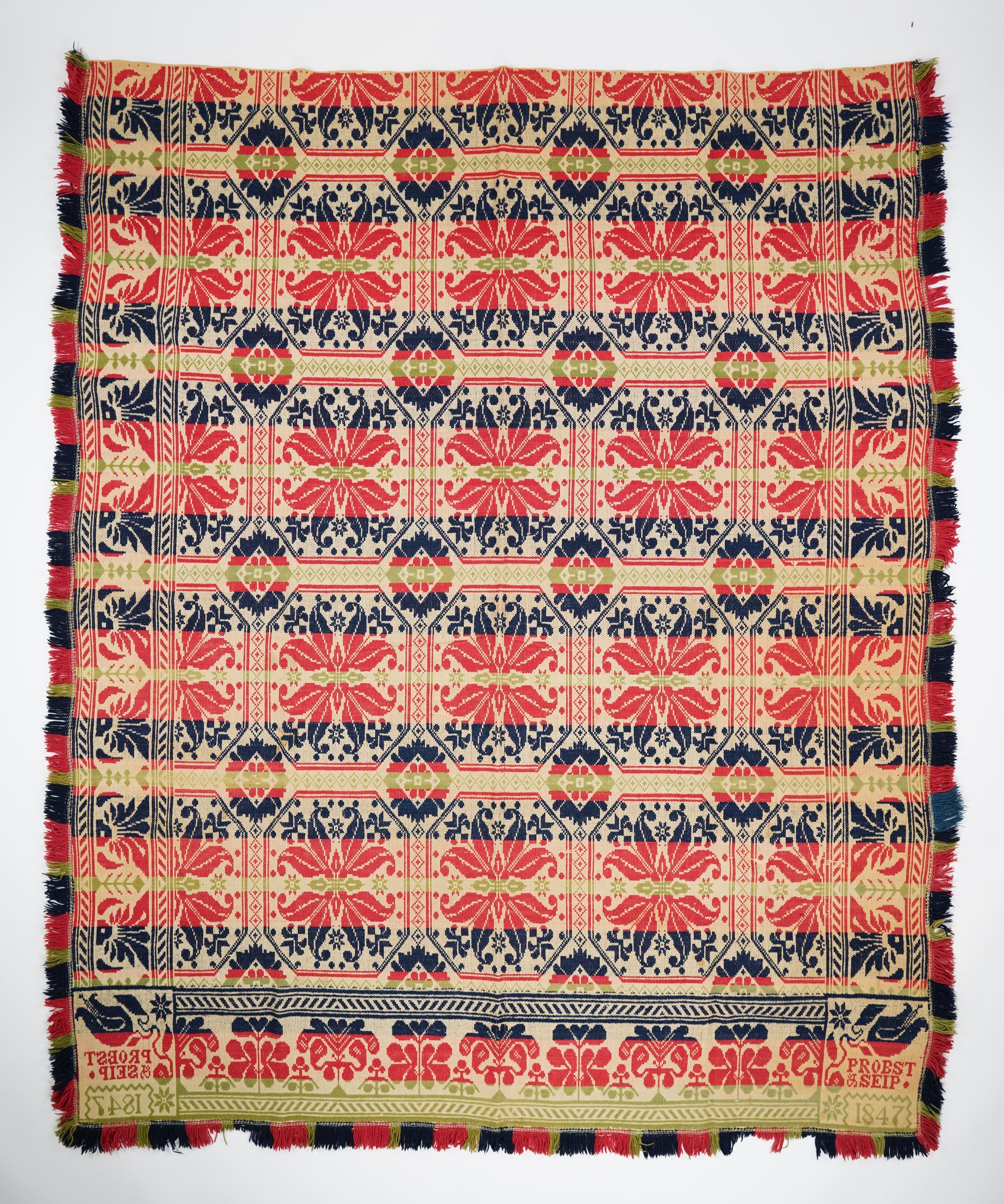 Red, navy, green figured tied Beiderwand coverlet; seamless; applied fringe on three sides; abstract floral border on three sides; curling leaf octagonal medallion in a grid centerfield pattern.Collection