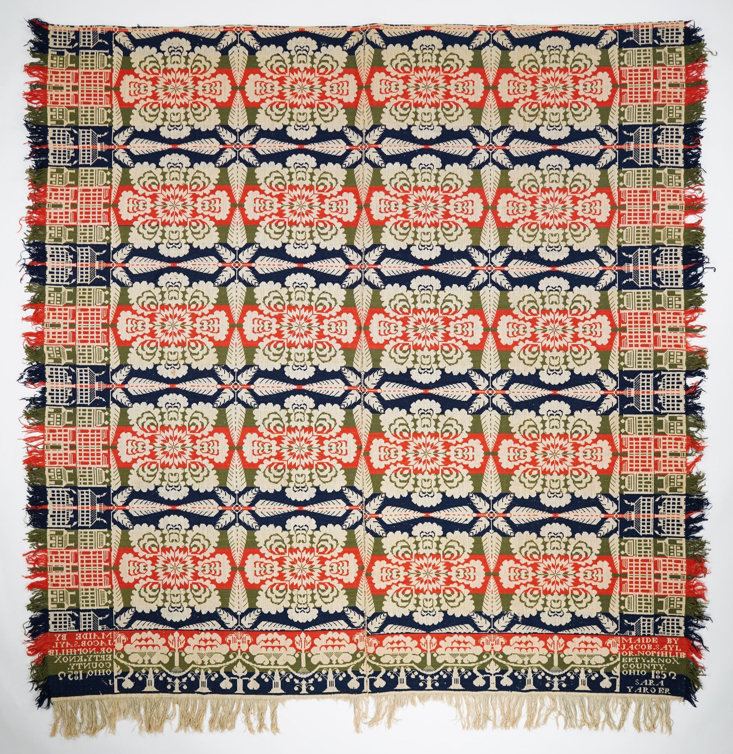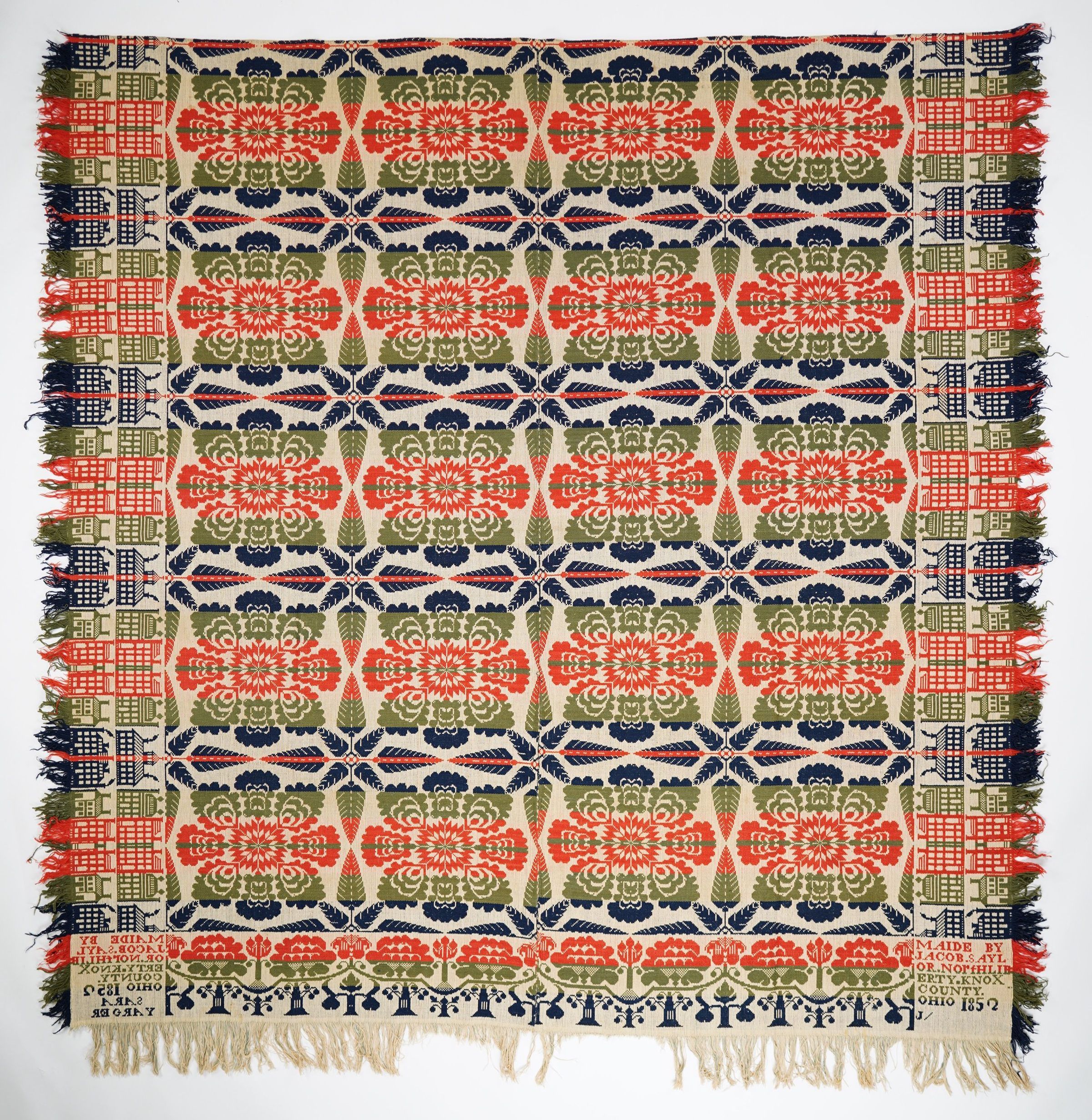 Jacob Saylor (born c. 1803) wove coverlets in Ohio from 1844 to 1859, first in Stark, then in Knox, then in Pickaway County. Several of his coverlets dated 1851 to 1852, including this one, read “J/” in the bottom left corner. The meaning of this inscription is unclear.Collection