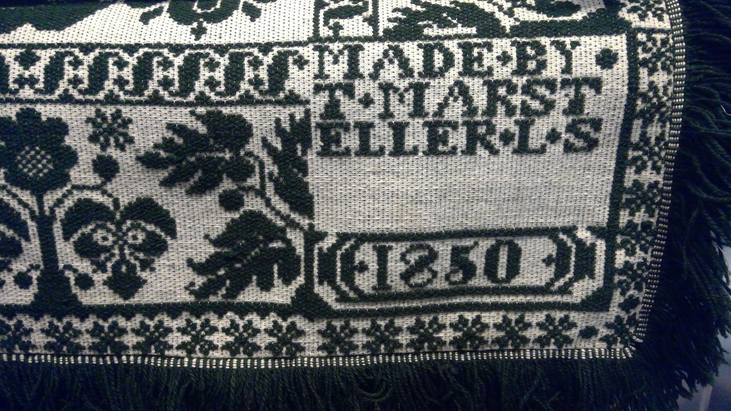 Dark green on natural background with flowers, leaves and trees. Inner circle floral centerfield with decorative border. Binderwand, fringe on three sides, floral border on three sides. Temporarily repaired 3.5 inch tear on lower left fringe, small brown stains throughout on front/back middle, front bottom middle, and back lower right.Collection