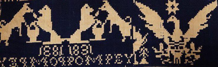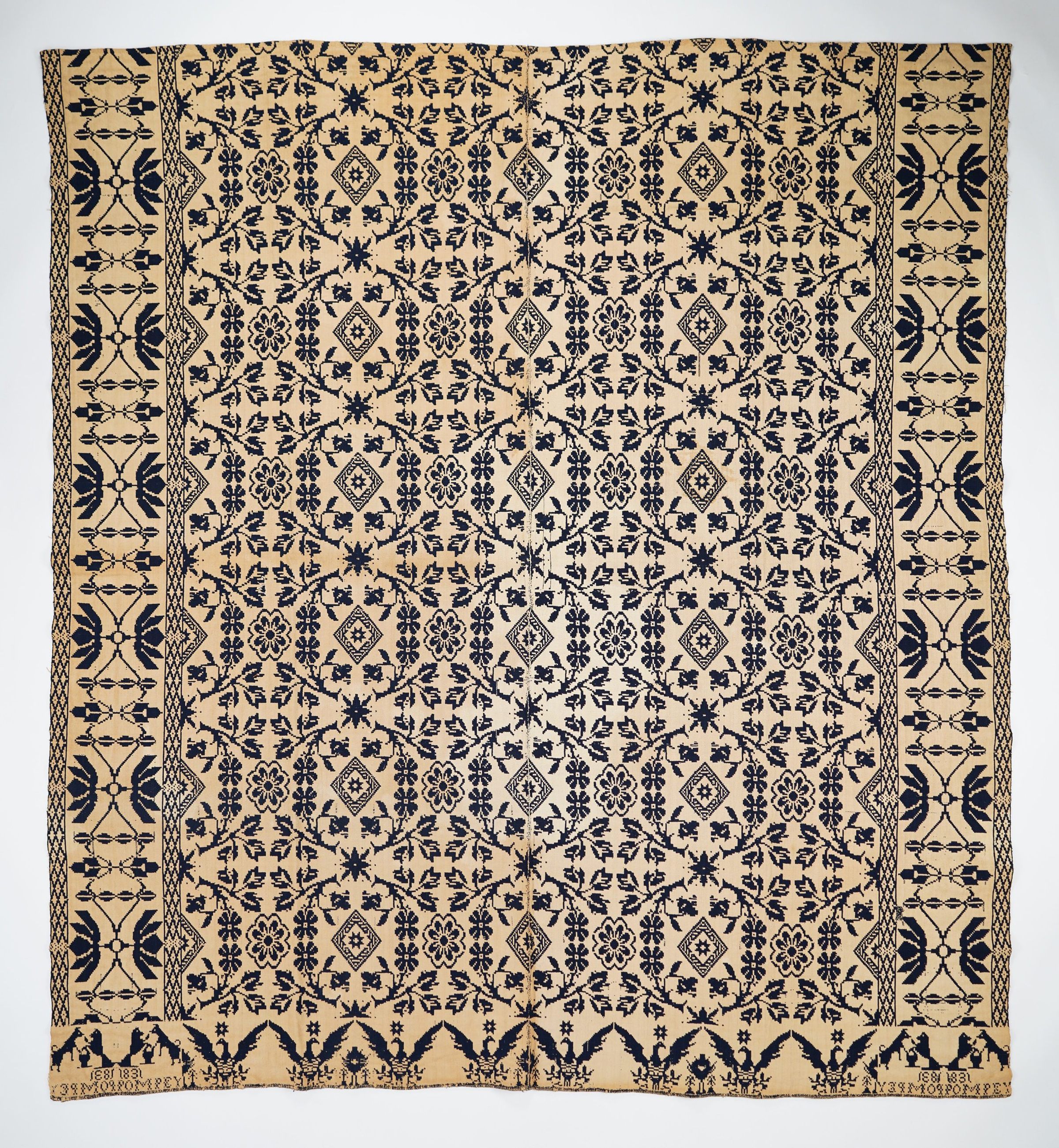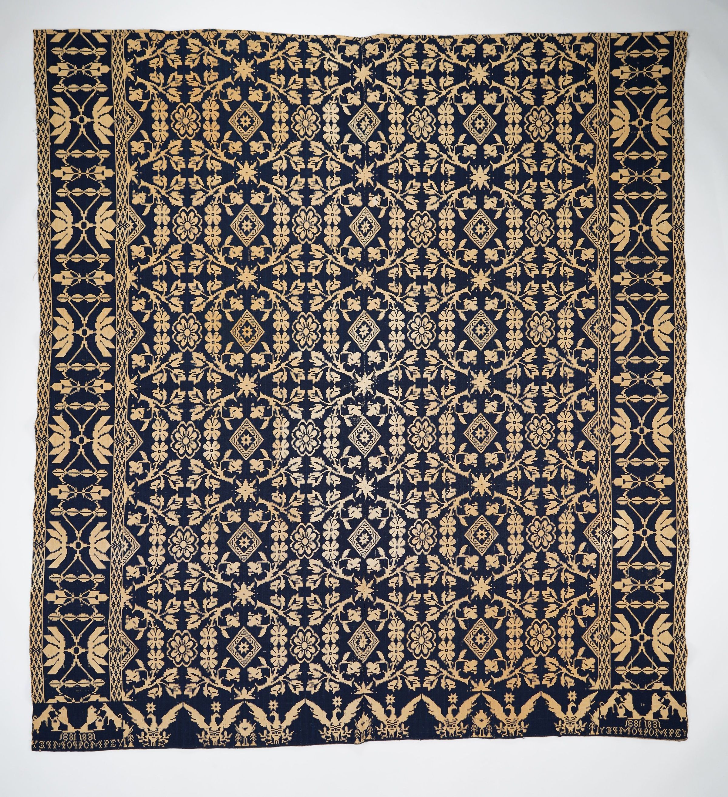 Navy and natural double weave coverlet; two panels joined by a center seam; abstract border on sides; eagle border on bottom; no fringe; floral center pattern repeats 4 times.Collection
