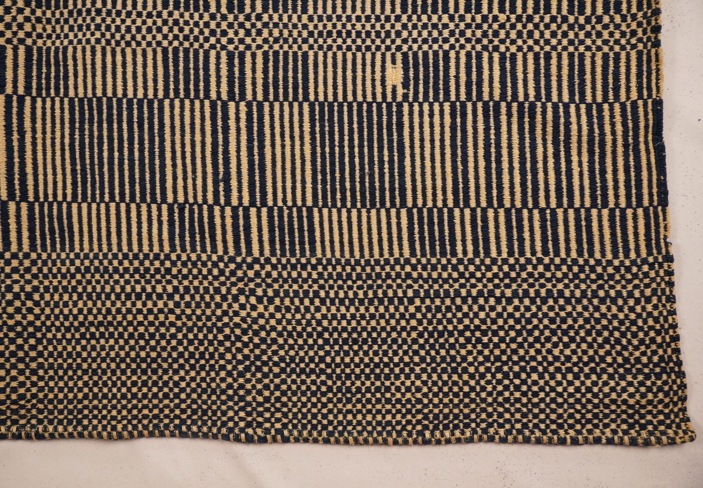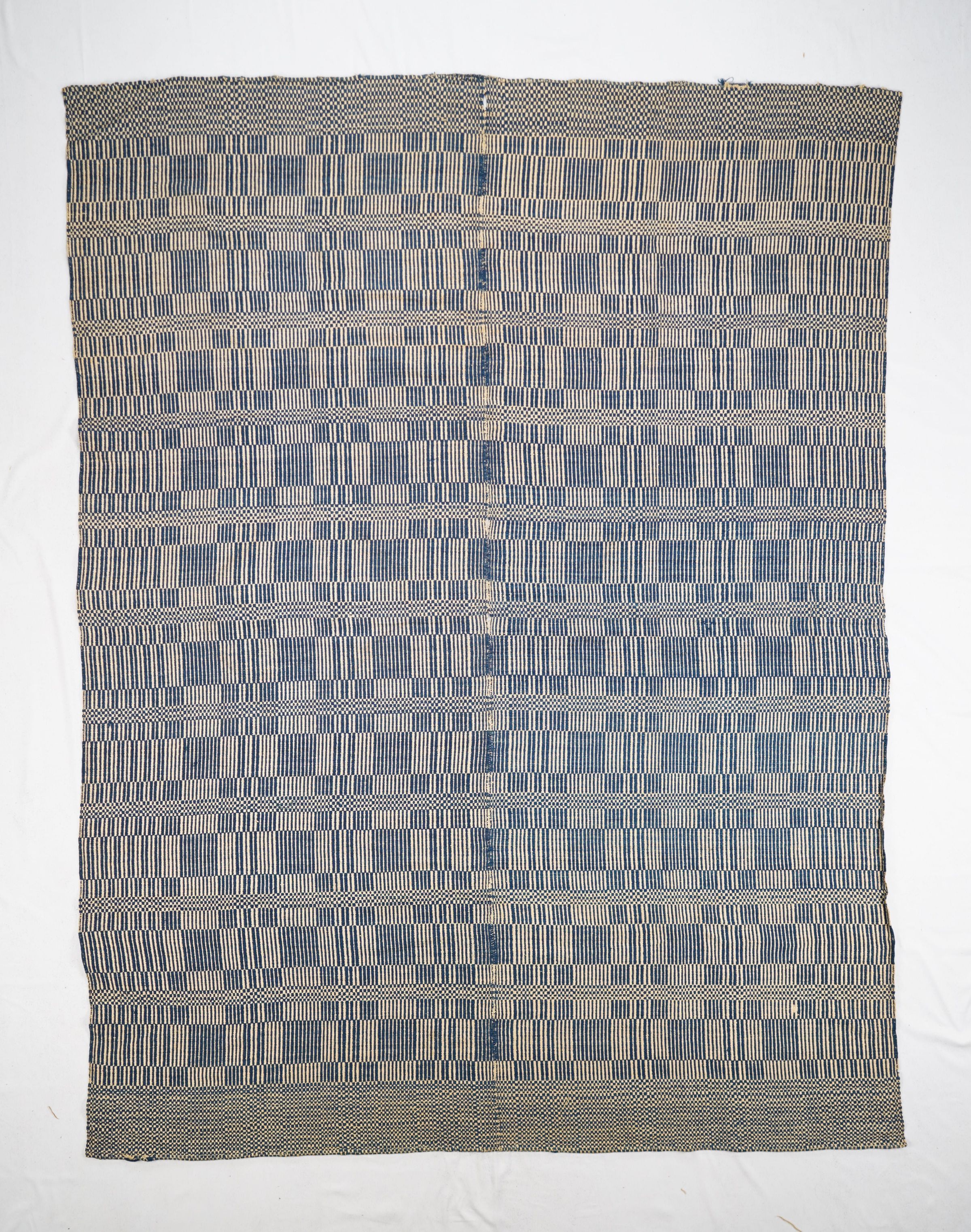 Natural and navy geometric weft-faced coverlet; two panels joined by a center seam. Border on four sides; no fringe.