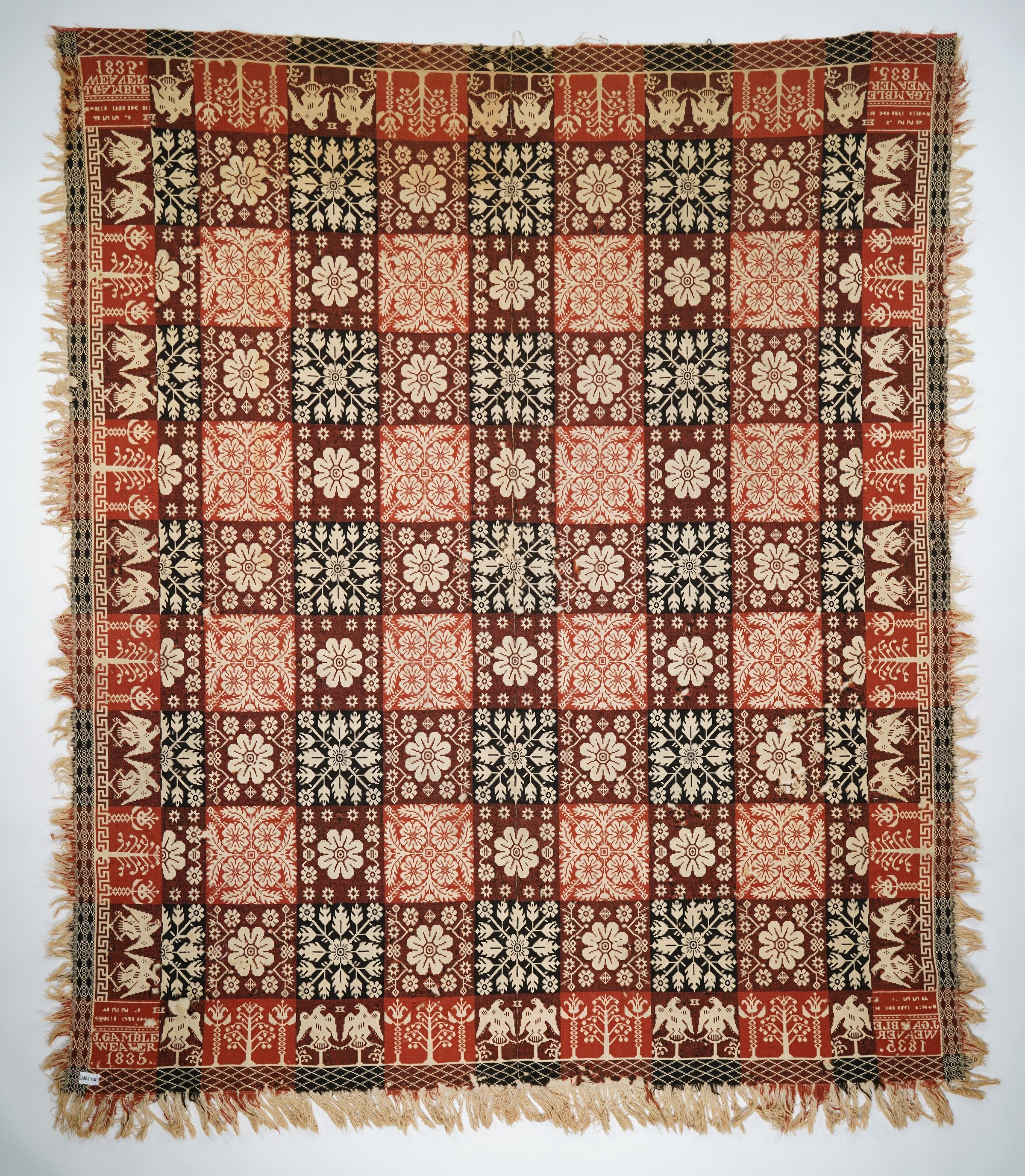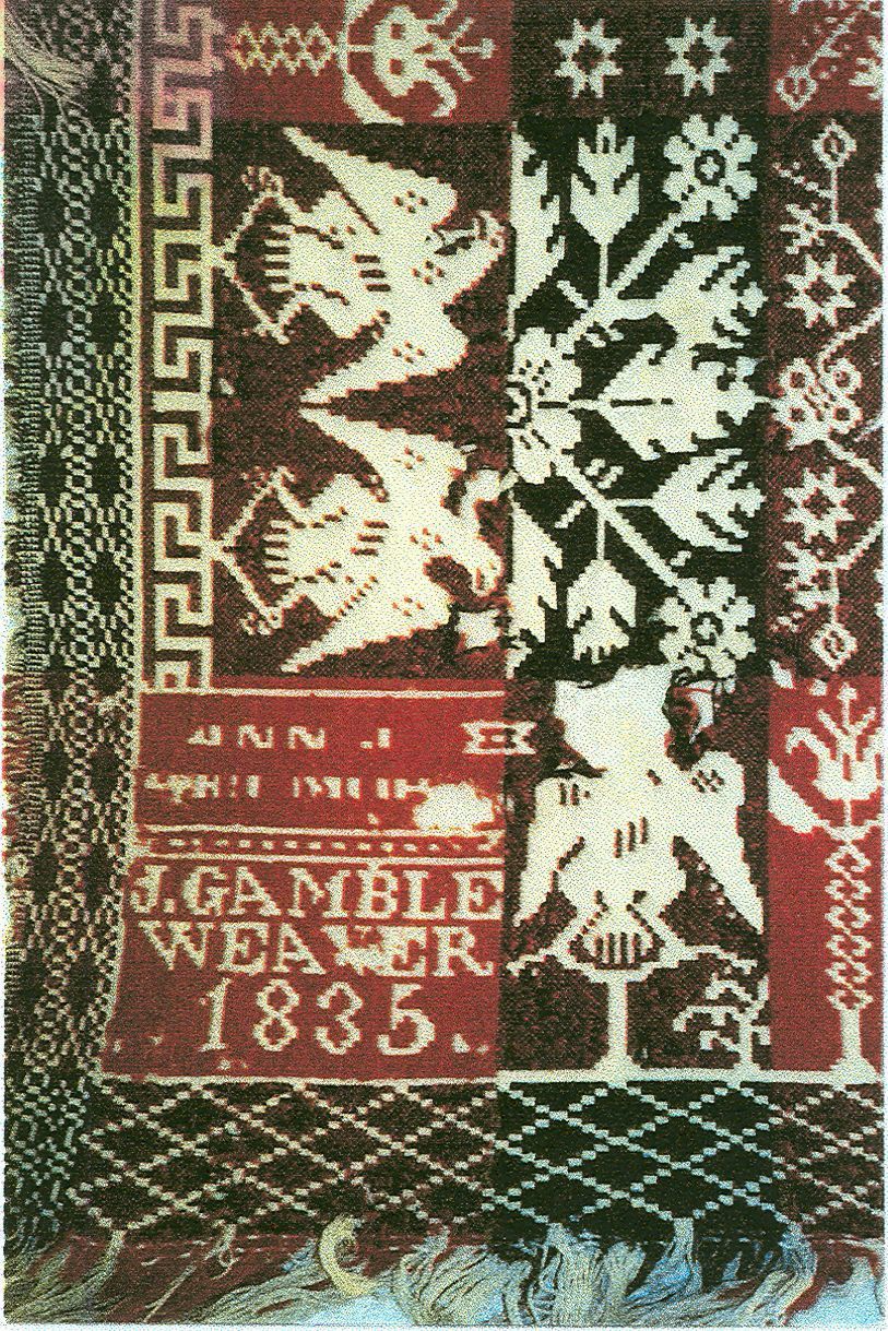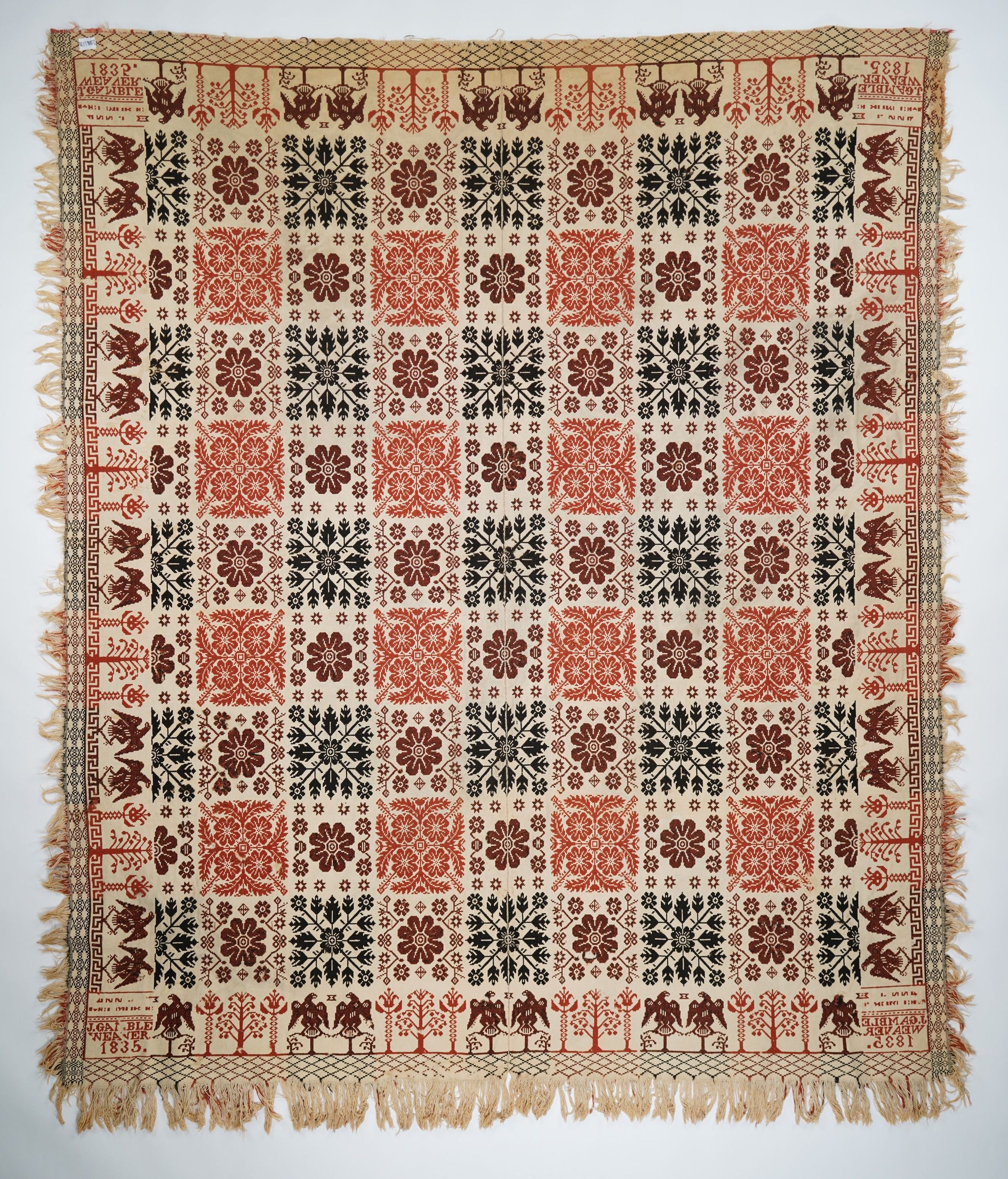 Double wove style in navy, orange, and natural; two loom widths joined, fringe on three sides; centerfield consists of alternating bands of: double flower and rosette and a flower and snowflake design; border has alternating double eagles and a flower/tree pattern with a Greek Key design at base; four cooner blocks with inscriptionCollection