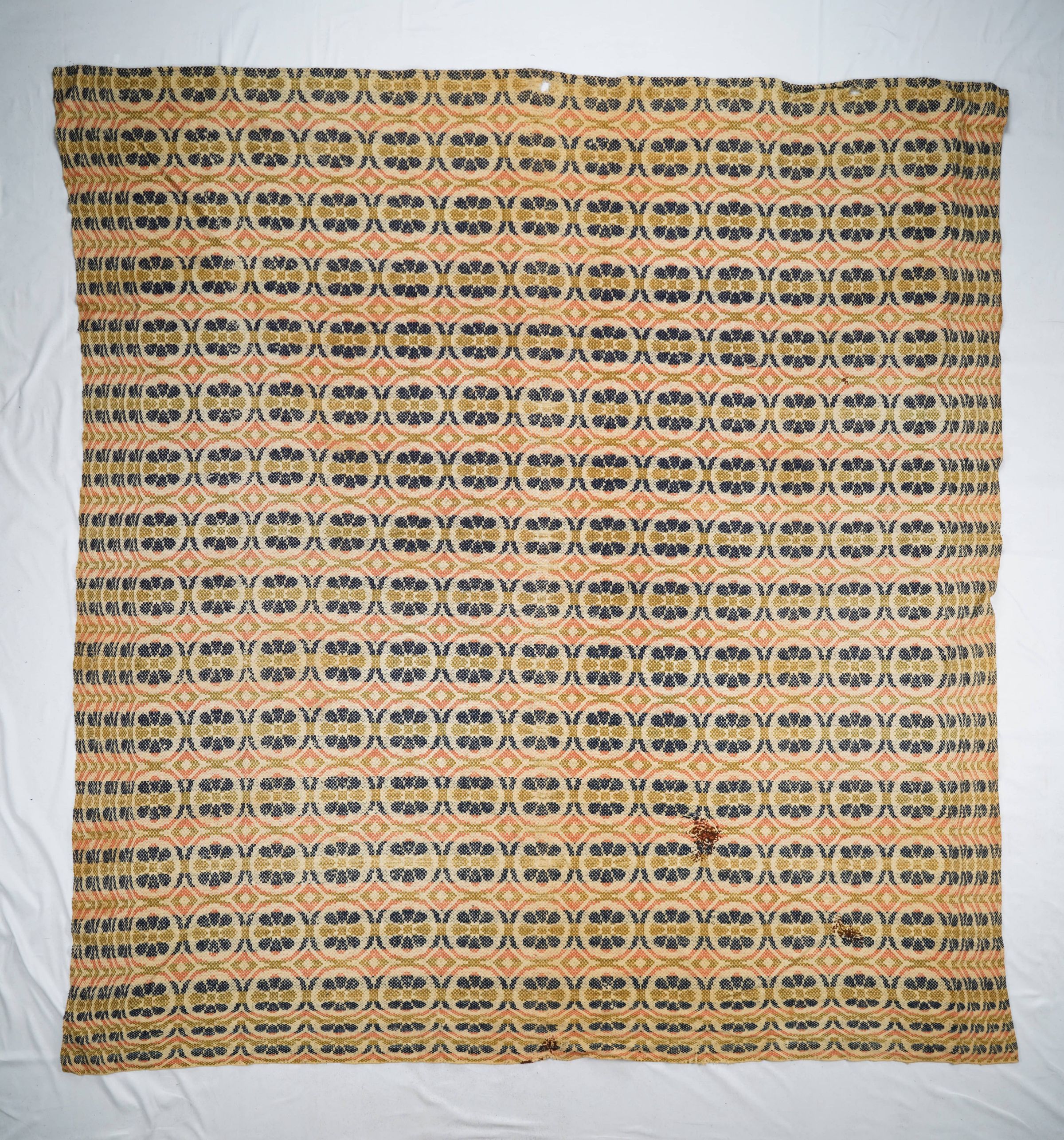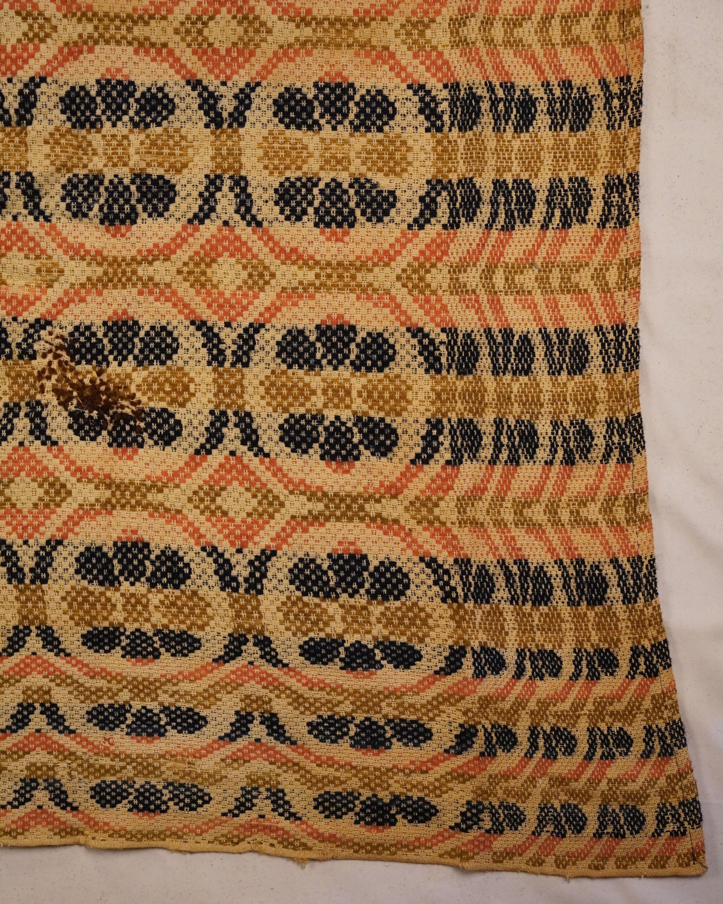 Natural, pink, olive, and navy figured starwork coverlet; seamless. Border on four sides. No fringe.