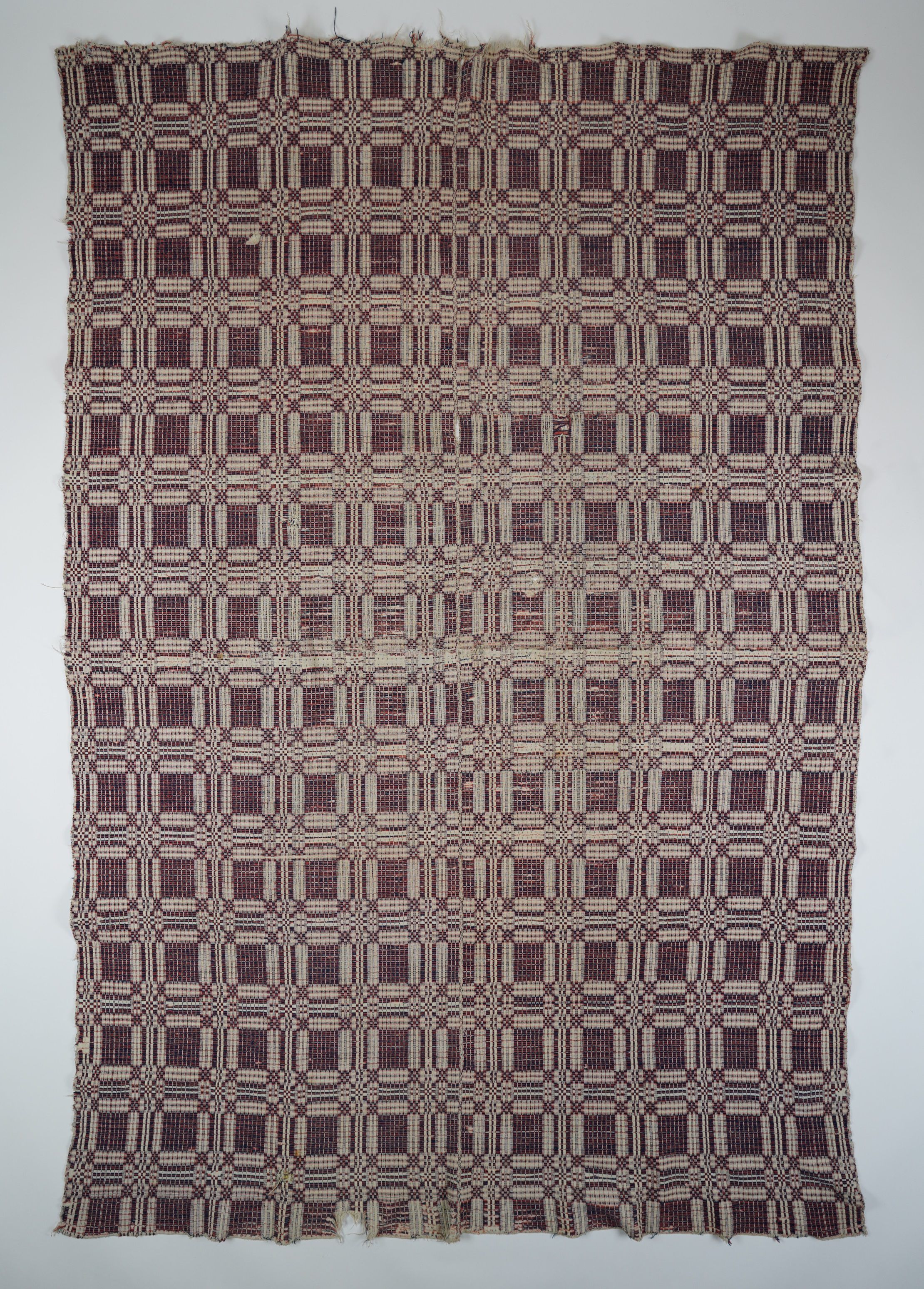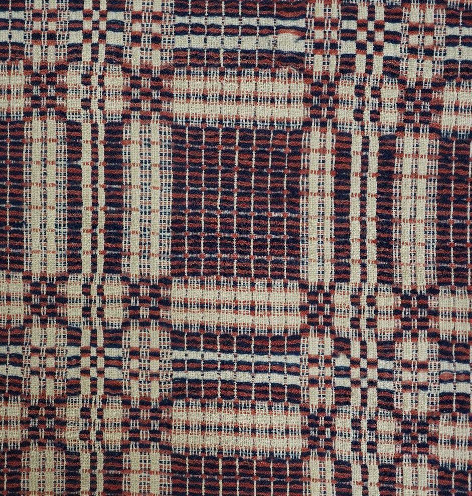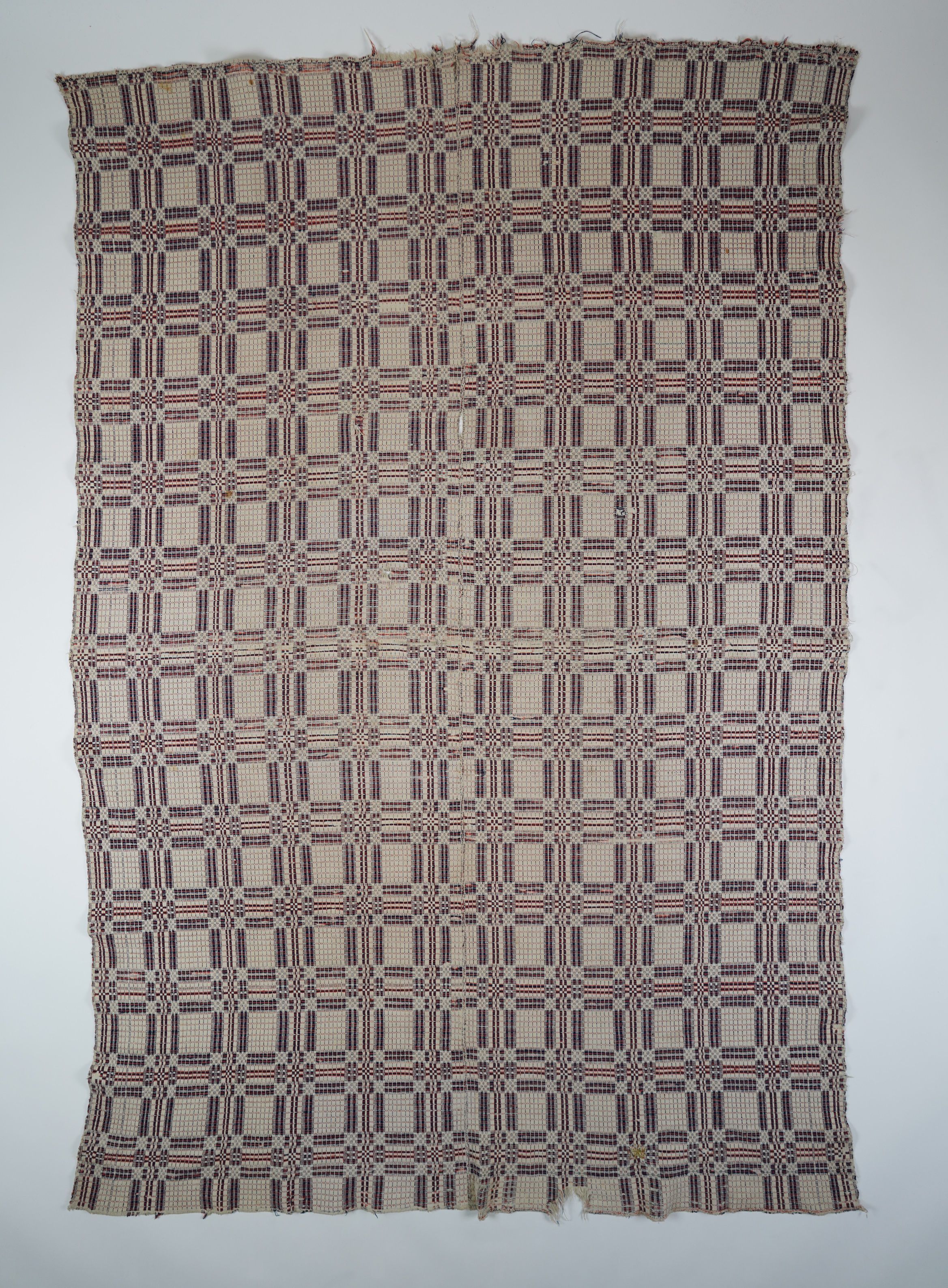 Overshot coverlet. Red & blue wool, undyed cotton. Condition is worn and mended. Believed to be passed down from Kennedy family originating in Bradford County, PA.