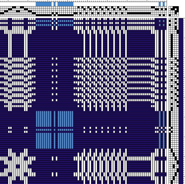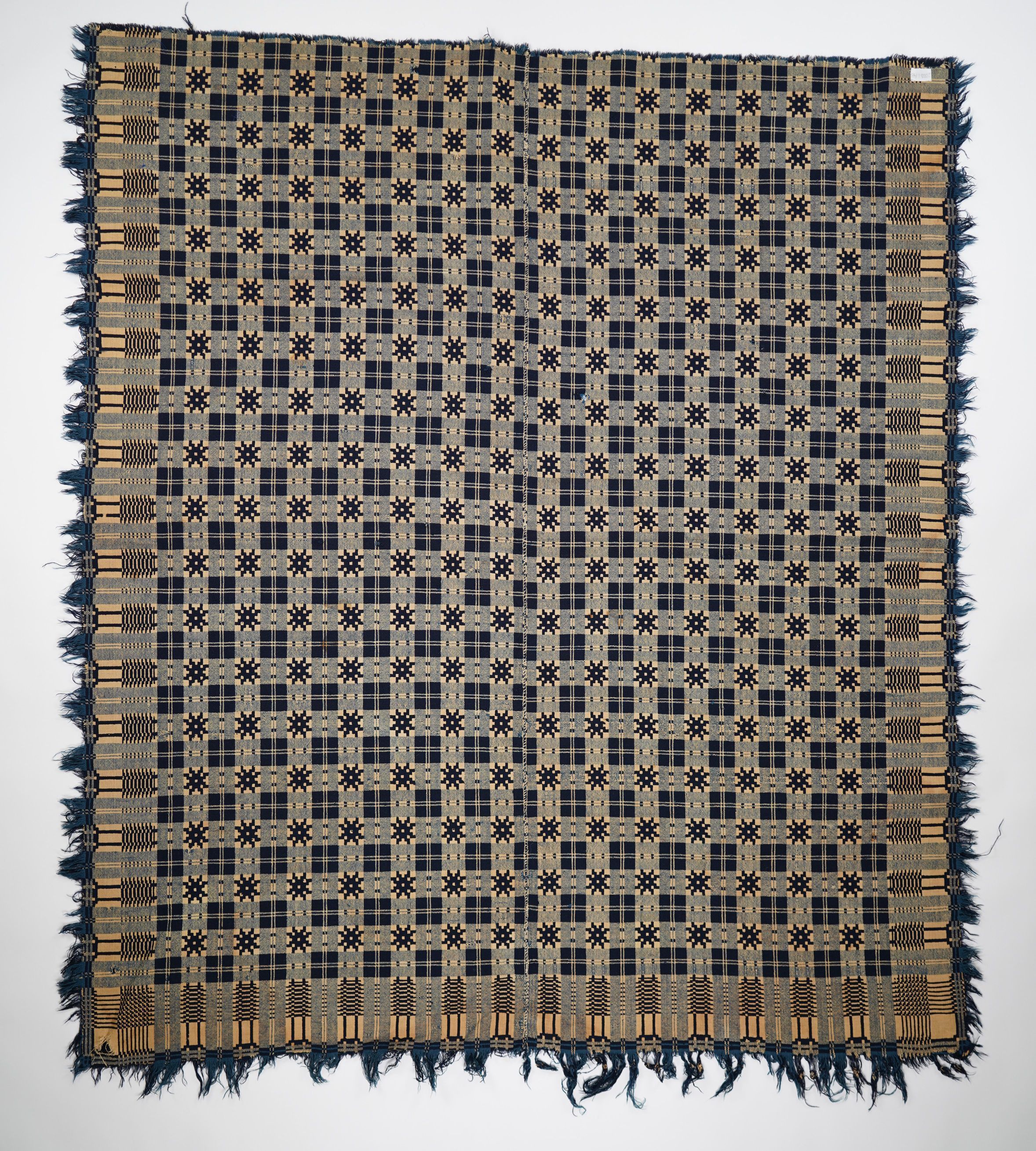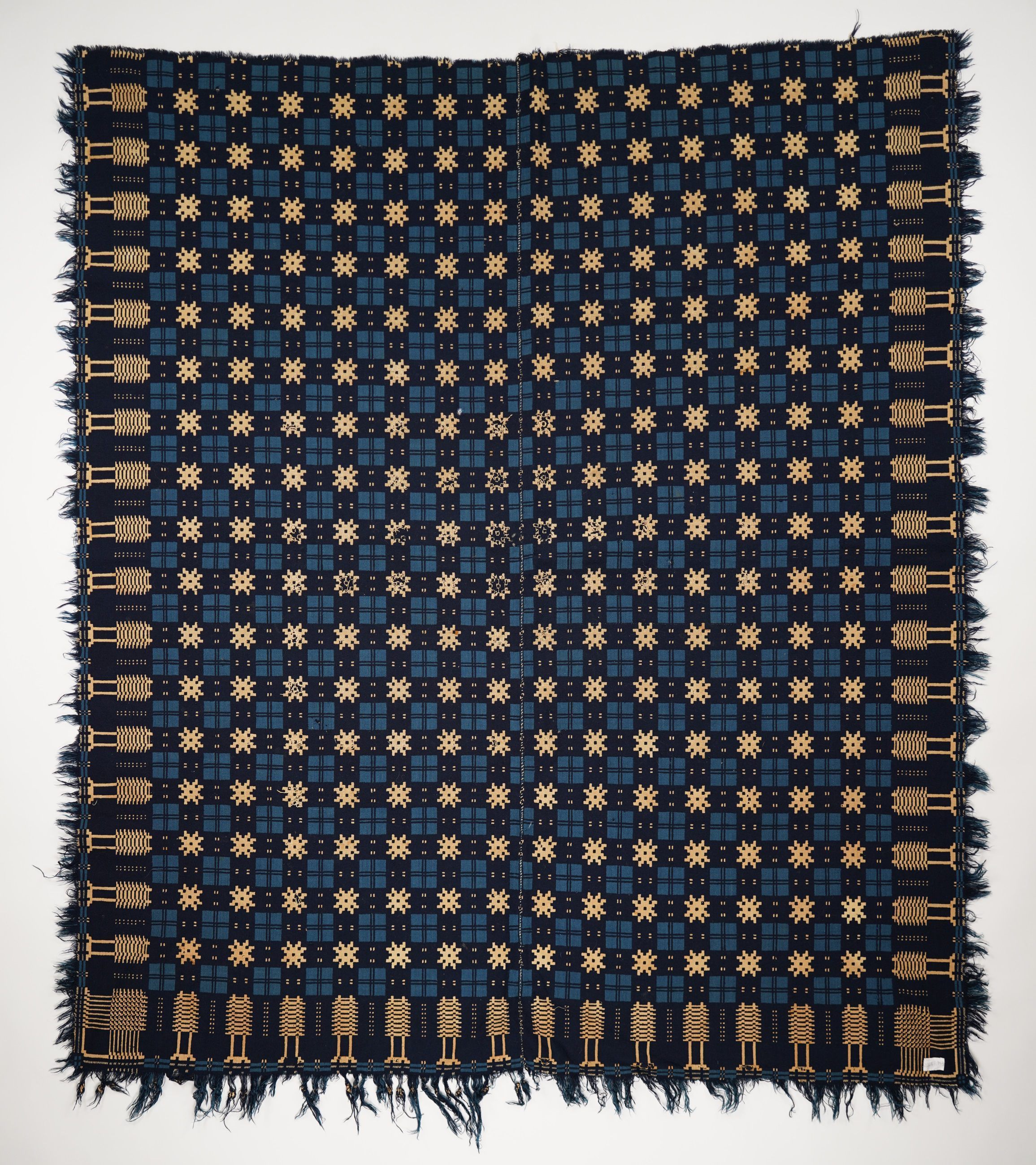 Double weave; blue, navy, natural; two loom widths joined; fringe on 3 sides; no corner blocks; geometric pattern in alternating plaid and snowflake pattern, trees? on border