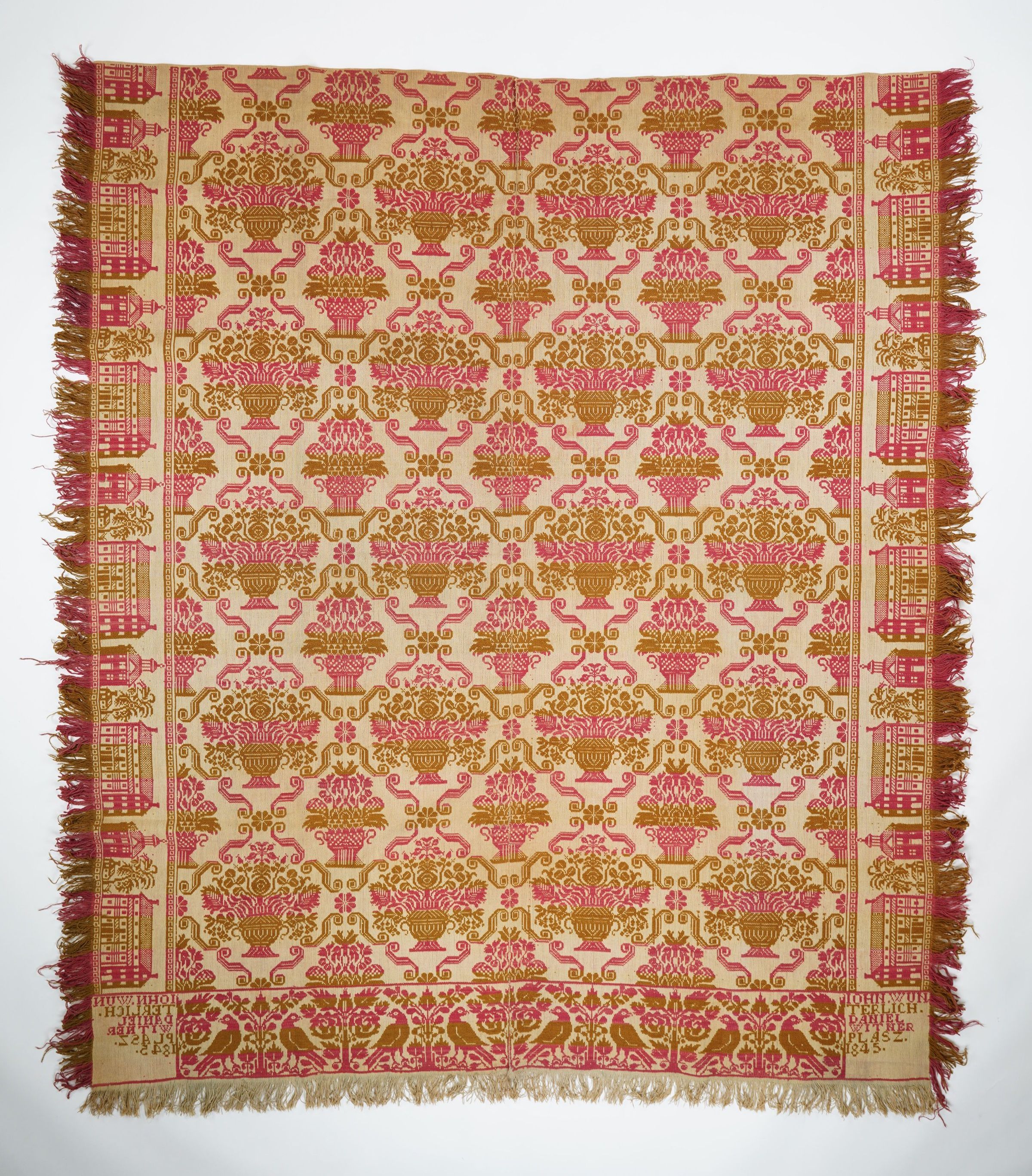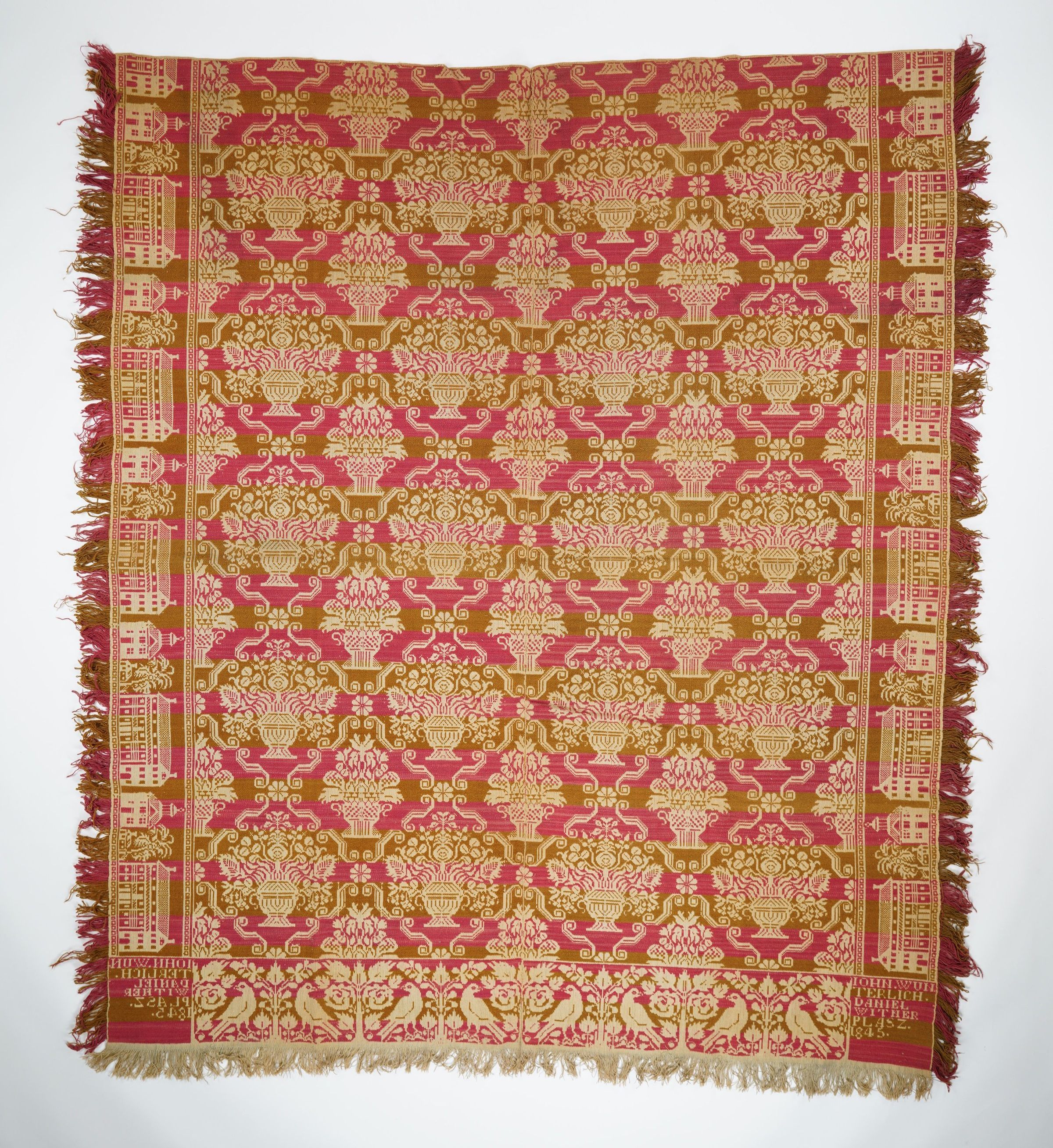 Pink and brown figured Beiderwand coverlet; two panels joined by a center seam; no fringe or border at top; architectural border on sides; distelfink border on bottom; self-fringe on three sides; centerfield pattern vases with flowersCollection