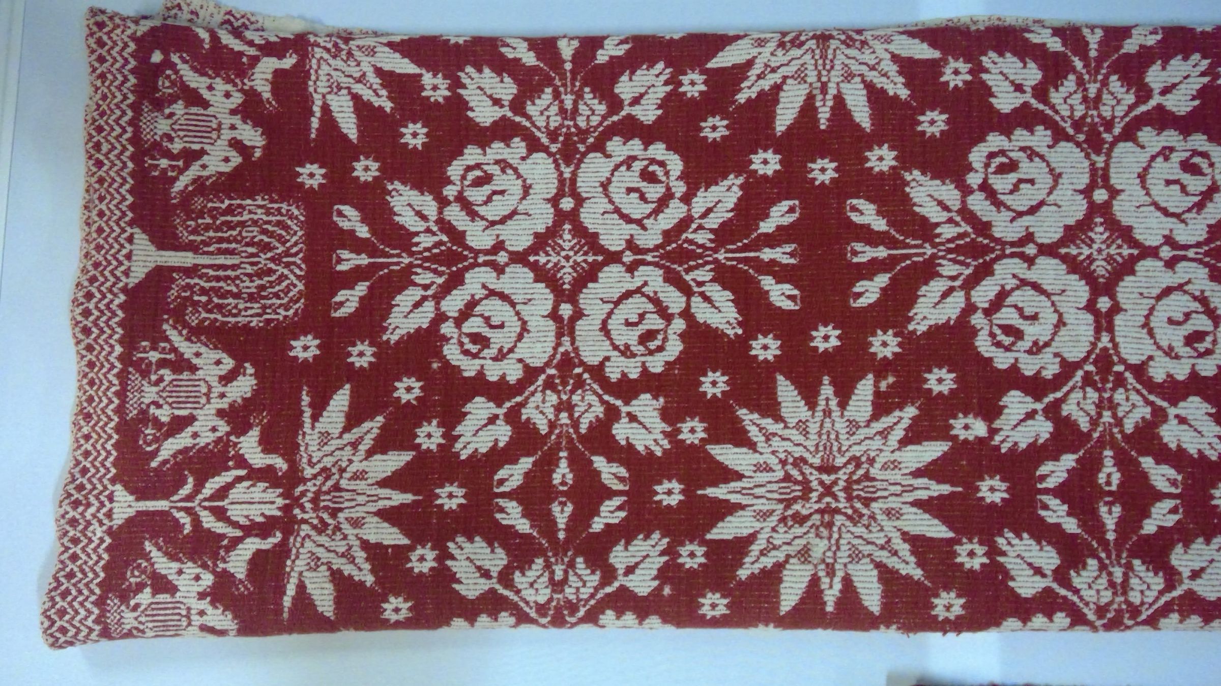 Beiderwand; red, natural; seamless; two corner blocks; no fringe; single border with eagles and willow trees; floral pattern throughoutCollection