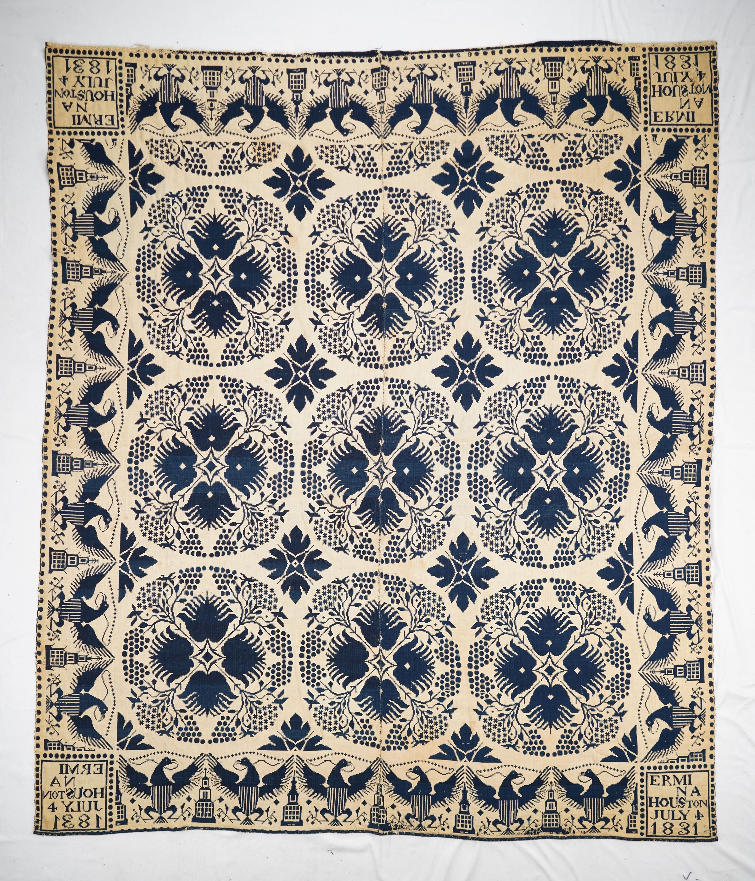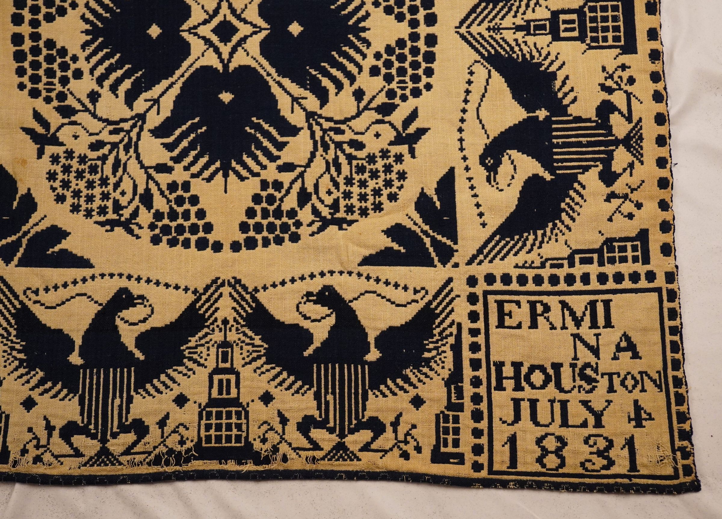 Natural and navy figured double weave coverlet; two panels joined by a center seam. Border on four sides; no fringe.Collection