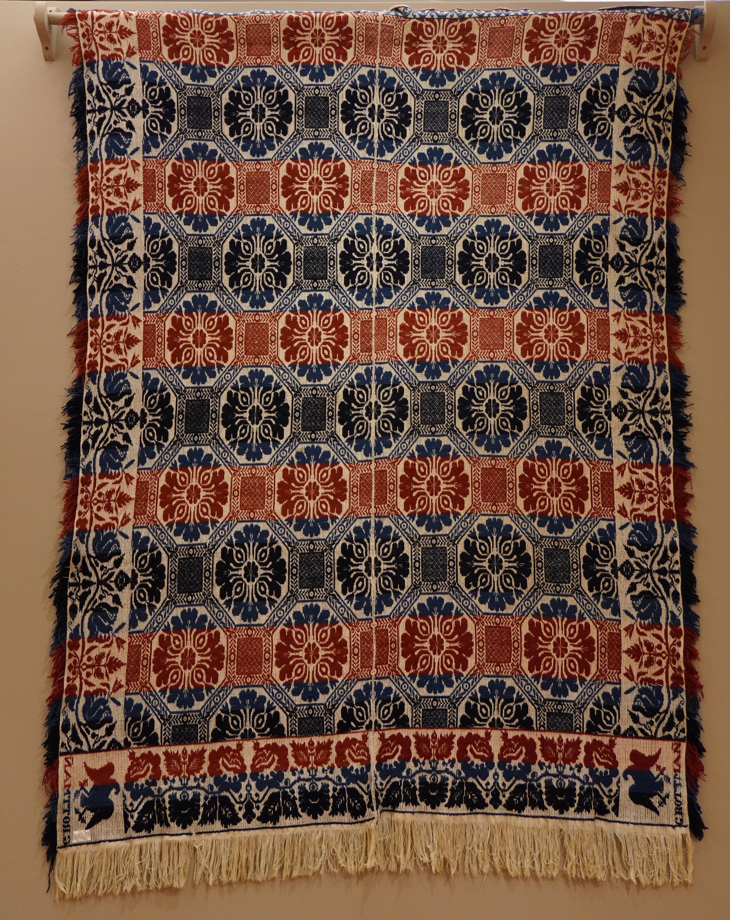 Beiderwand; navy, blue, red, natural; two loom widths joined ; fringe on 3 sides; 2 corner blocks with inscription and silhouette of eagle; floral border; centerfield contains rows of octagonal floral medallions, strips of colorCollection