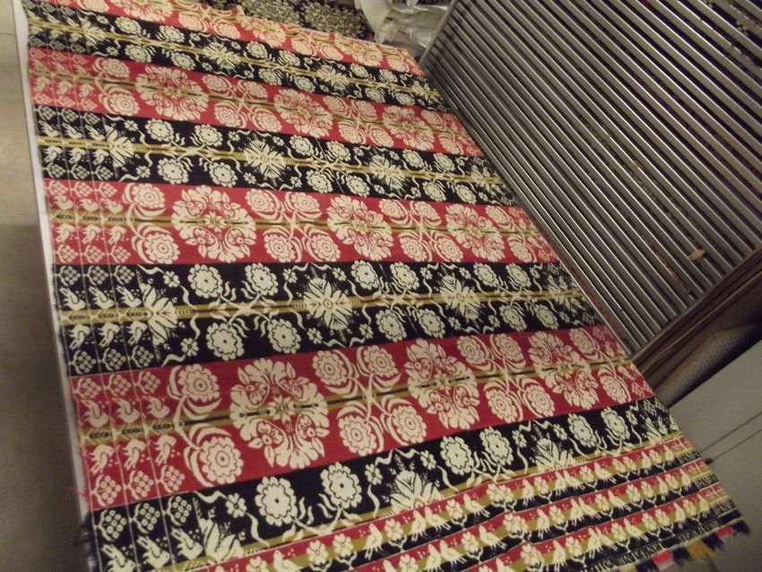 Tied Beiderwand, navy, green, red with fringe on three sides. Birds and flowers. John Wagner inscription along the bottom edgeAcquisition