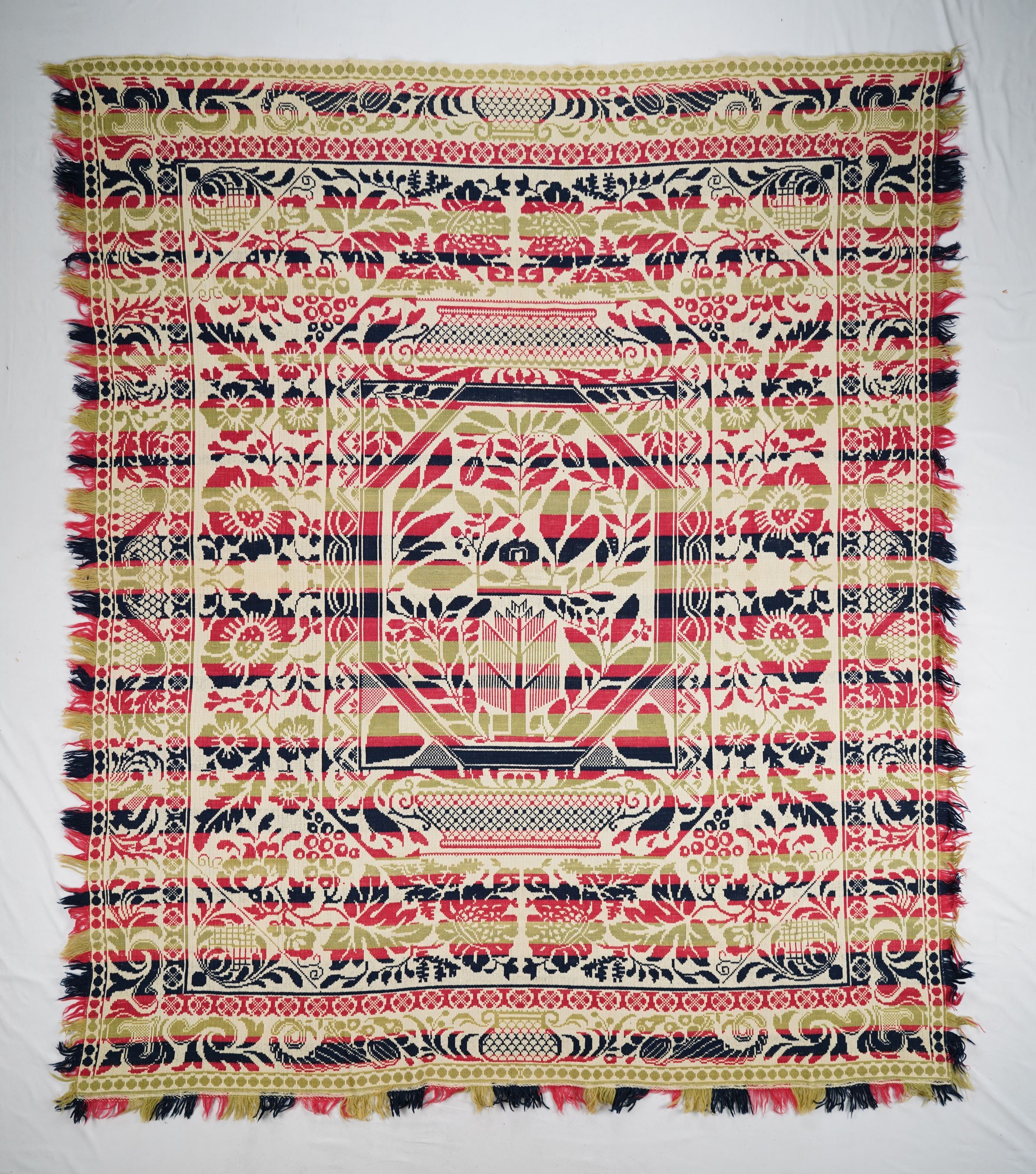 Natural, green, navy, and red figured tied beiderwand 3:1 coverlet; seamless. Border on four sides; fringe on three sides.Collection