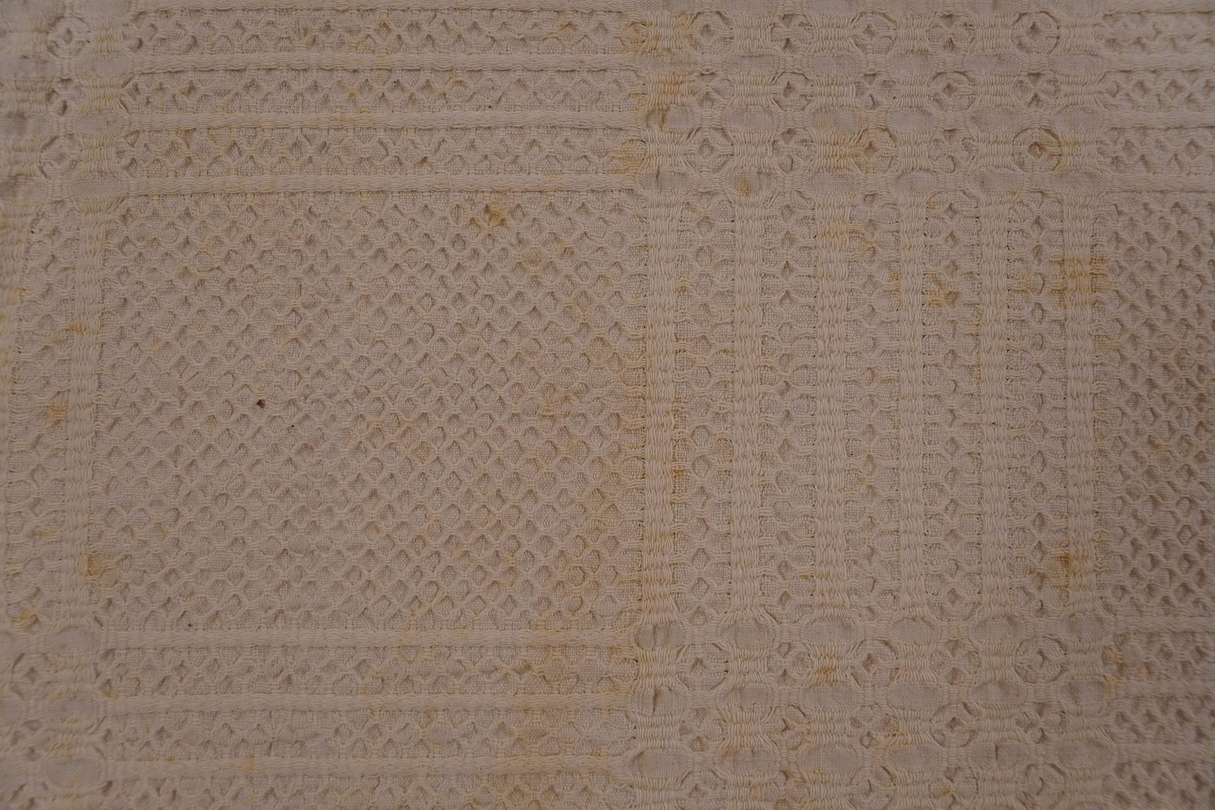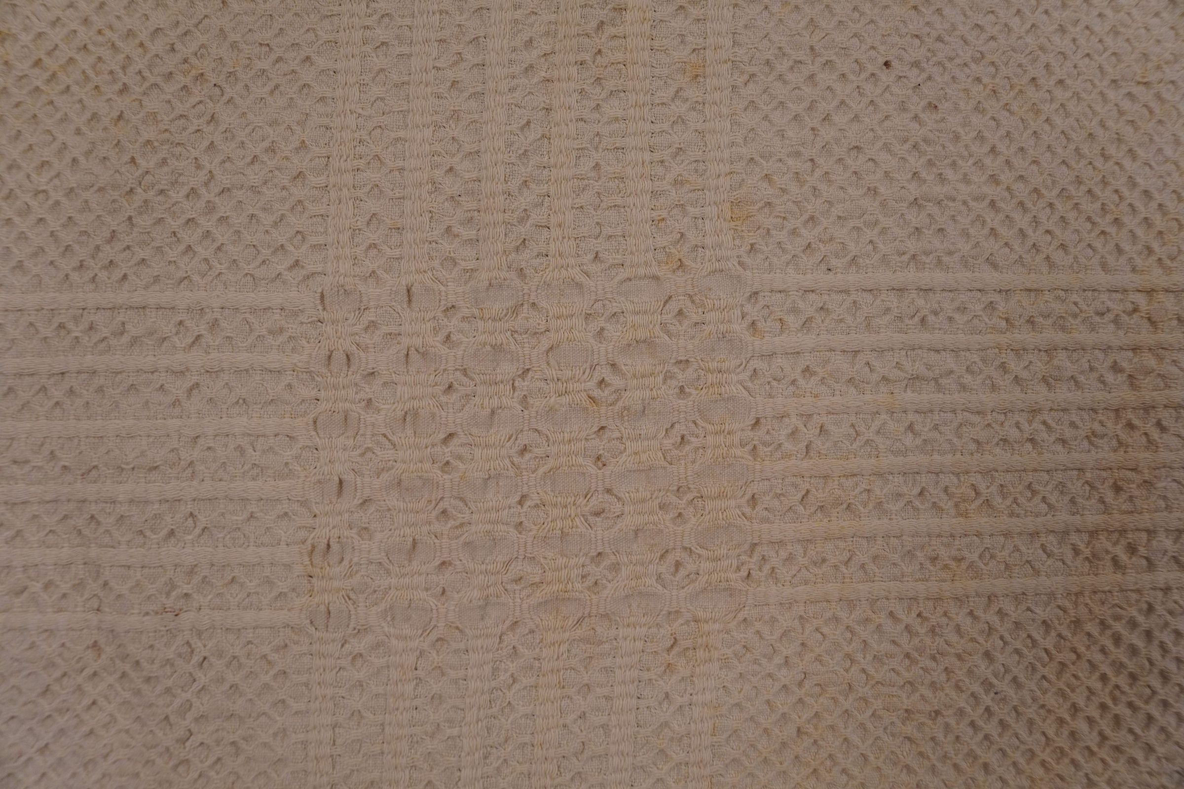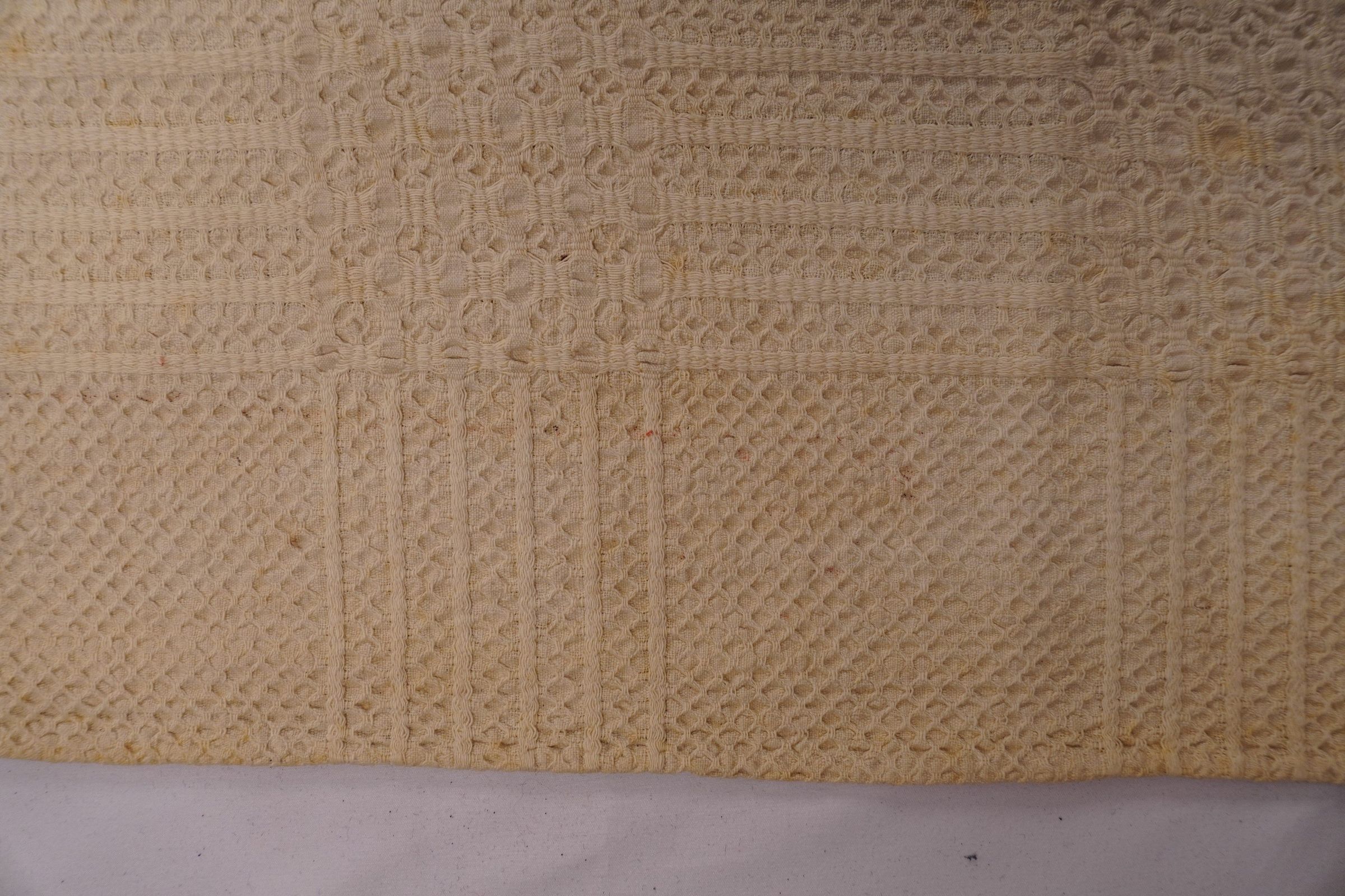 Natural geometric coverlet; three joined panels. No border or fringe.