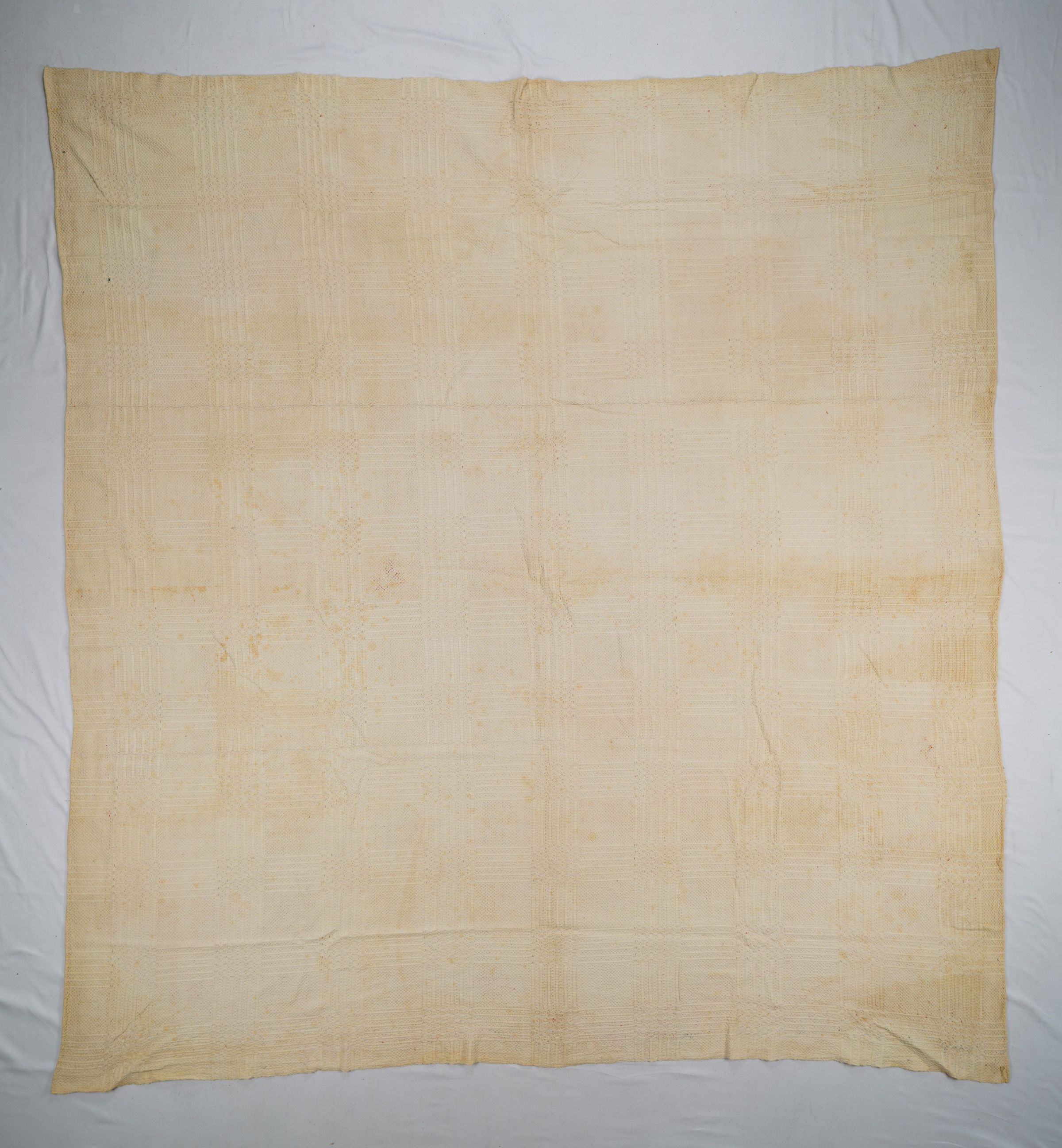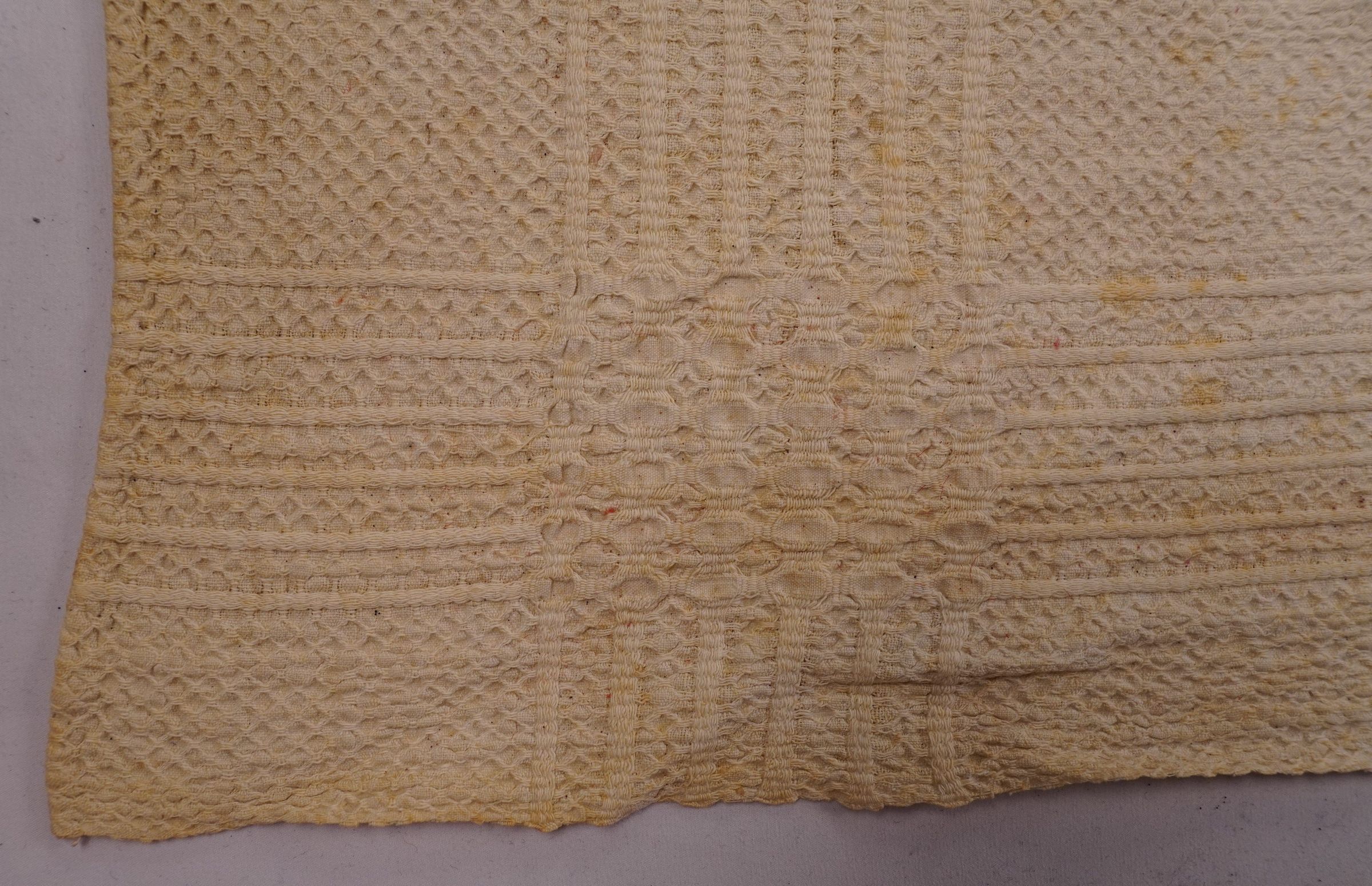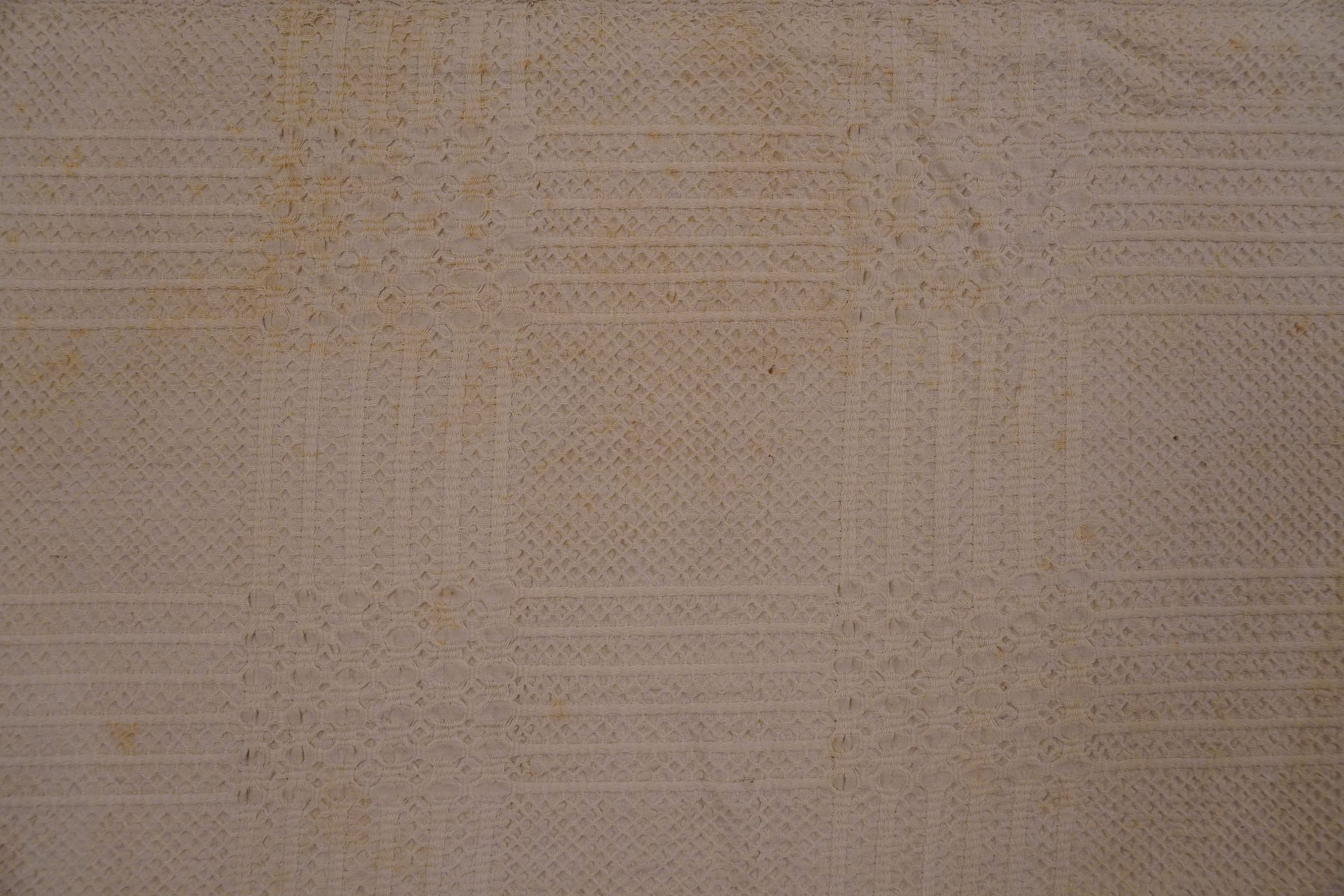 Natural geometric coverlet; three joined panels. No border or fringe.