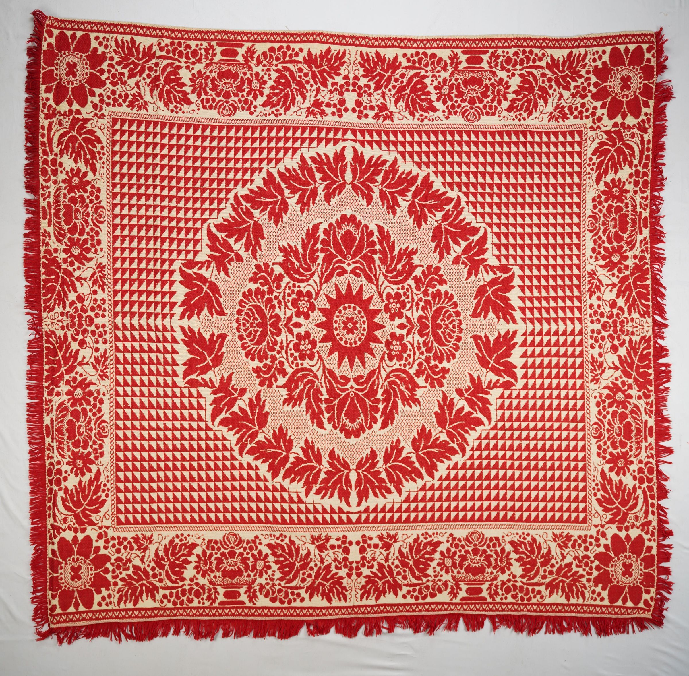 Natural and red figured double weave coverlet; seamless. Border on four sides; fringe on three sides.