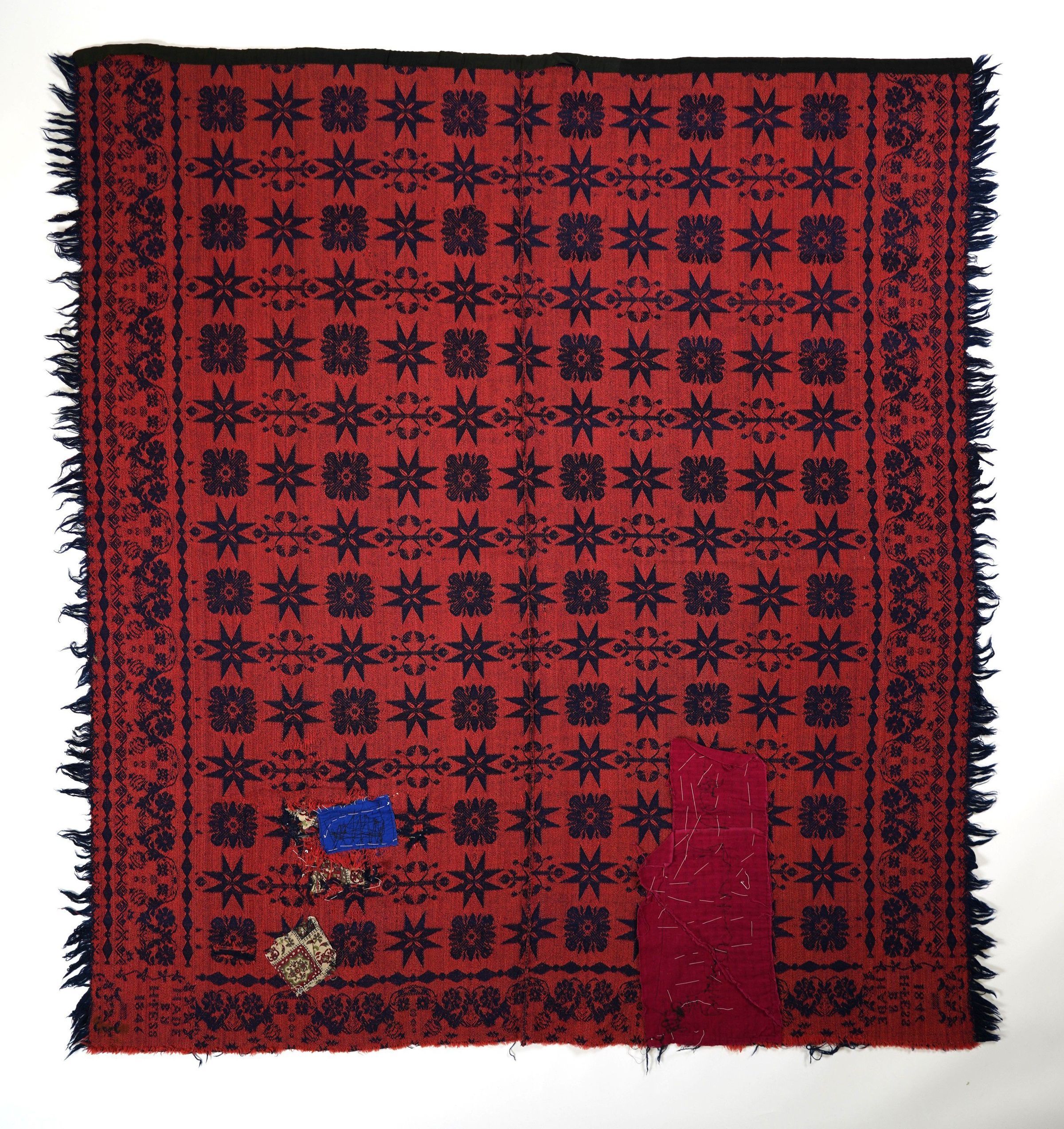 Figured twill coverlet; red and navy wool. Two panels joined by a center seam (non-reversible). Floral border and fringe on three sides. Top edge finished with black fabric tape. Mended with multiple printed cotton patches; fraying bottom hem.Collection