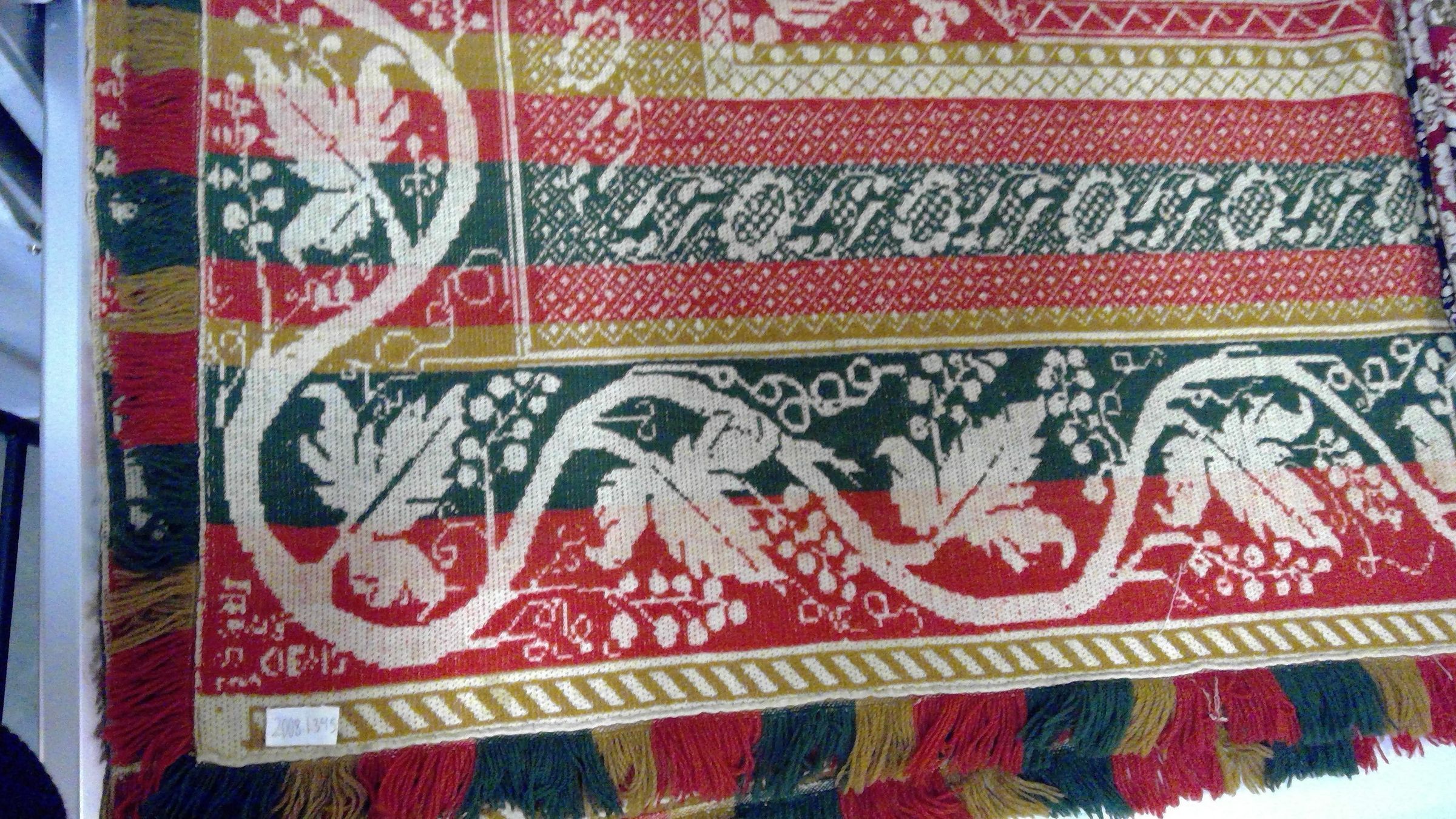 Beiderwand; green, red, yellow, natural; seamless; fringe on 2 sides; outermost border of vines and leaves on all 4 sides; six inner borders surround a floral center medallion; strips of color; no corner blocks or inscription; each corner appears to have some attempted letteringCollection