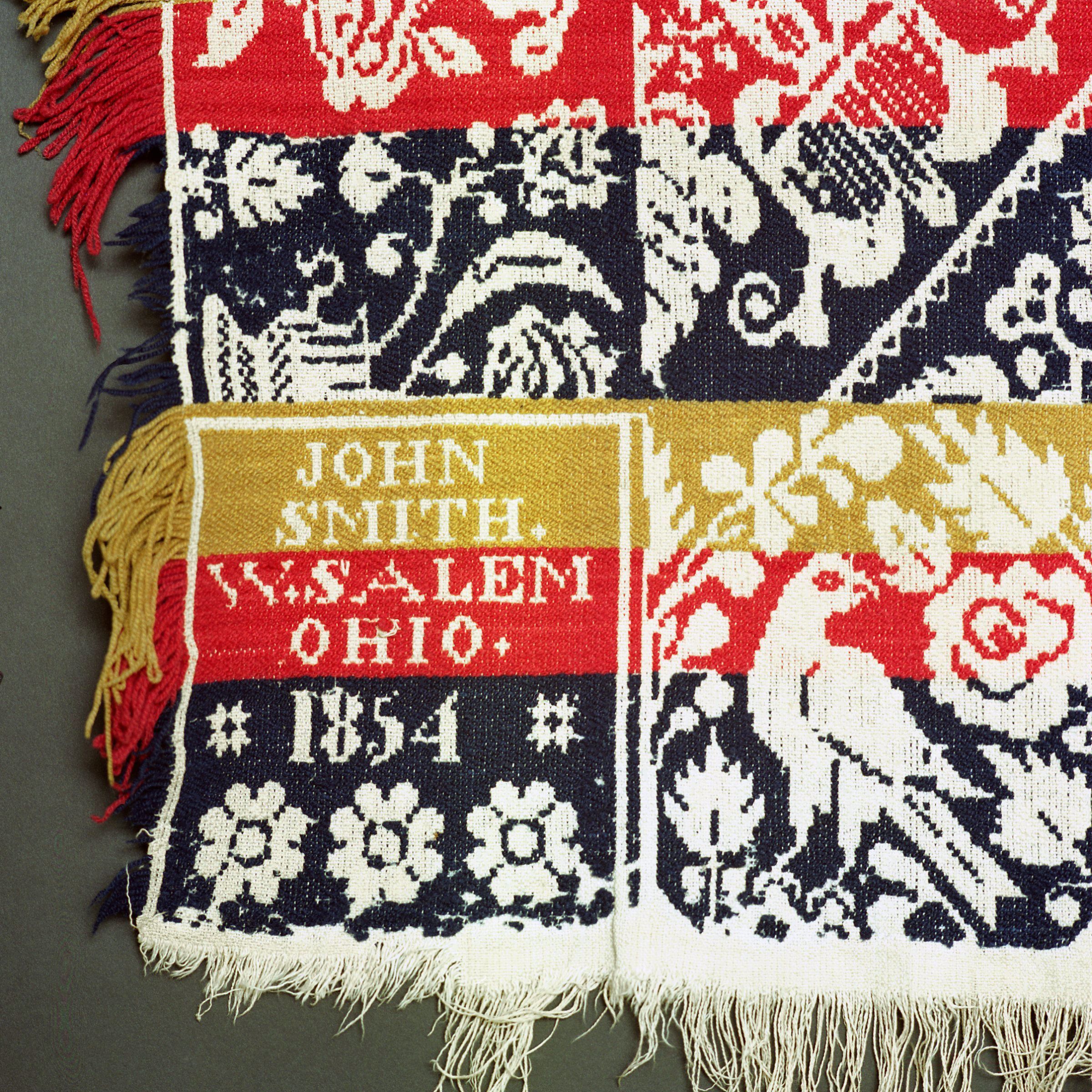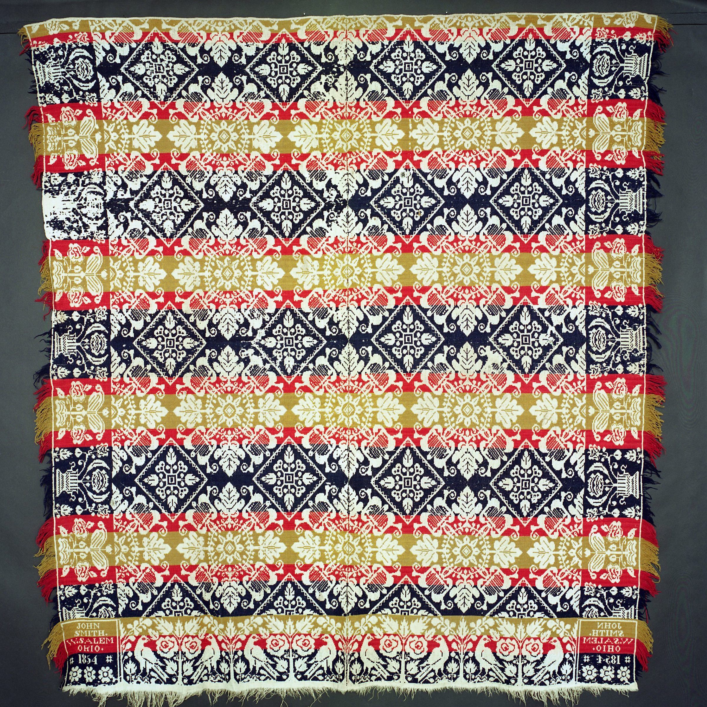 Beiderwand; navy, red, yellow, natural; two loom widths joined; fringe on 3 sides; border on 3 sides; sides of flowers and potted plants; bottom of distelfinks and roses; centerfield of rows of floral, diamond-shaped medallions, strips of color; two corner blocks with an inscription, two stars and three flowersCollection