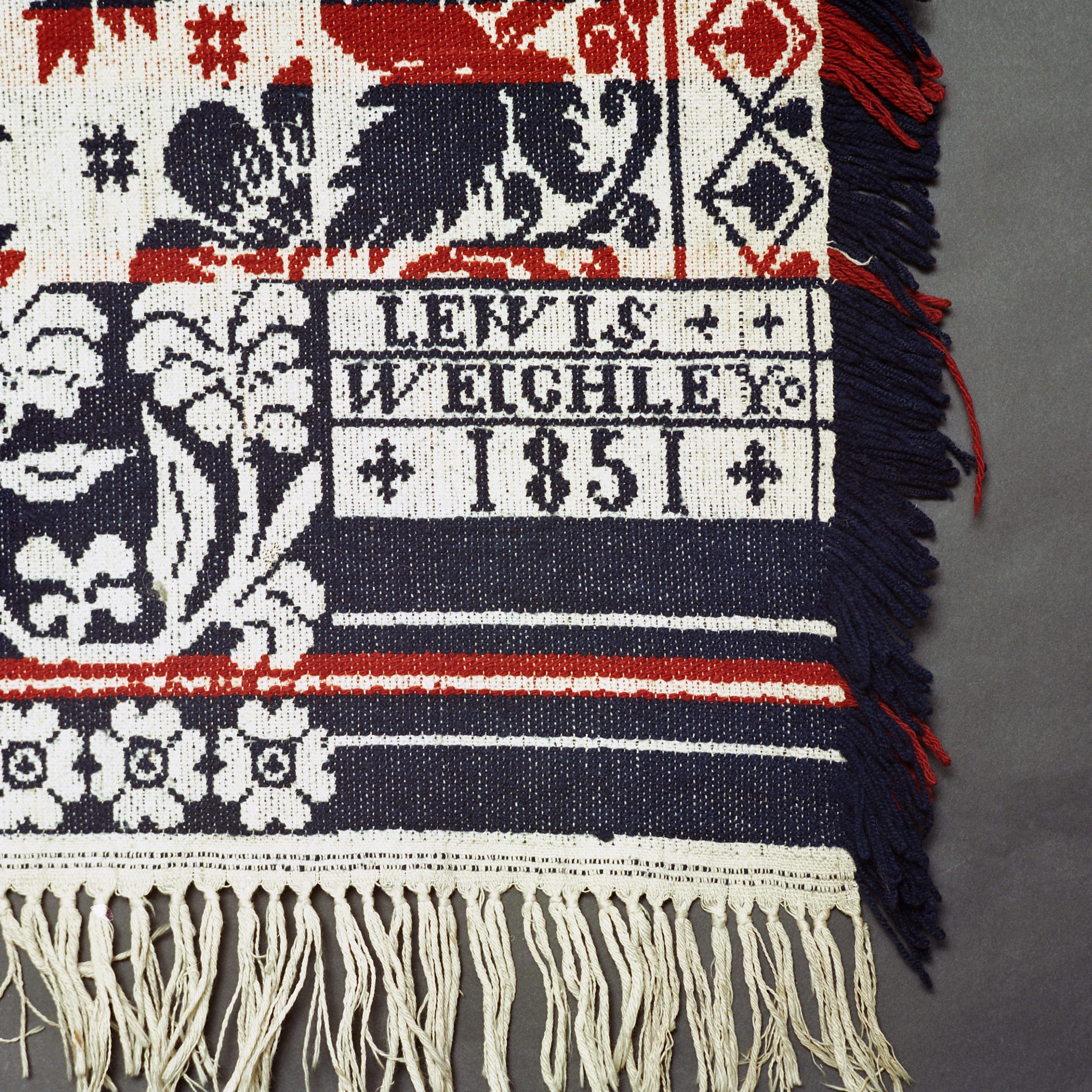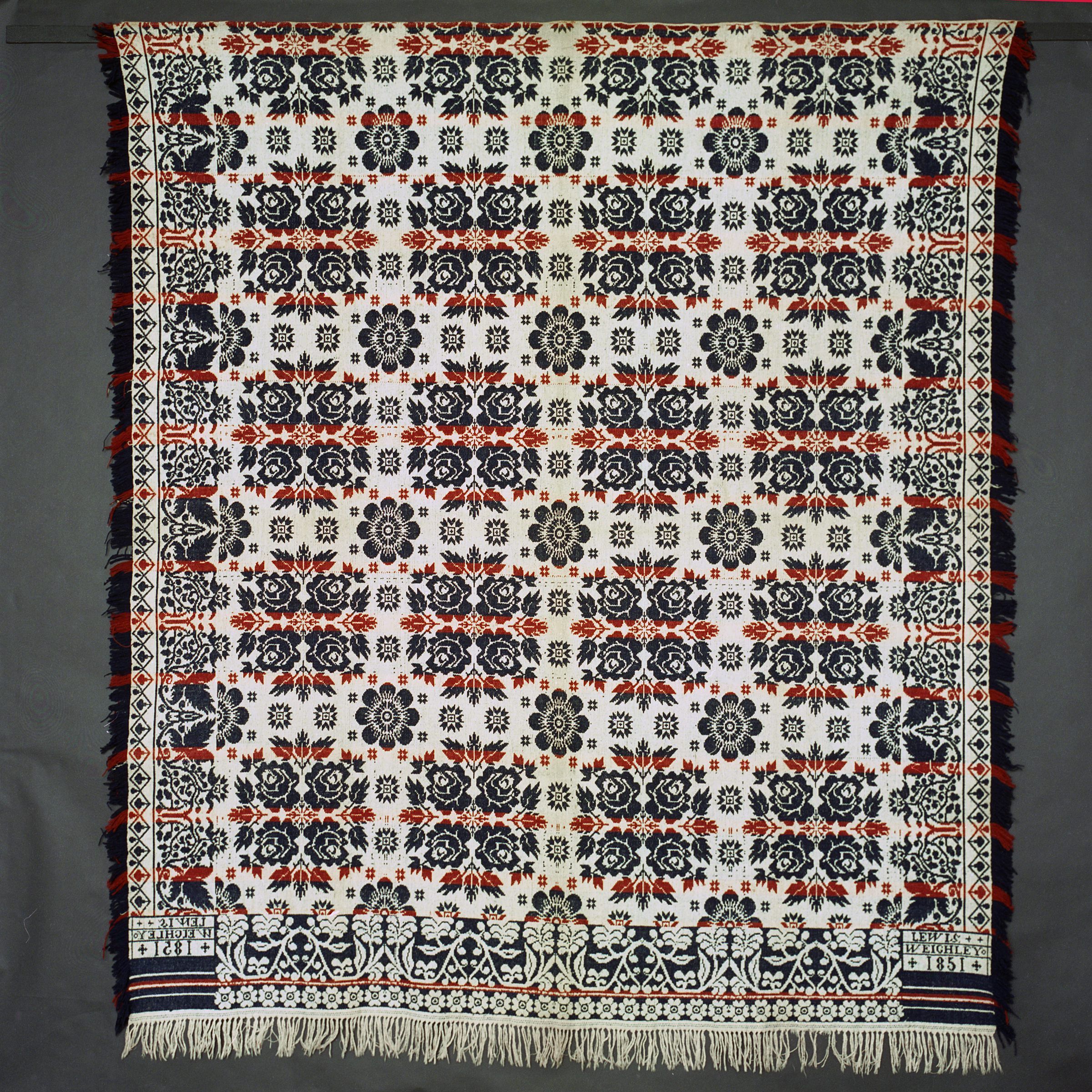 Beiderwand; navy, red, natural; fringe and border on 3 sides; seamless; side borders of leaves and vines; bottom border of flowers; centerfield of rows of rosette clusters, strips of colorCollection