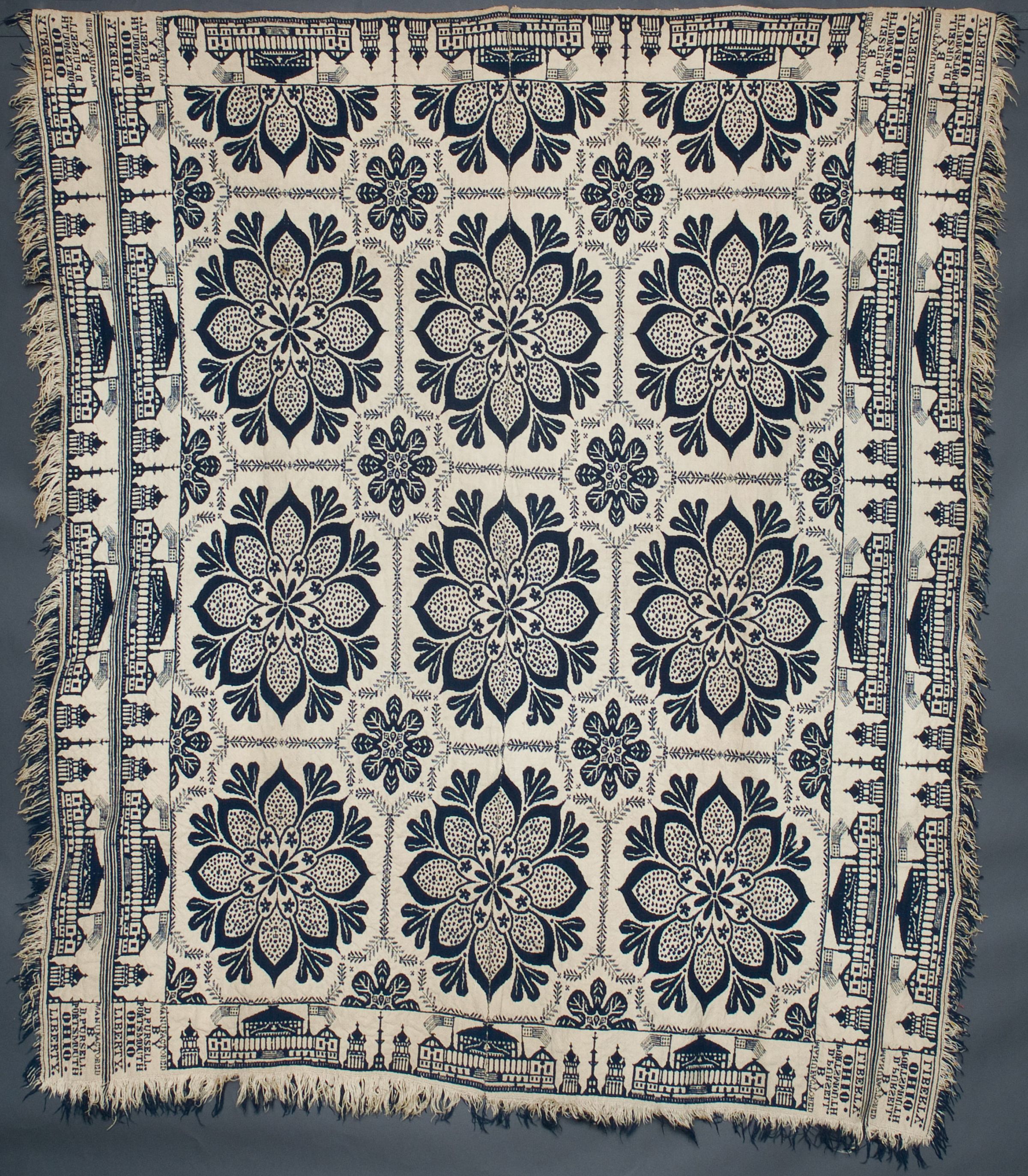 double weave; navy and natural; two loom widths joined; double borders on sides; borders have government and eastern styled buildings with flags; signature corner blocks have word "liberty"; centerfield has large flowers with small ones in between; fringe on 3 sides;Collection