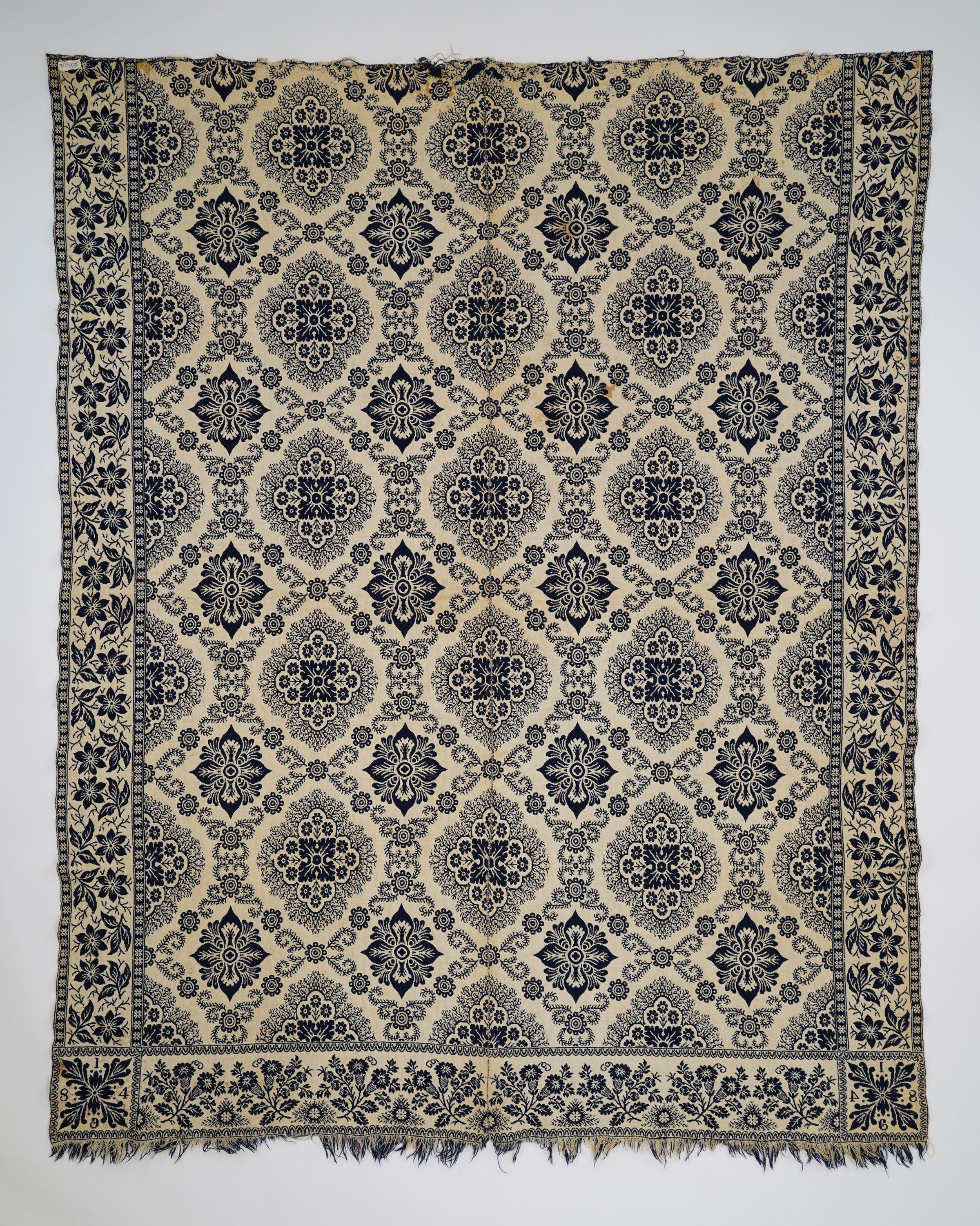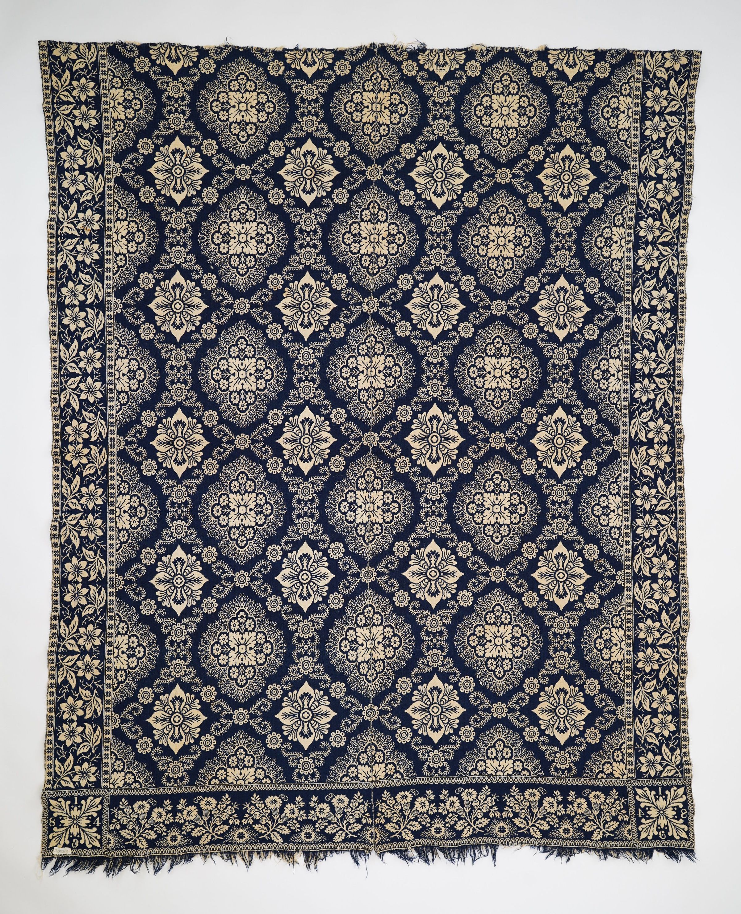 Double Weave, navy, white, various types of flowers, center seam, fringe only on bottomAcquisition