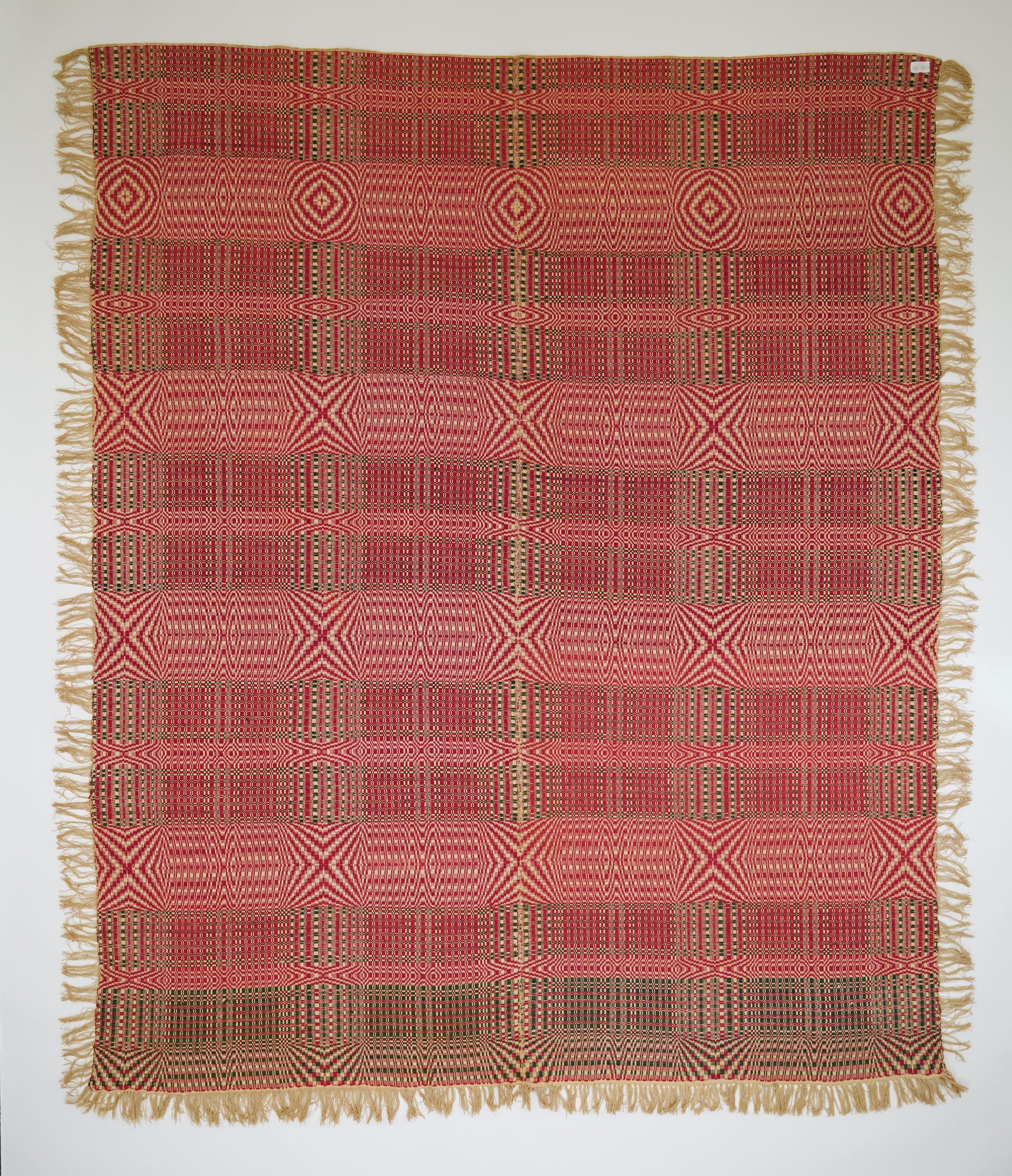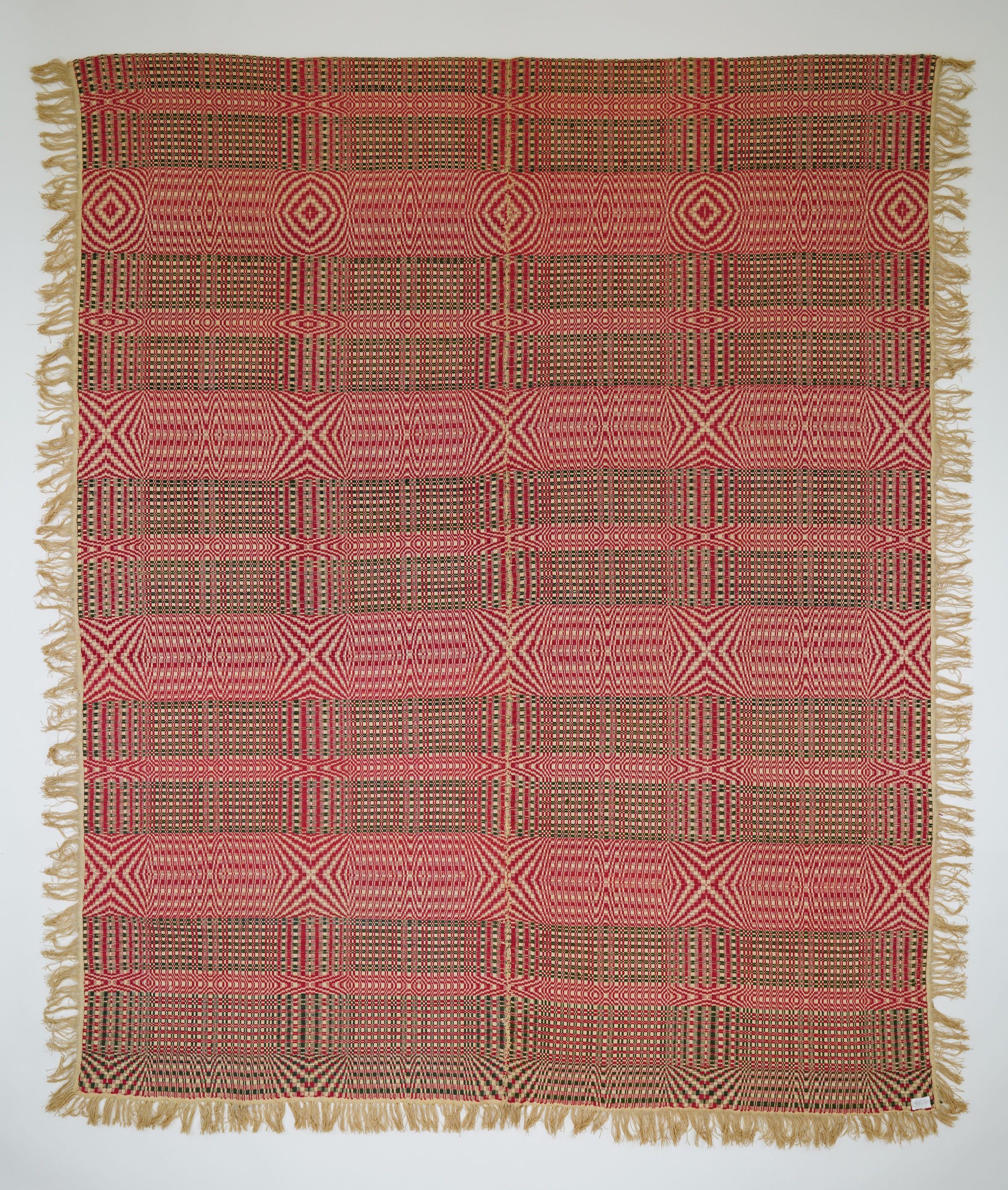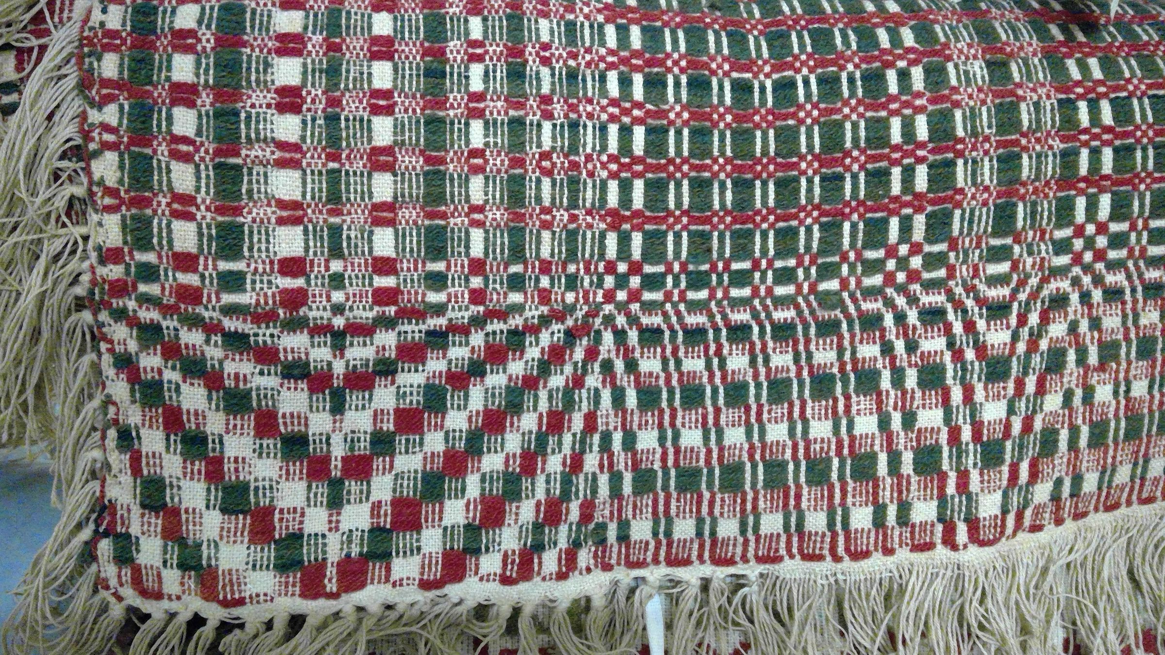 Overshot; red, green, natural; two loom widths joined; applied fringe on sides, self fringe on bottom; alternating rows of red + natural and red, green + natural; red and white rows have "x" and circular patternsCollection