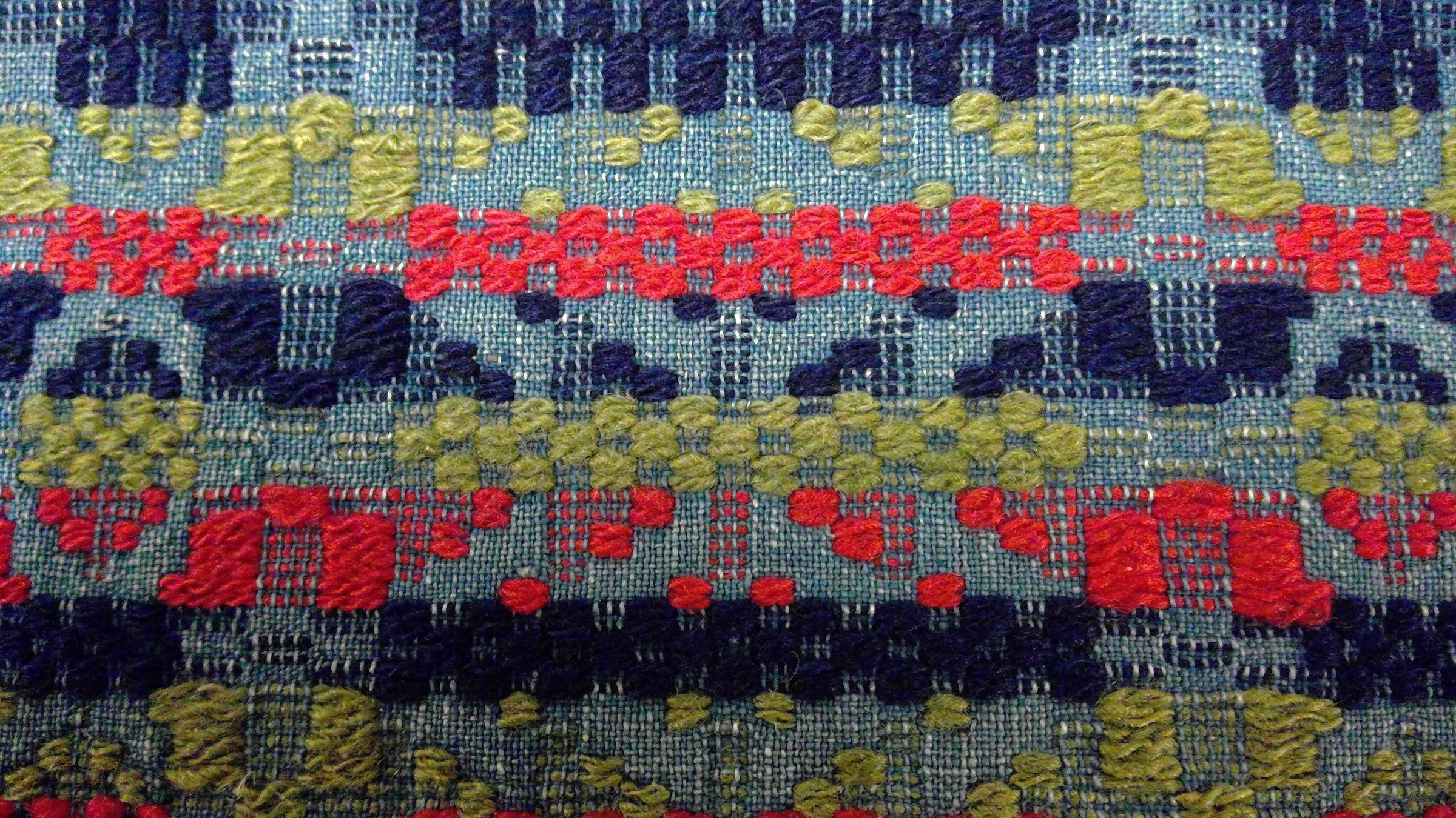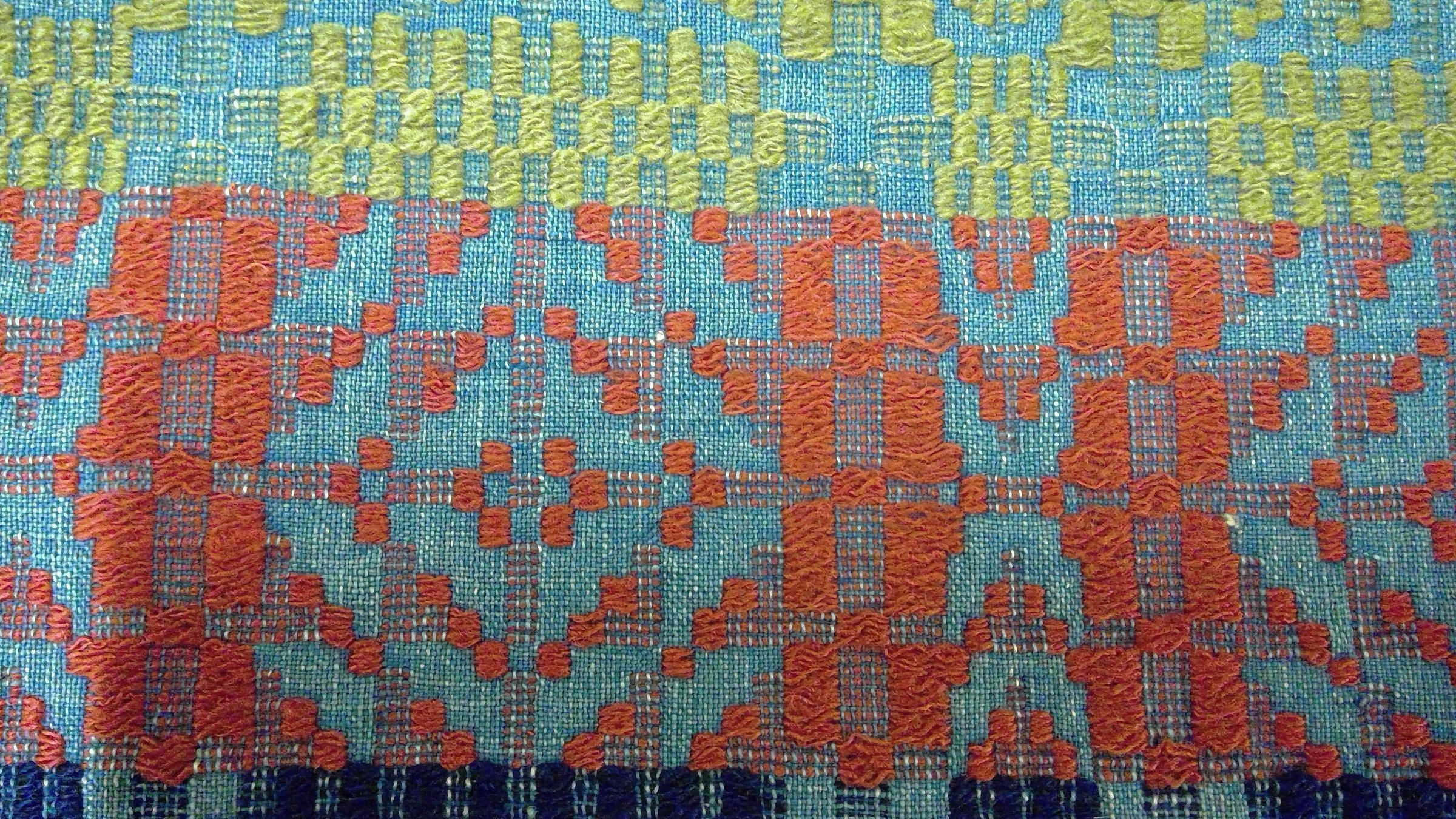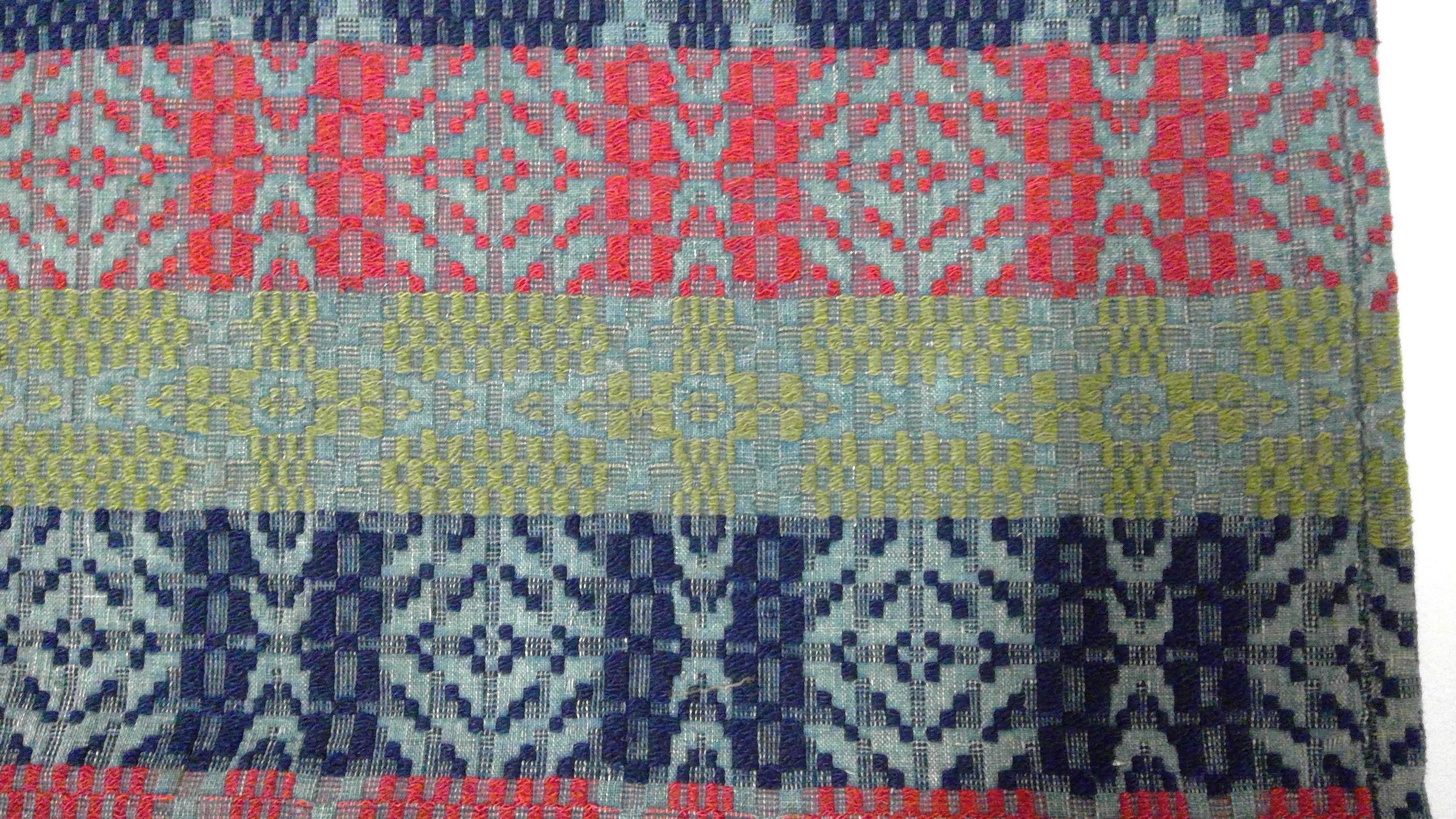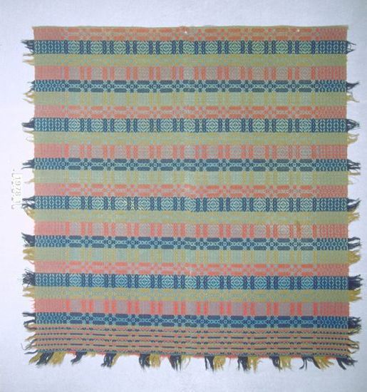Overshot coverlet; blue cotton and red, blue, and green wool. The center seam is well-matched and appears to have the original stitching. Top is hemmed and three sides are fringed. The central design motifs are the tables, which have a band of converging chevrons across the middle and broken diamond stripes are seperated by stripes of approximately the same width, which repeat the converging chevron pattern vertically. The broad bands of color change when the design changes. There is a border on three sides which also consists of chevrons and diamonds.Collection