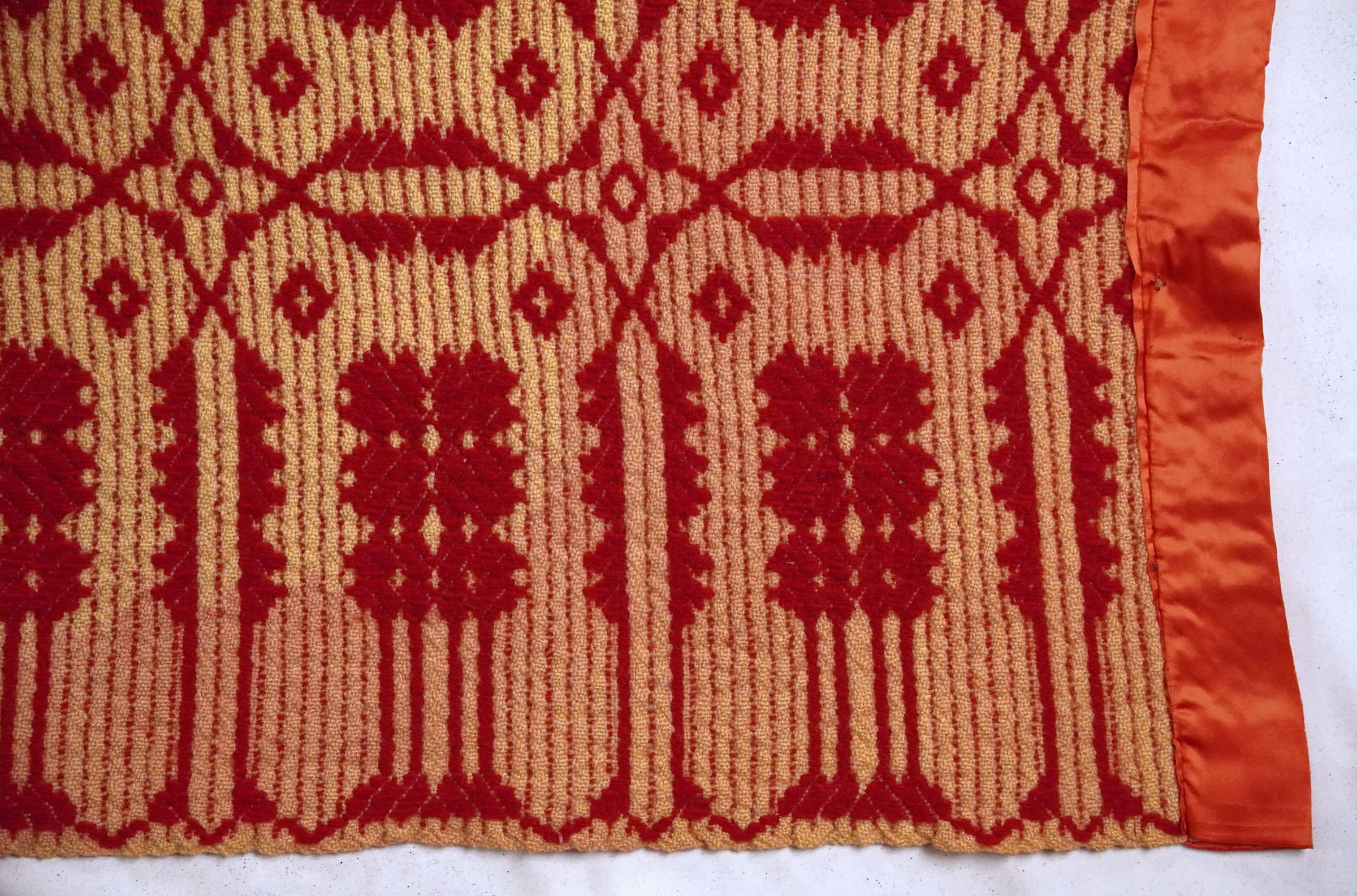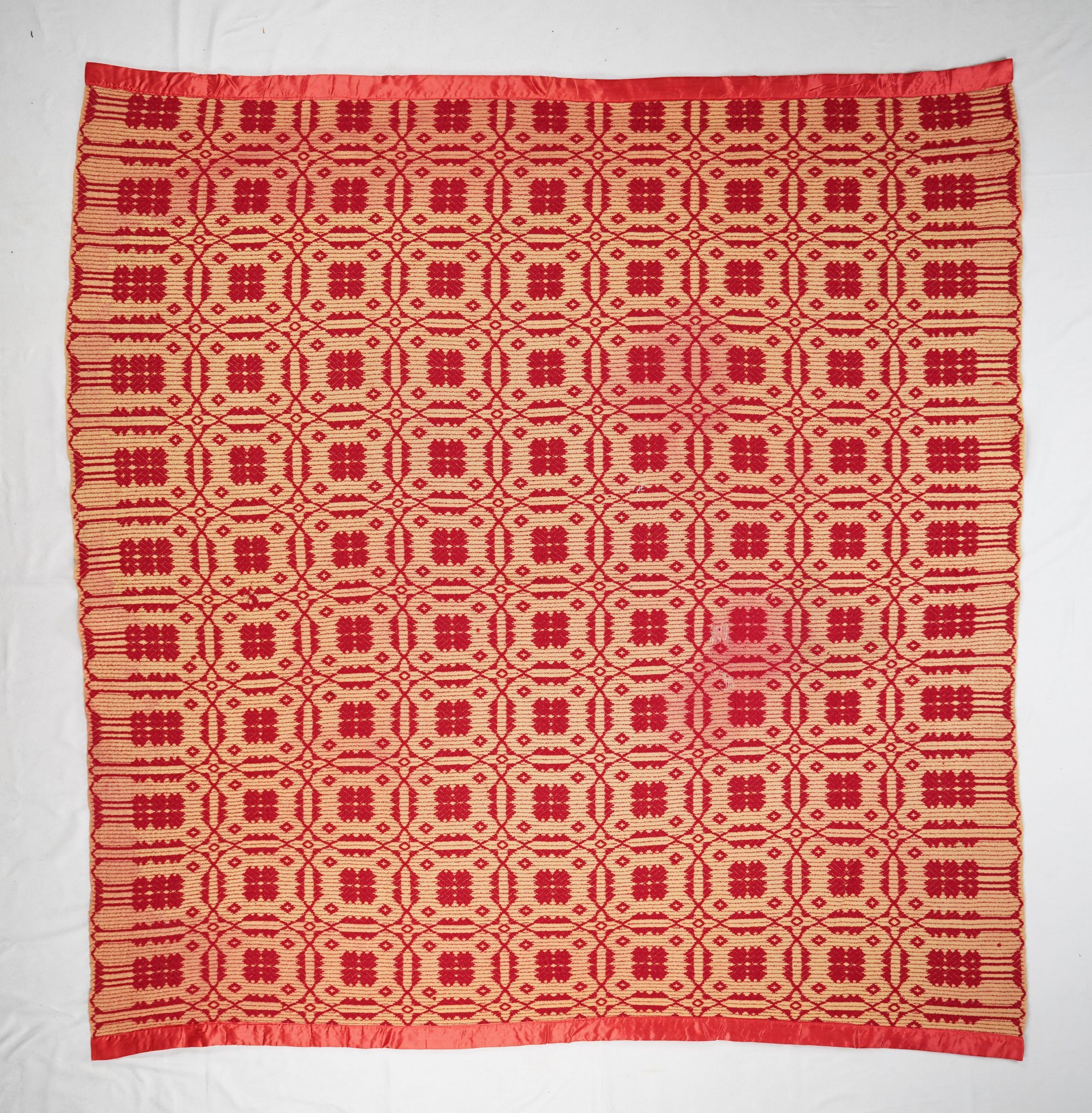 Natural and red geometric coverlet; seamless. No fringe; border on left and right. Fabric sewn onto top and bottomCollection
