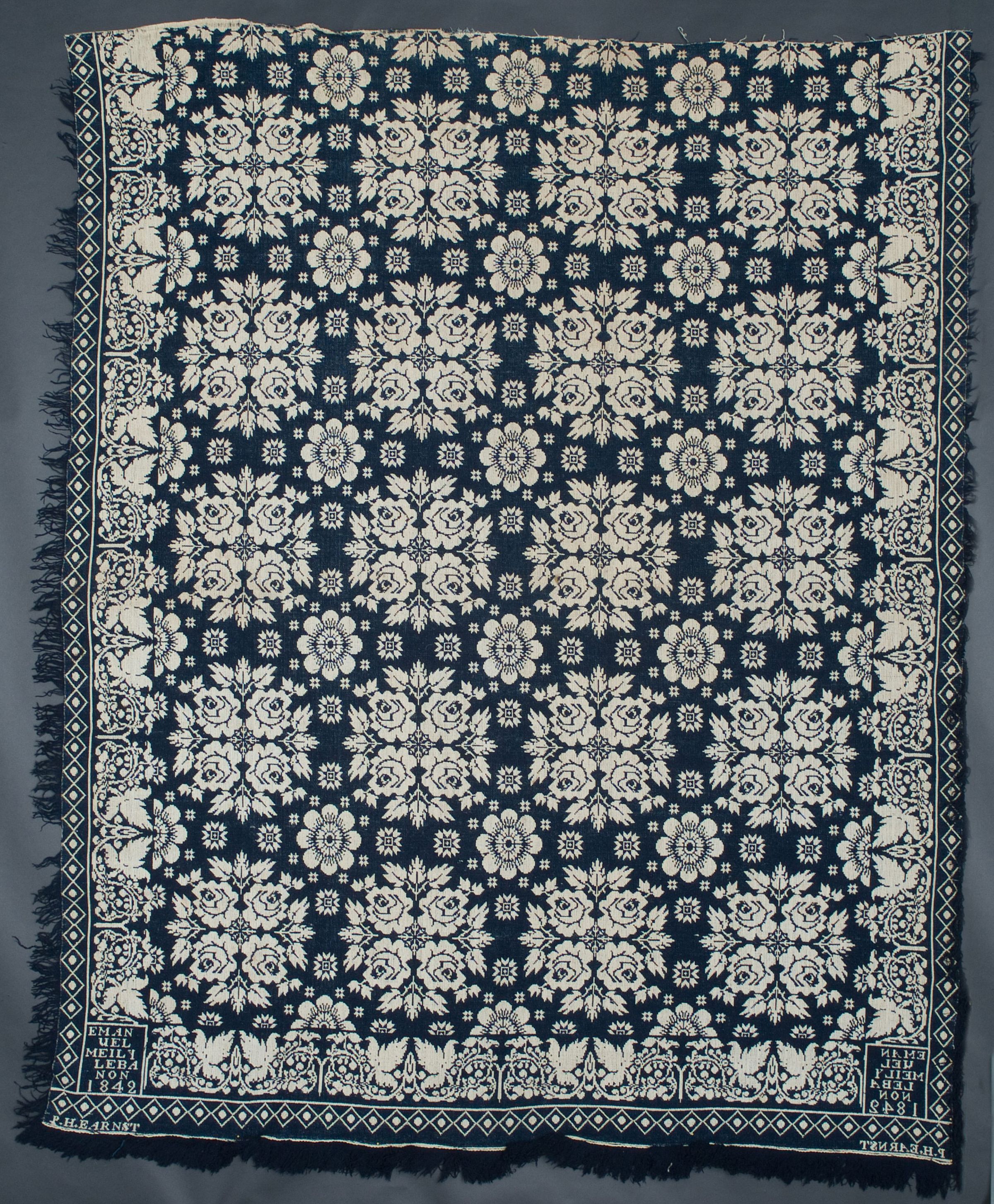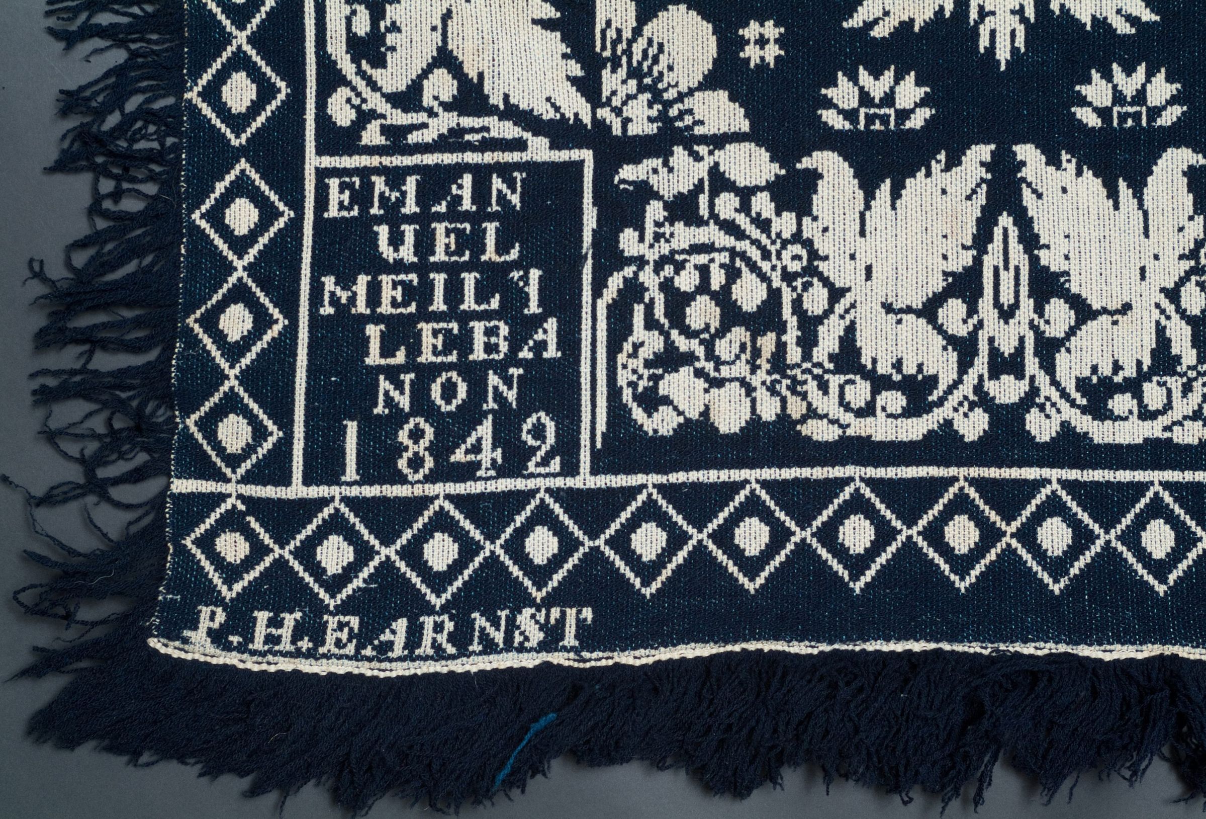 Beiderwand; navy, natural; seamless; fringe and border on 3 sides; border of grapevines; extra strip at bottom; 2 corner blocks with inscription; centerfield has rosette clusters, flowers, and starsCollection