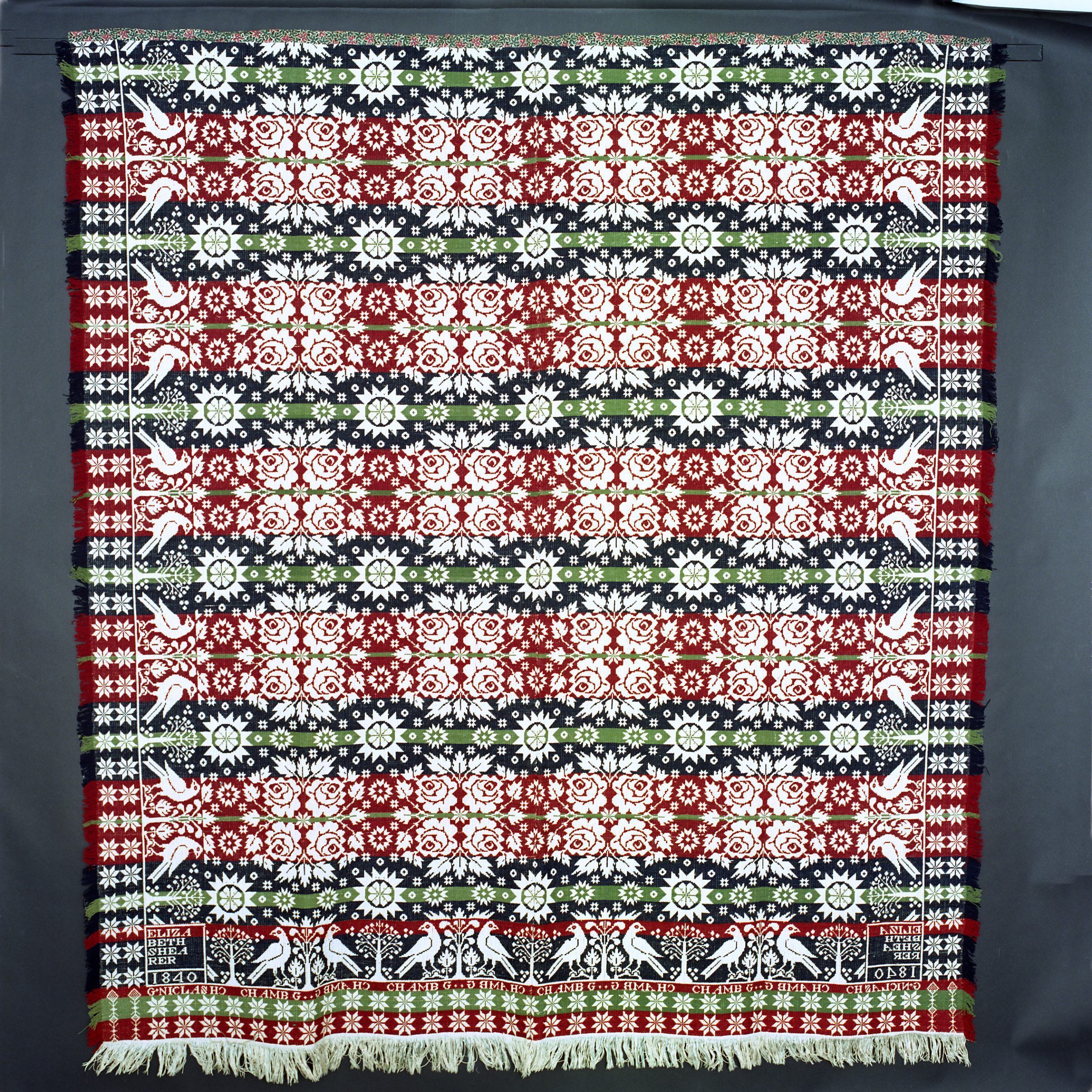 Beiderwand; navy, red, green, natural; two loom widths joined; Beiderwand; two corner blocks; fringe on 3 sides; border of stars, birds, and trees; center is alternating strips of floral pattern and starsCollection
