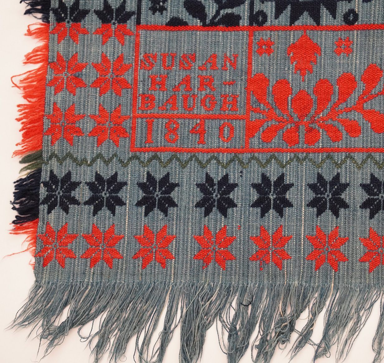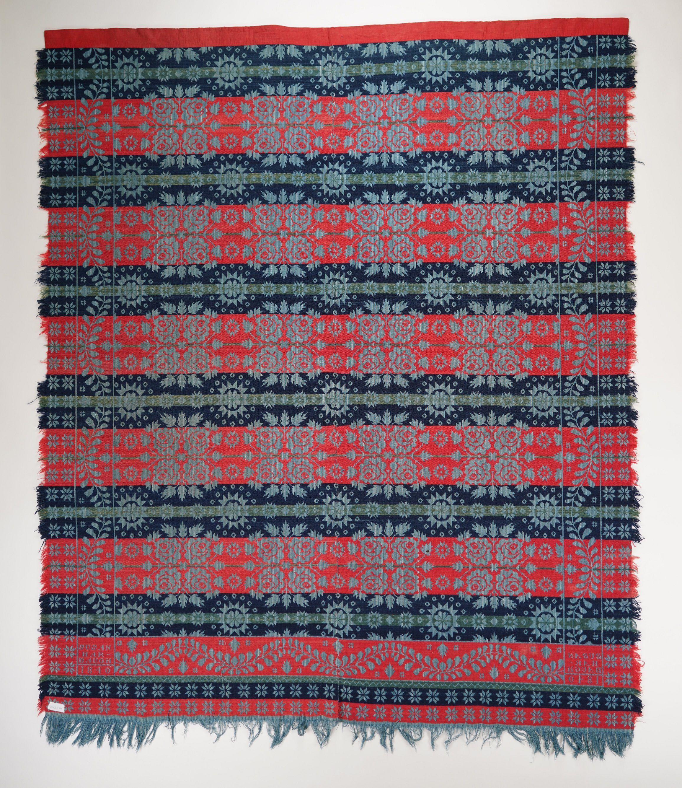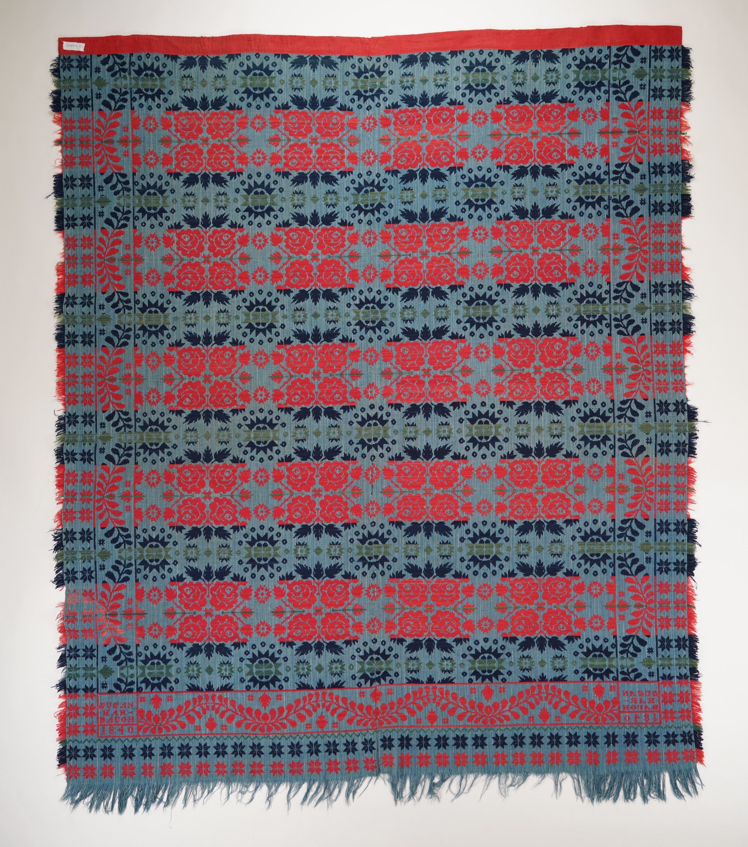 Beiderwand; navy, light blue, red, green; double border of stars; fringe on 3 sides; two loom widths joined; centerfield has ferns, flowers, star or sun, roses, leaves, circles with crosses around the flower/sunCollection