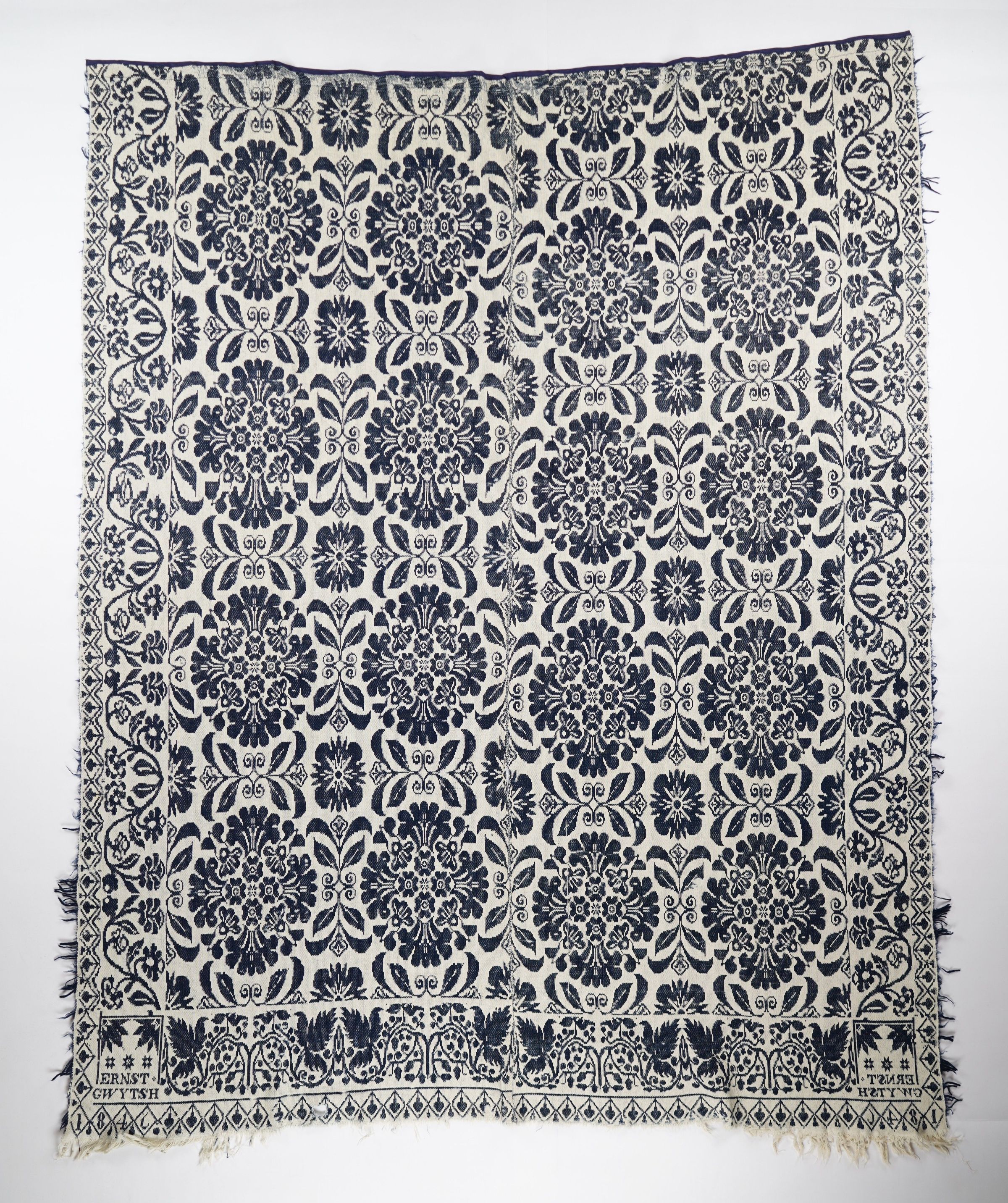 Figured and fancy tied beiderwand coverlet with borders on 3 sides and self-fringe on 3 sides. Two panels joined by a center seam. Navy wool with undyed cotton. Floral medallions centerfield pattern; floral vine border on sides; grapevine border on bottom. Woven by Ernst Gwytsh in 1846.Context