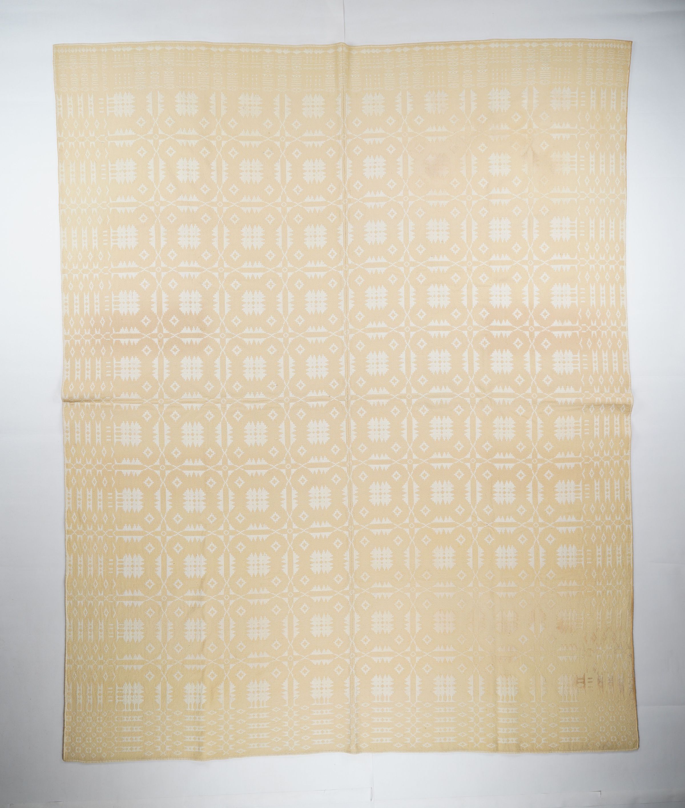 Geometric fancy geometric doubleweave coverlet with borders on 4 sides and no fringe. Two panels joined by a center seam. Natural wool with undyed cotton. Abstract centerfield pattern; abstract border on sides and bottom; border with name on top. Woven for Anna Akin.Context