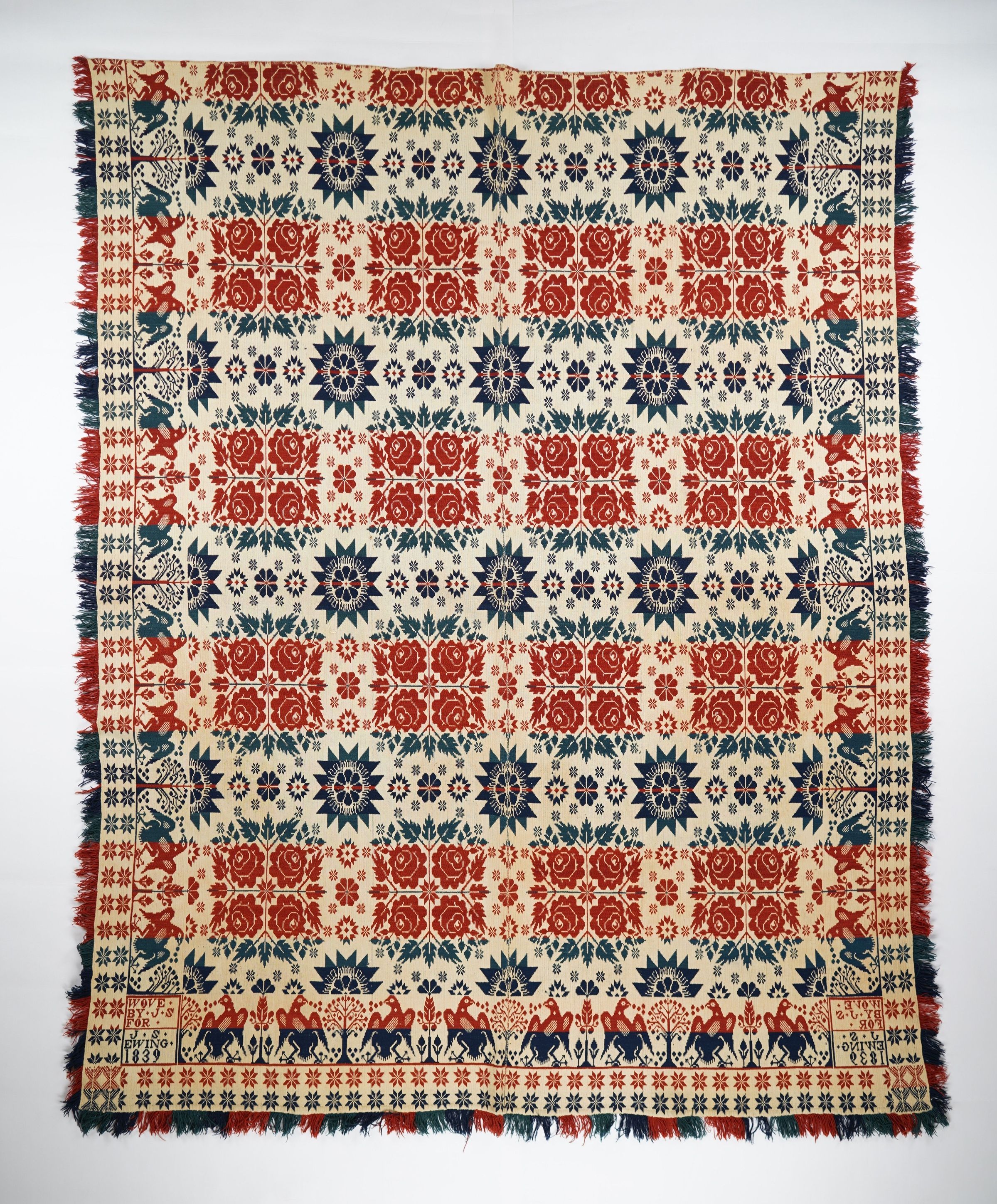 Navy, red, blue/green, and natural figured tied beiderwand coverlet with border and fringe on three sides. Two joined panels. Woven for J. S. Ewing by J. S. in 1839.Context