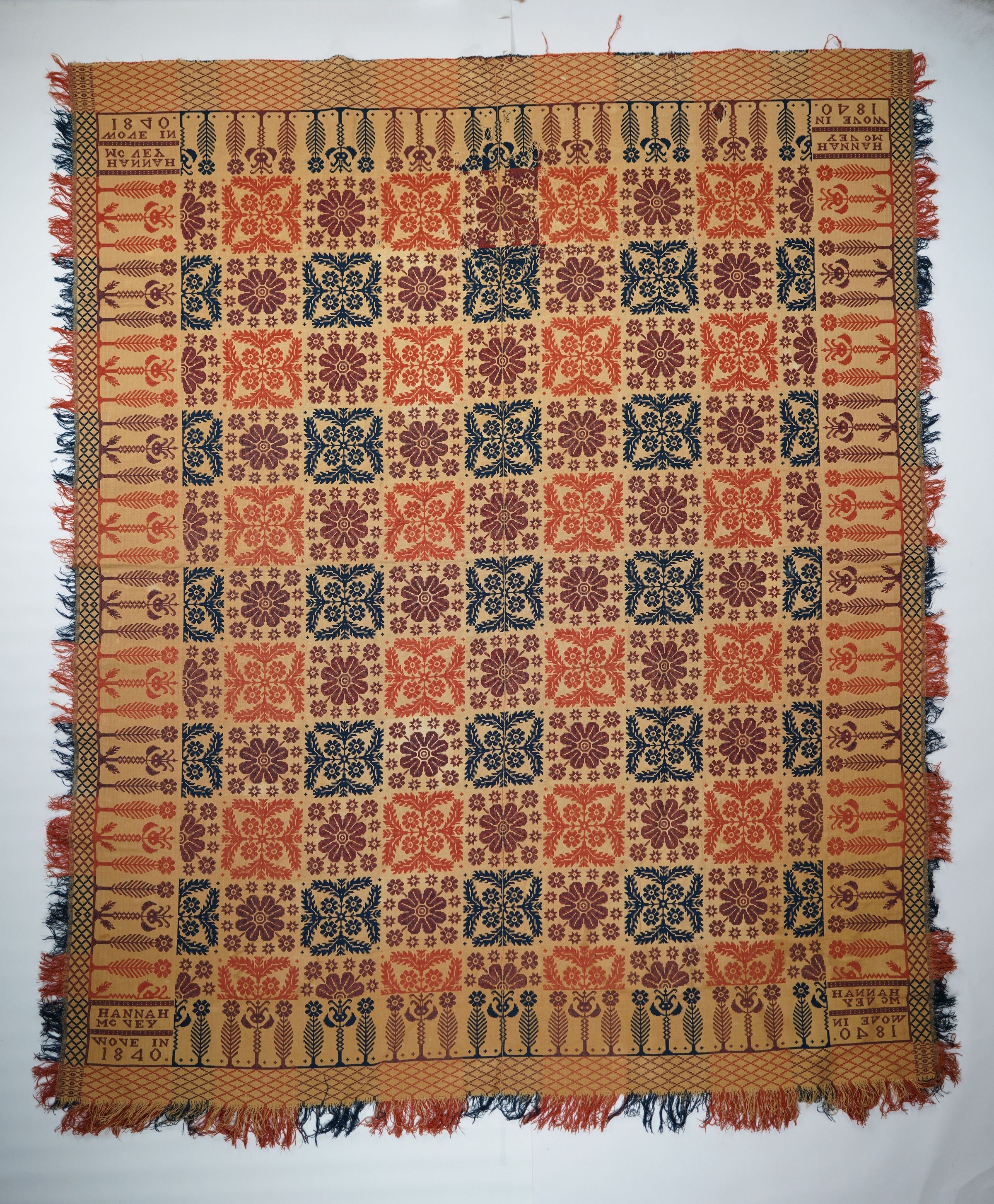 Red, navy, and natural figured doublecloth coverlet with border on four sides and self-fringe on three sides. Two joined panels. Woven for Hanna McVey by John Gamble in 1840 in Pennsylvania.Collection