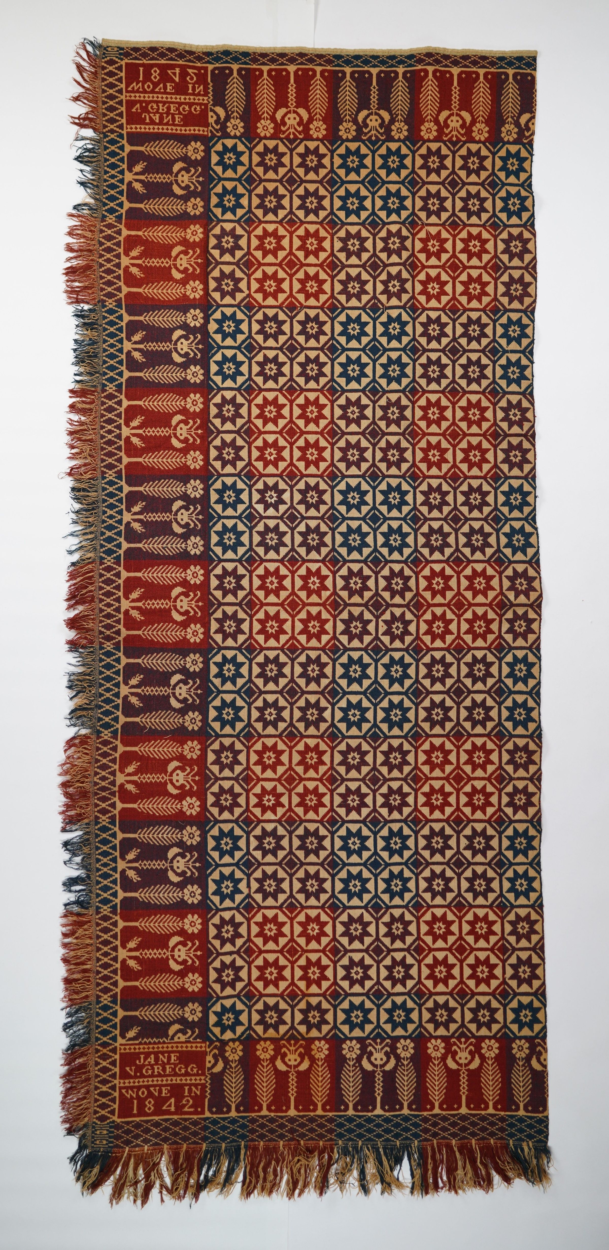 Red, navy, and natural figured doublecloth coverlet with border on three sides and self-fringe on two sides. One panel. Woven for Jane V. Gregg by John Gamble in 1842 in Pennsylvania.Collection