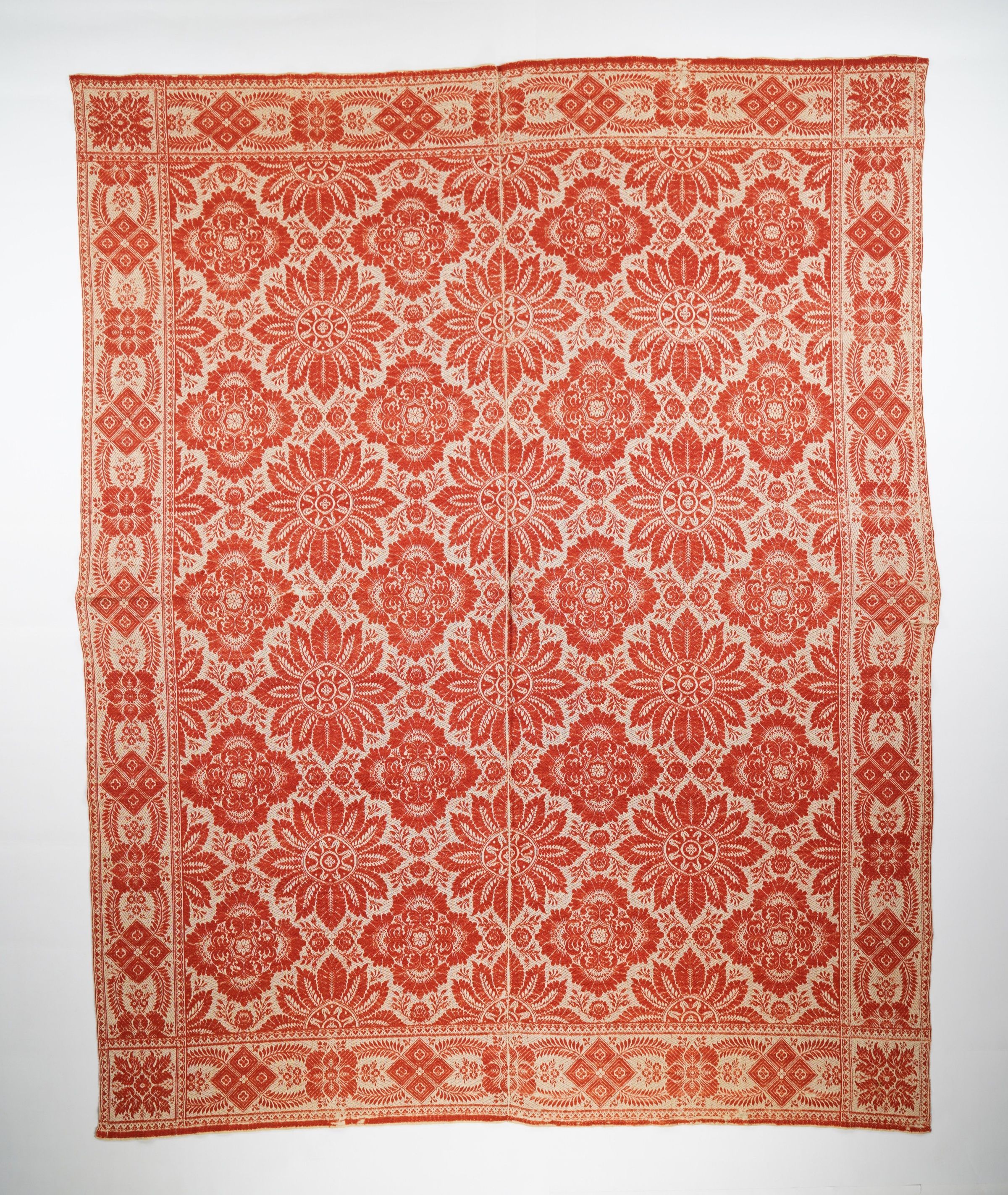 Red and natural figured damask coverlet with border on four sides. Two joined panels.Context
