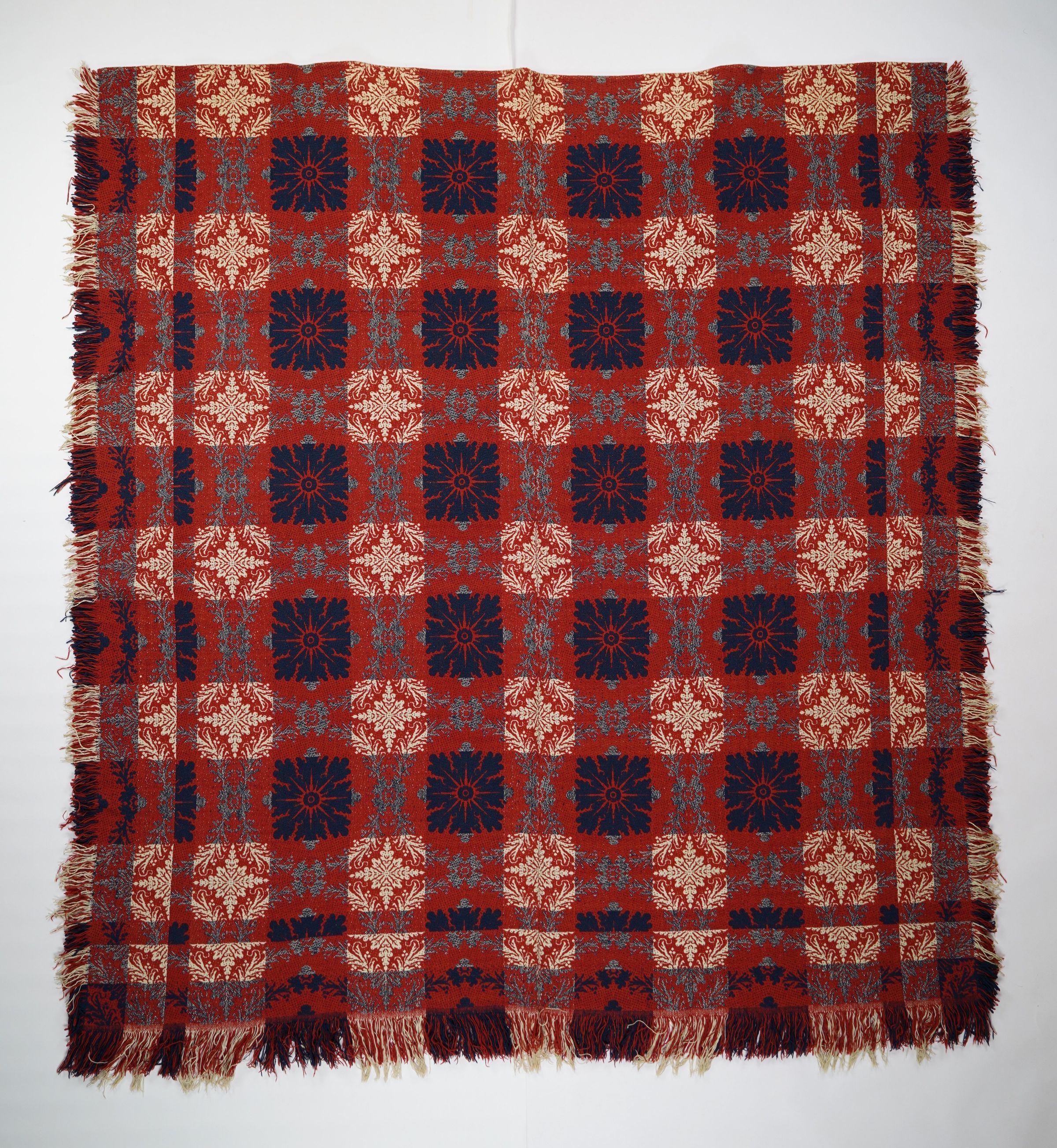 Red, navy, and natural figured double weave coverlet with border and self-fringe along three sides. Two joined panels.