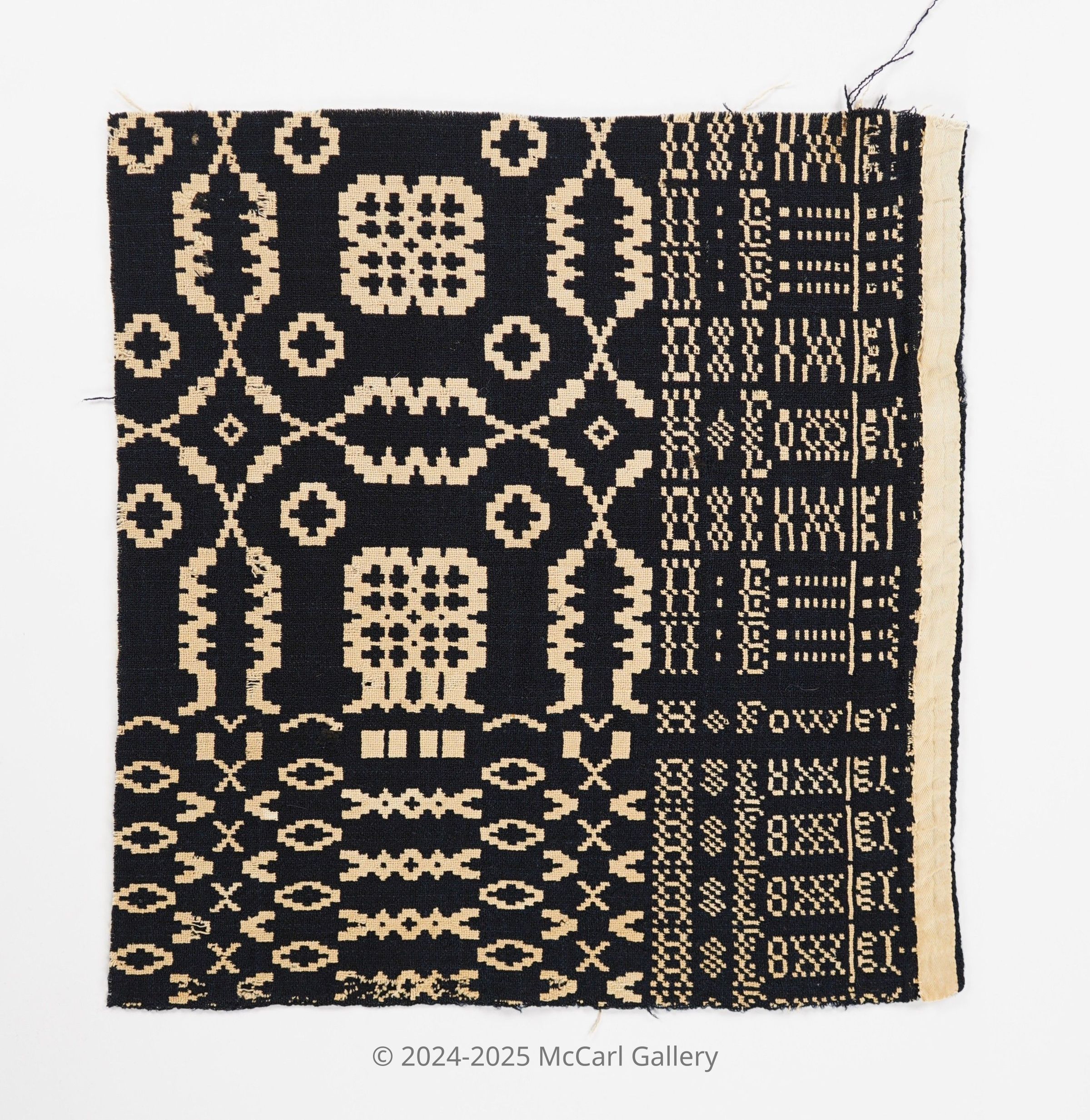 Geometric doubleweave coverlet with borders on 2 sides and no fringe. Fragment of a coverlet. Navy wool with undyed cotton. Abstract centerfield pattern; abstract border on side and bottom. Unknown weaver.Collection