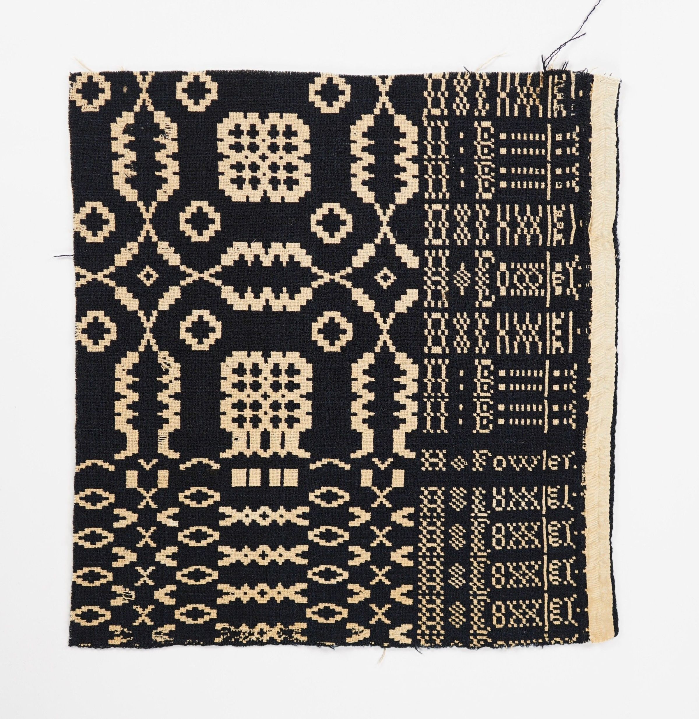 Geometric doubleweave coverlet with borders on 2 sides and no fringe. Fragment of a coverlet. Navy wool with undyed cotton. Abstract centerfield pattern; abstract border on side and bottom. Unknown weaver.Context