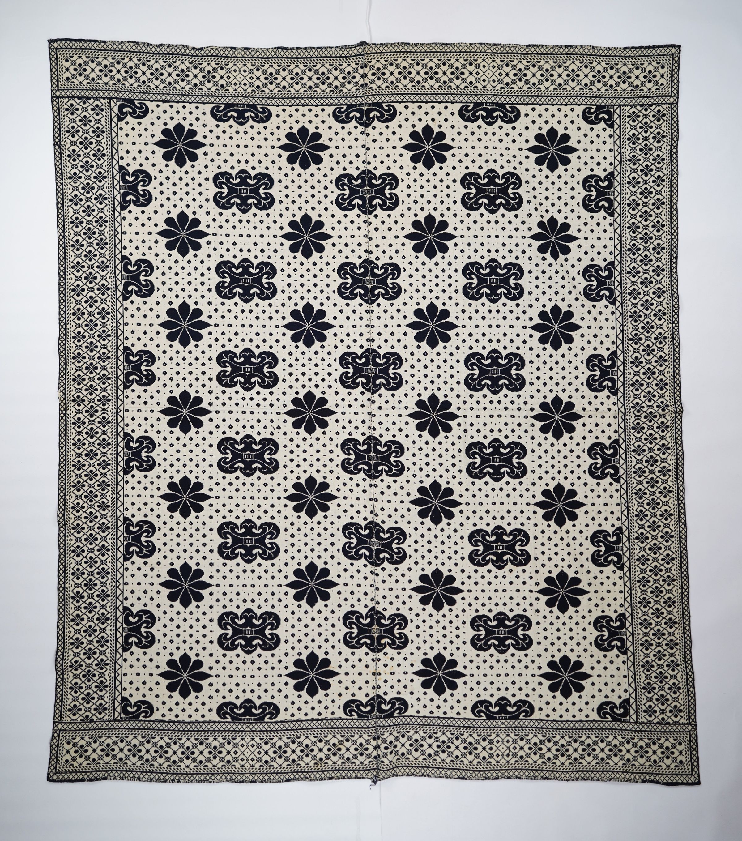 Navy and natural figured tied half doublecloth coverlet with border on four sides. Two joined panels.