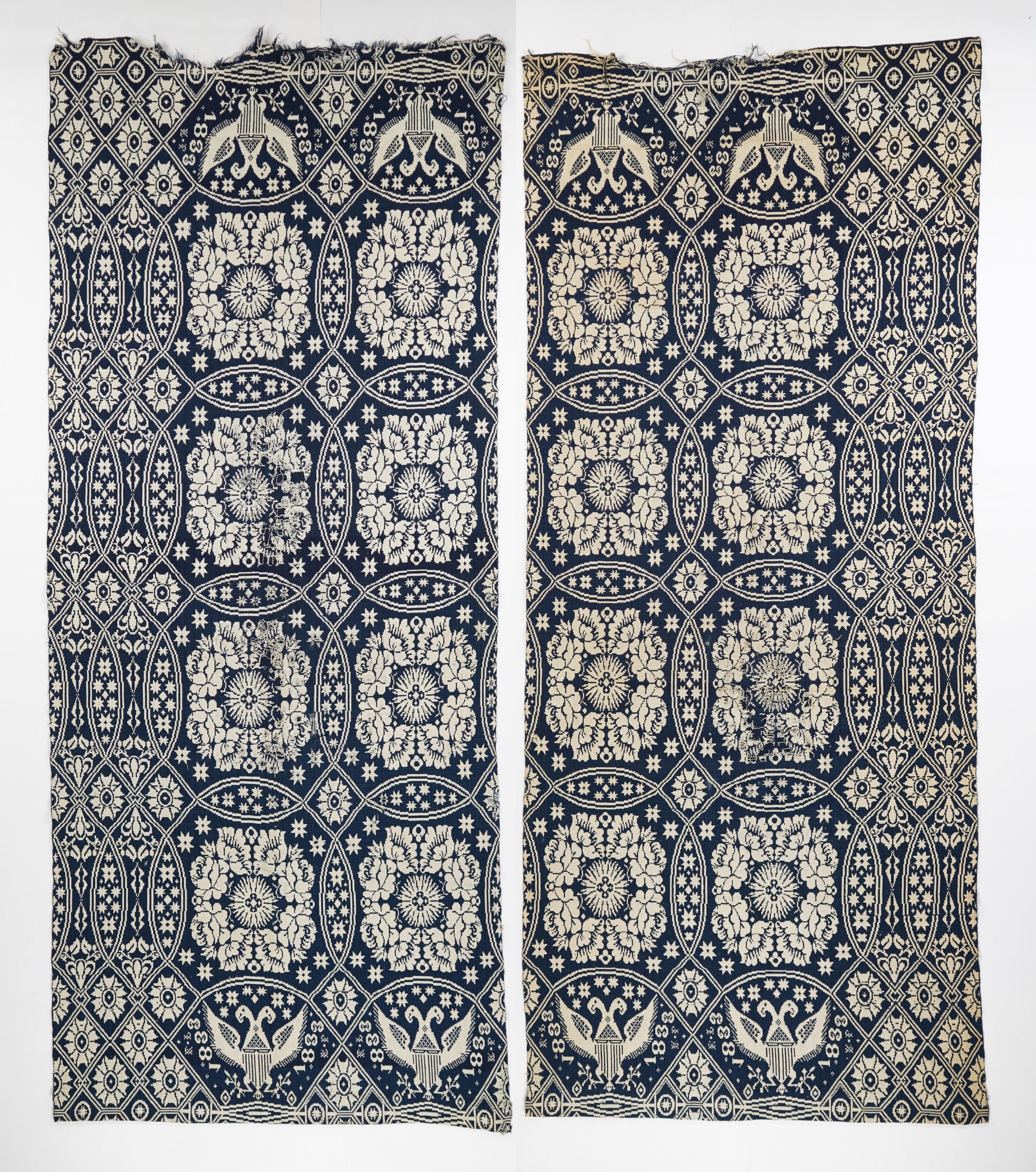 Figured and fancy doubleweave coverlet with borders on 4 sides and no fringe. Two separate panels. Navy wool with undyed cotton. Floral wreaths centerfield pattern; abstract border on sides; double headed eagle border on top and bottom. Unknown weaver in 1833.Context