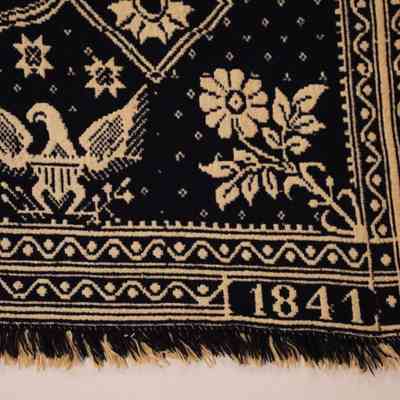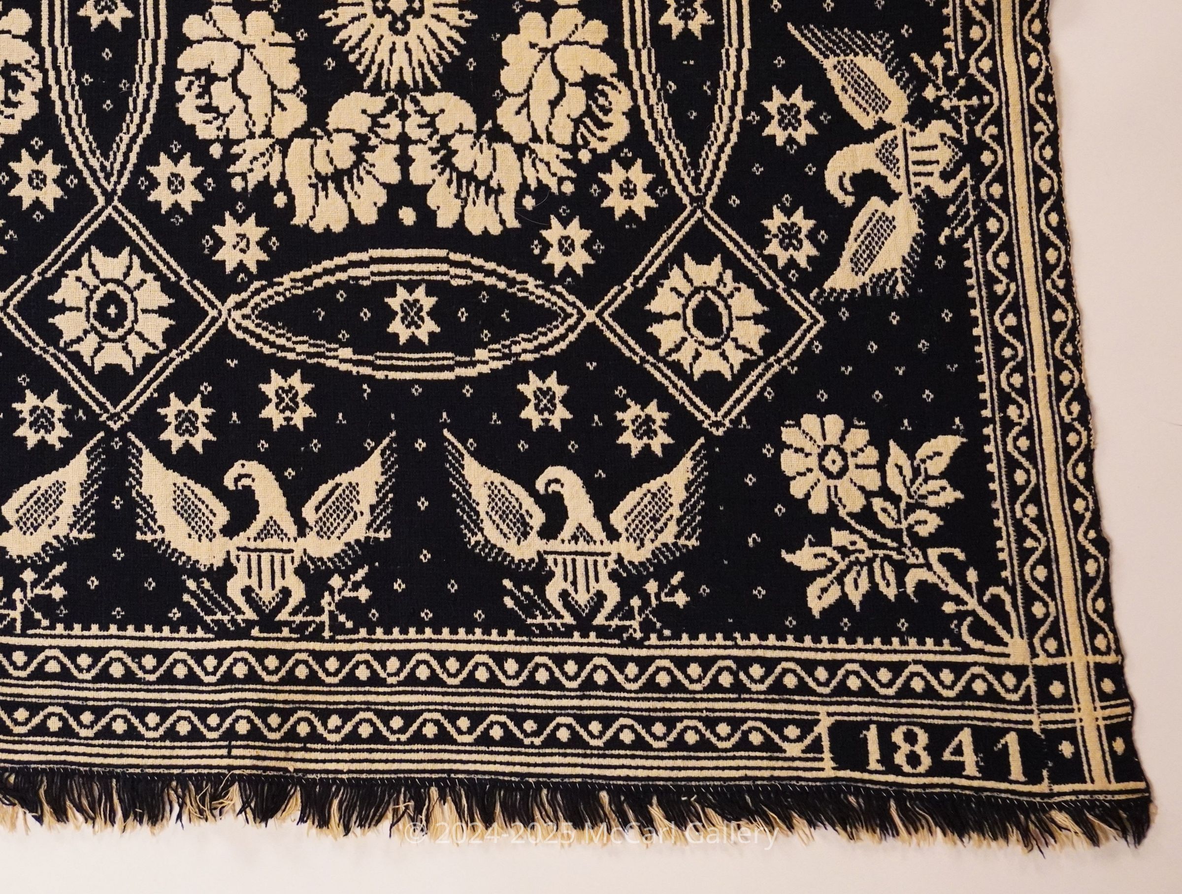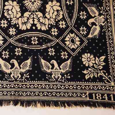 Navy and natural figured doublecloth coverlet with border on four sides. Two joined panels. Woven in 1841.Collection