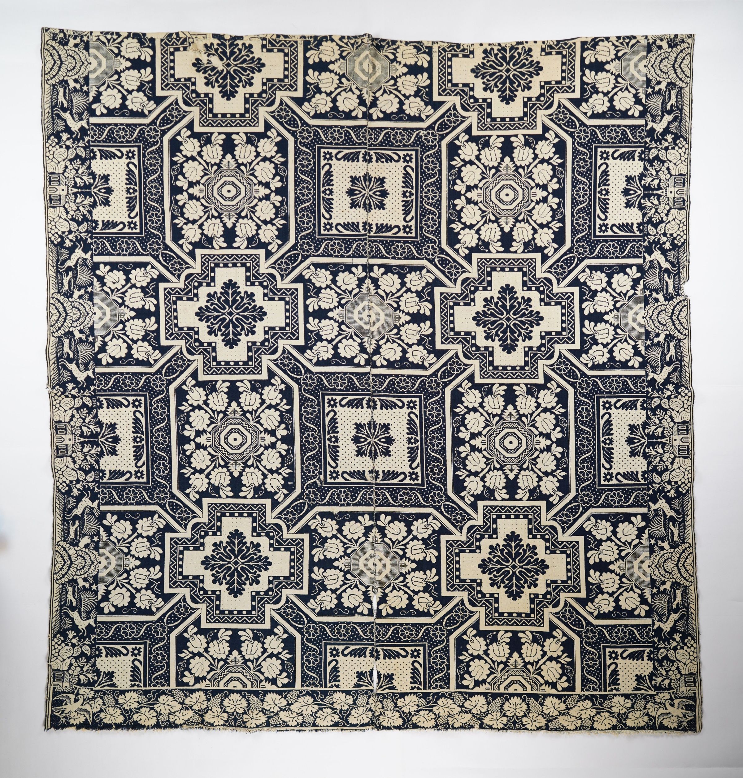 Figured and fancy doubleweave coverlet with borders on 3 sides and no fringe on. Two panels joined by a center seam. Blue wool with undyed cotton. Square floral centerfield pattern; forest church border on sides; foliage border on bottom. Woven by unknown weaver in 1856 with eagle logo in corner.Context
