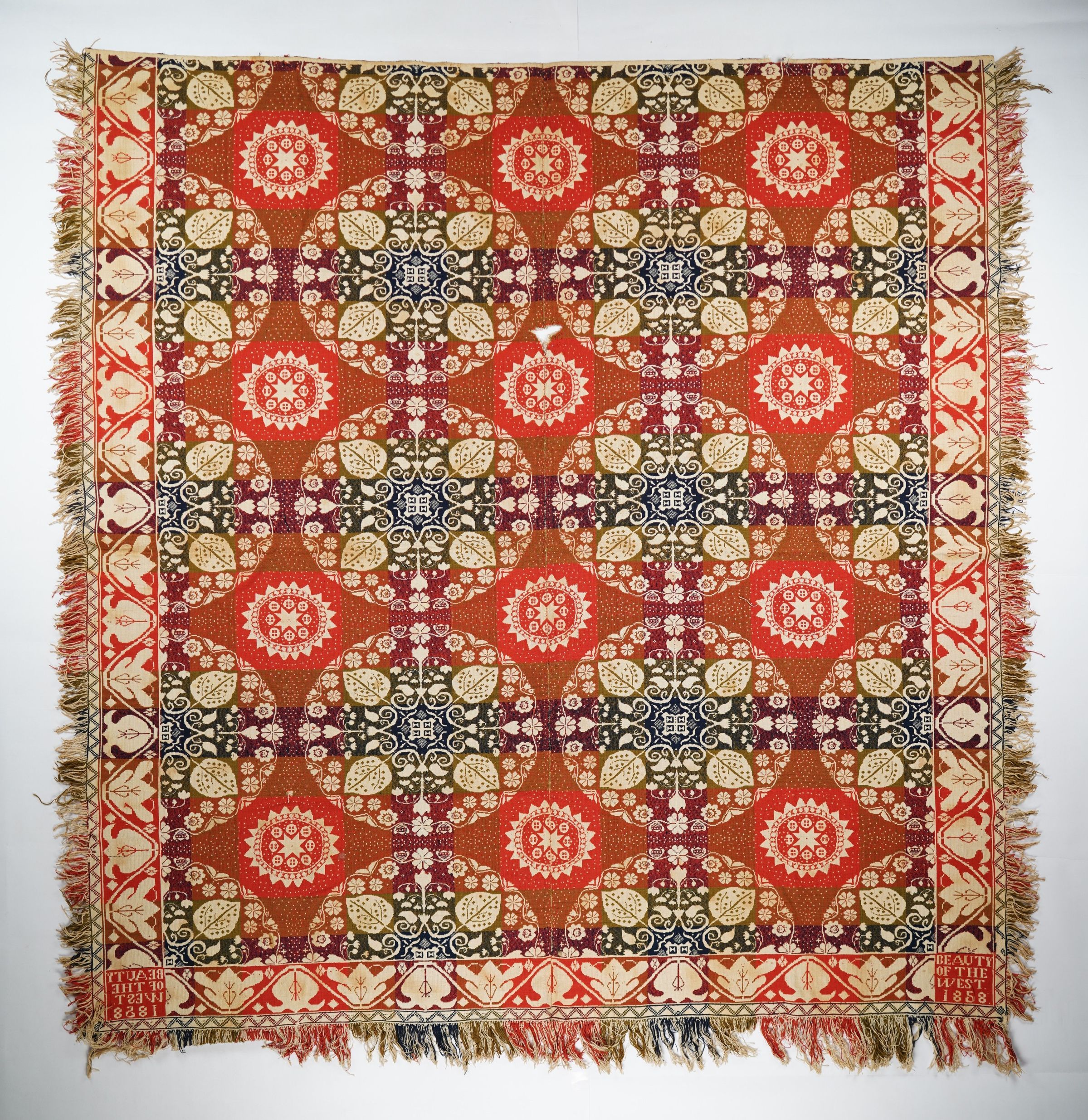 Figured and fancy doubleweave coverlet with borders on three sides and self-fringe on sides and bottom. Two panels joined by a center seam. Red, navy, and green wool with undyed cotton. Leafy medallion centerfield pattern; Leaf tulip vibe border on sides and bottom. Unknown weaver with "Beauty of the West" cornerblock.Context