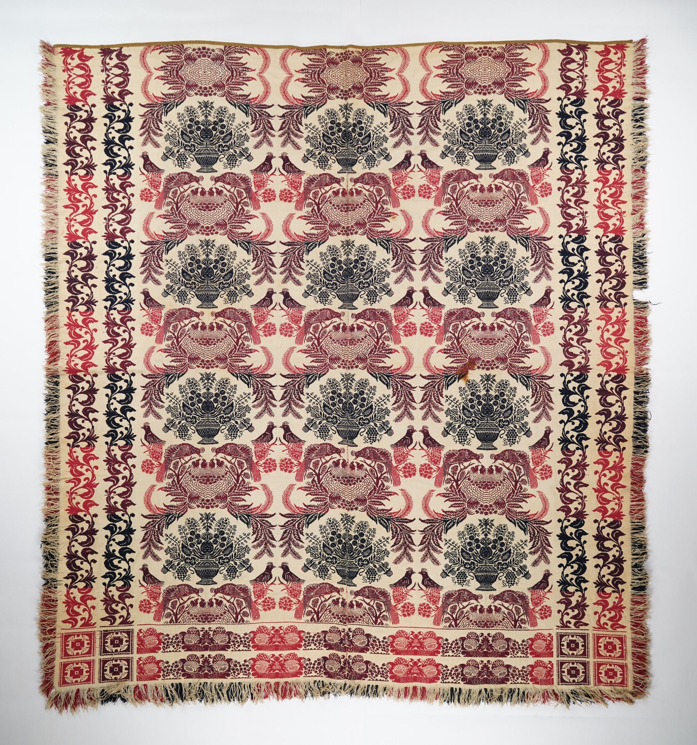 Figured and fancy doubleweave coverlet with borders on 3 sides and self-fringe on sides and bottom. Two panels joined by a center seam. Navy and red wool with undyed cotton. Bird feeding young and urn centerfield pattern; leafy border on sides; ham border on bottom. Unknown weaver.Context