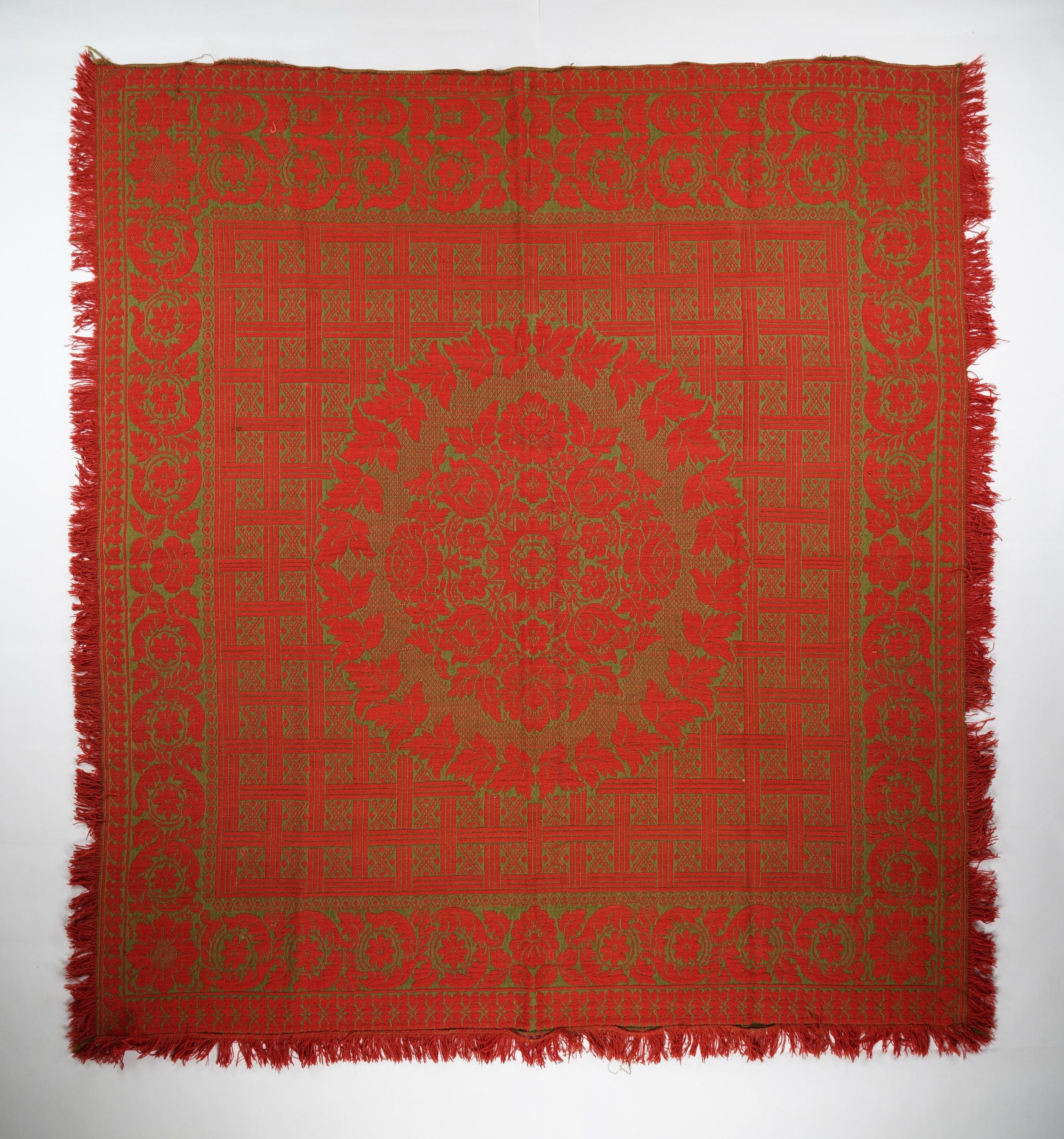 Figured and fancy doubleweave coverlet with borders on 4 sides and applied fringe on sides and bottom. Woven full-width; seamless. Red and green wool. Floral medallion centerfield pattern; floral border on all sides. Unknown weaver.Context