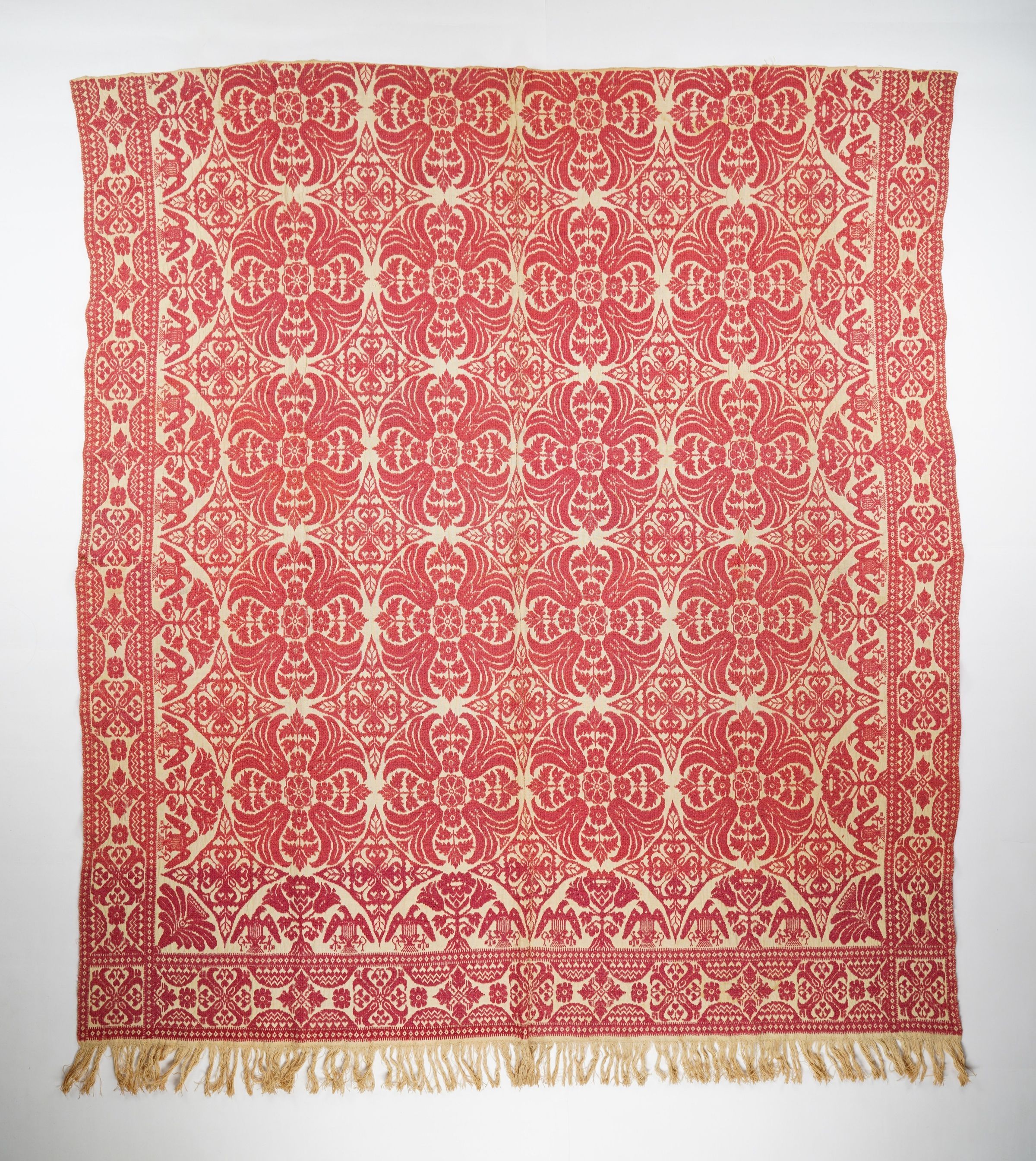Figured and fancy doubleweave coverlet with borders on 3 sides and applied fringe on the bottom. Two panels joined by a center seam. Red wool with undyed cotton. Floral medallion centerfield pattern; abstract floral border on sides and bottom. Unknown weaver.Context
