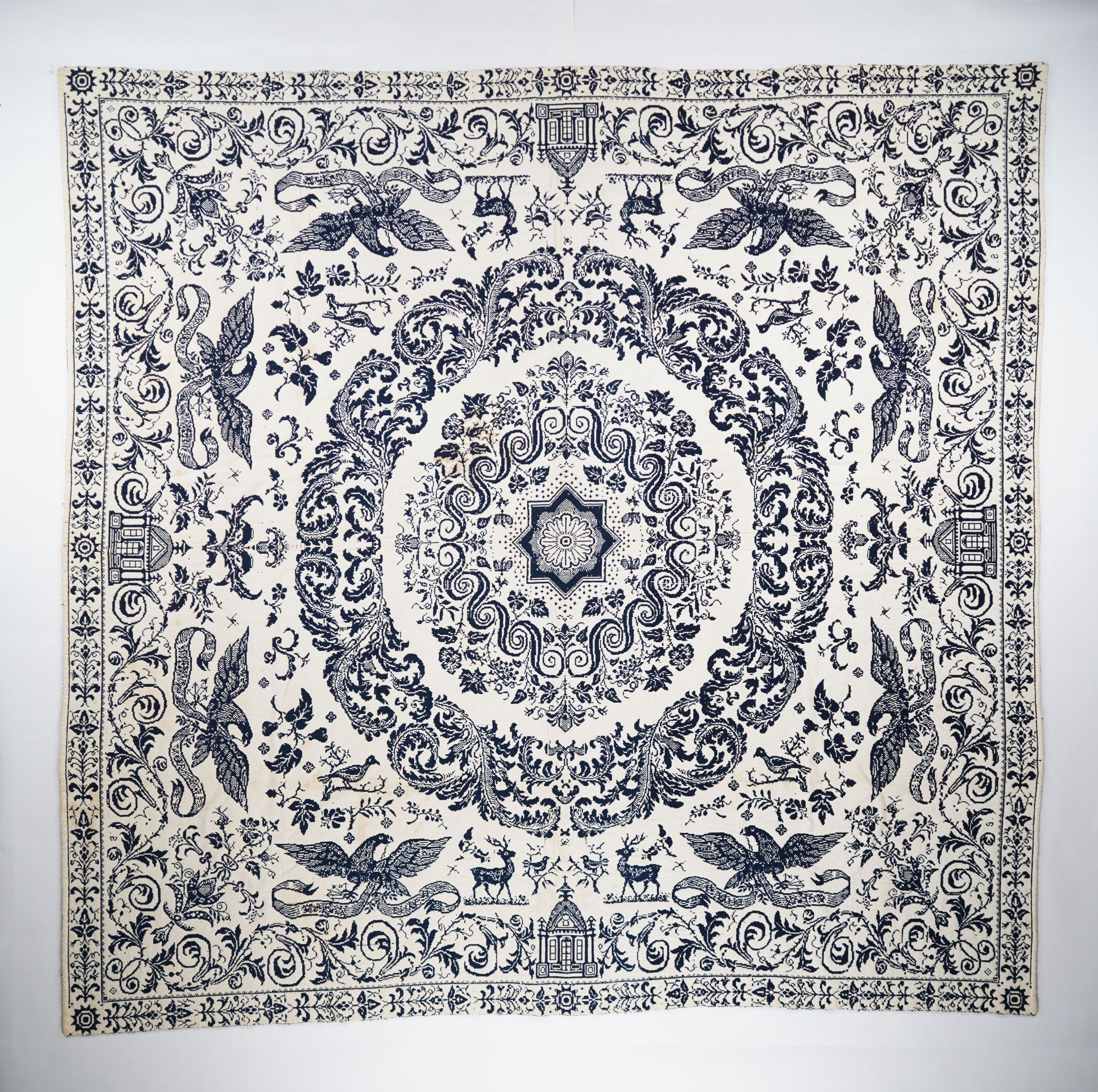 Figured and fancy doubleweave coverlet with borders on 4 sides and no fringe. Woven full-width; seamless. Navy wool with undyed cotton. Leafy medallion and eagles centerfield pattern; floral border on all sides. Unknown weaver.Context