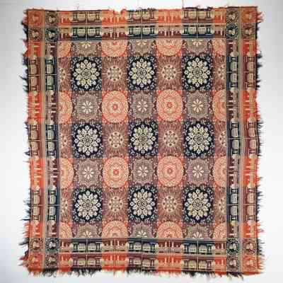 Figured and fancy doubleweave coverlet with borders on 4 sides and self-fringe on sides and bottom. Two panels joined by a center seam. Navy and red wool with undyed cotton. Leafy medallions centerfield pattern; train border on all sides. Unknown weaver with "Hempfield Railroad" cornerblock.Context